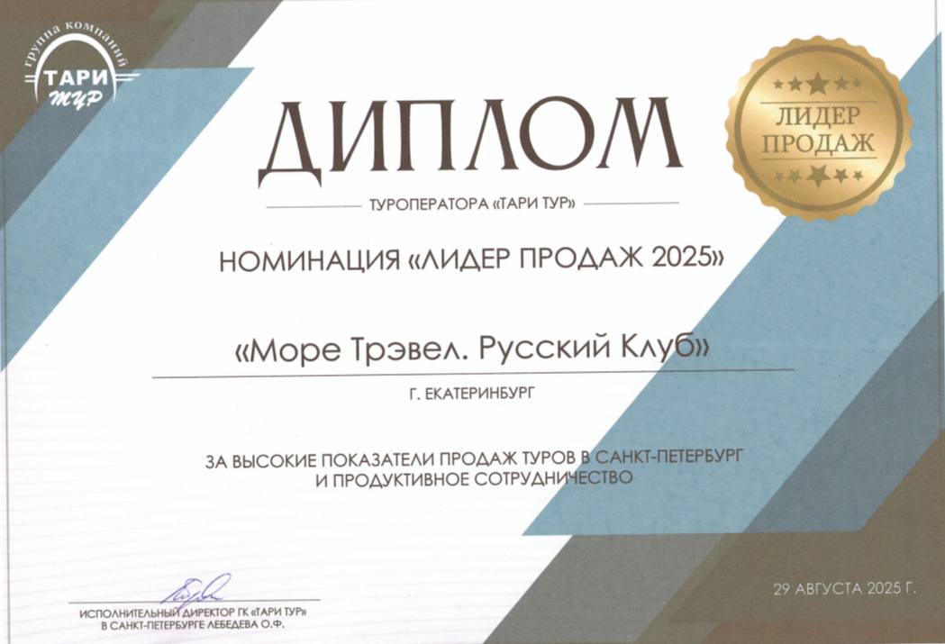 Более 20 лет «Море Трэвел» занимает одну из лидирующих позиций в Уральском регионе по продажам российских экскурсионных и пляжных направлений: Калининград, Санкт-Петербург, Москва, Казань, Сочи, Крым, Анапа, Геленджик, Мин.Воды, Пятигорск и многих других дестинаций.