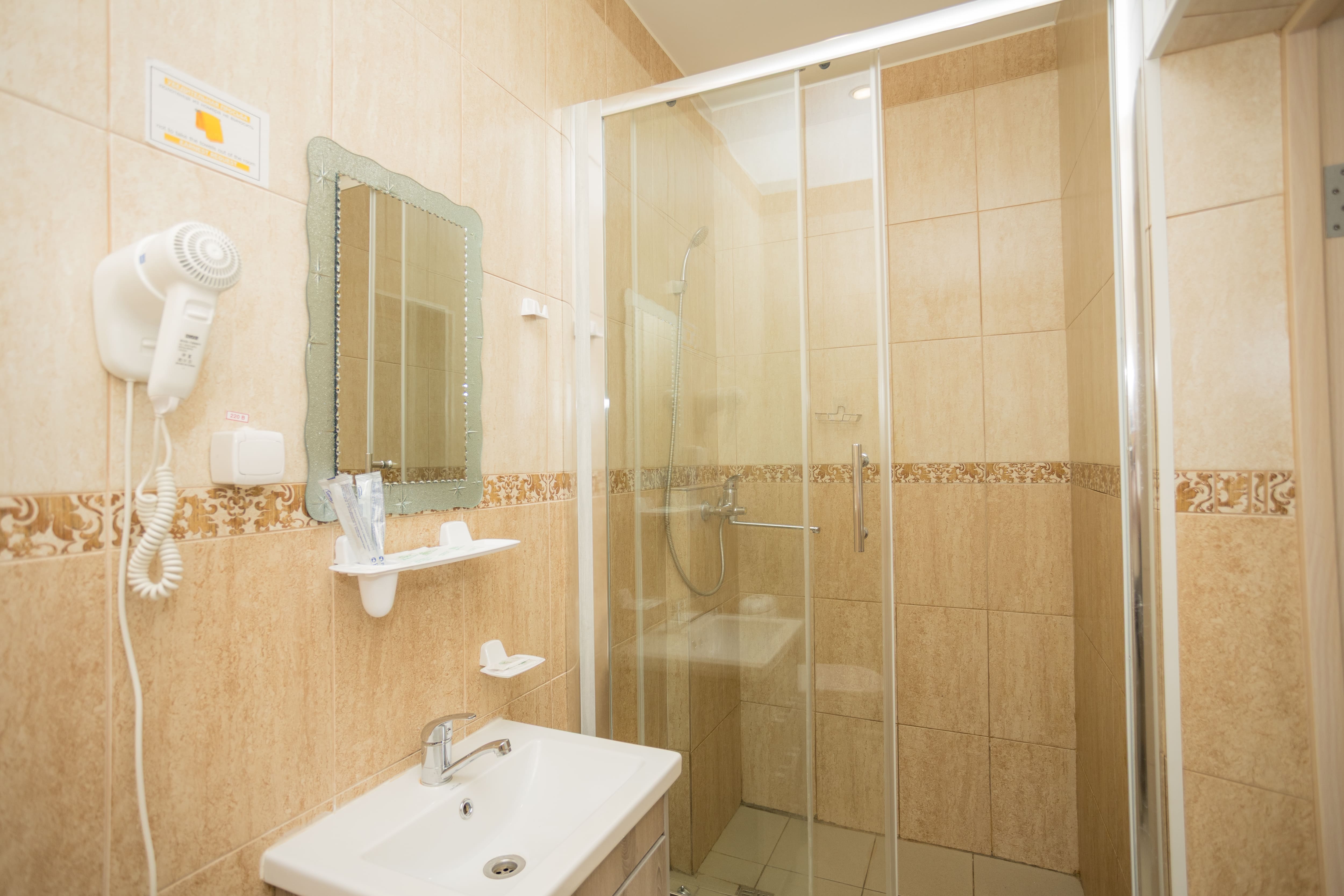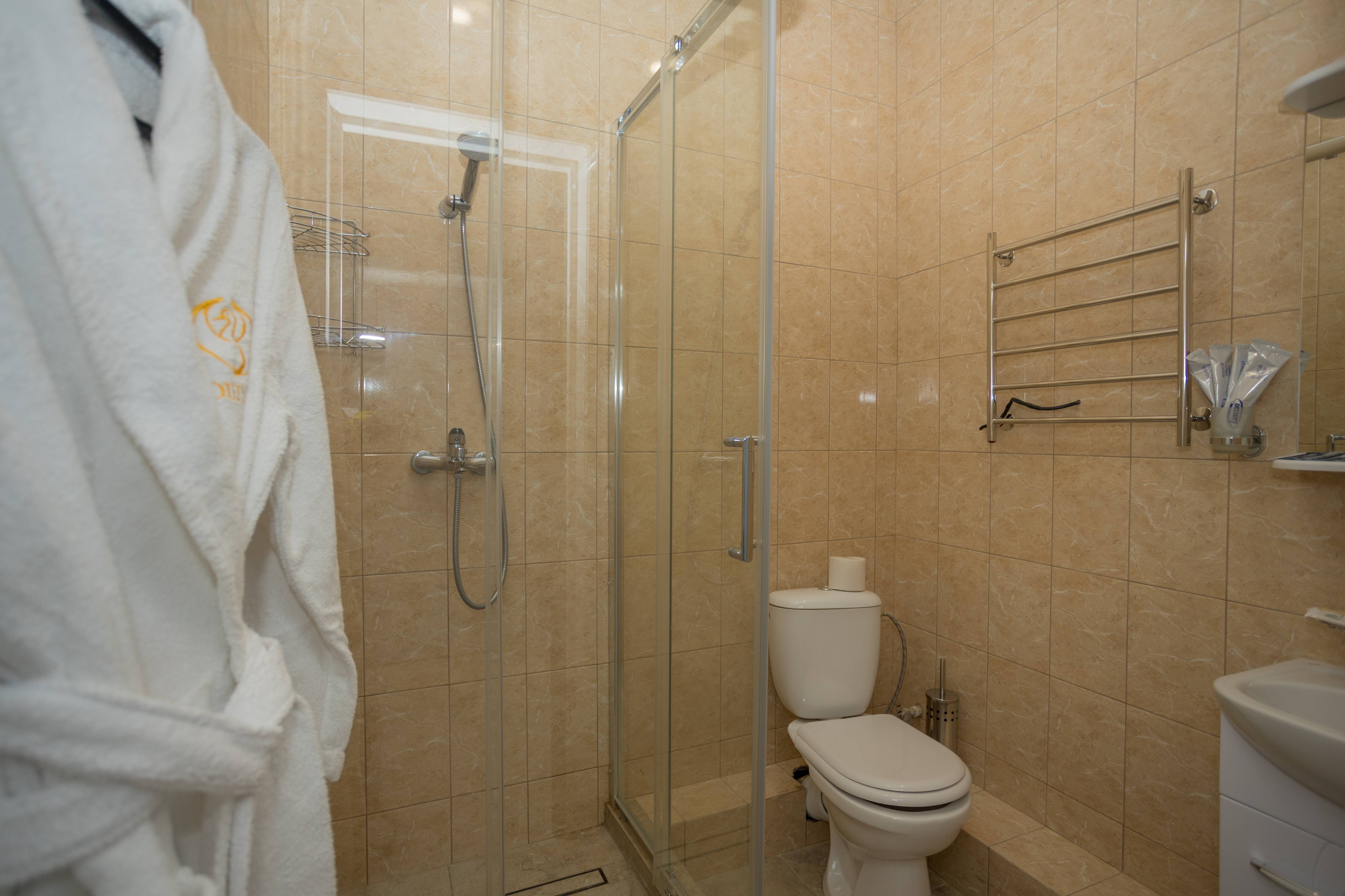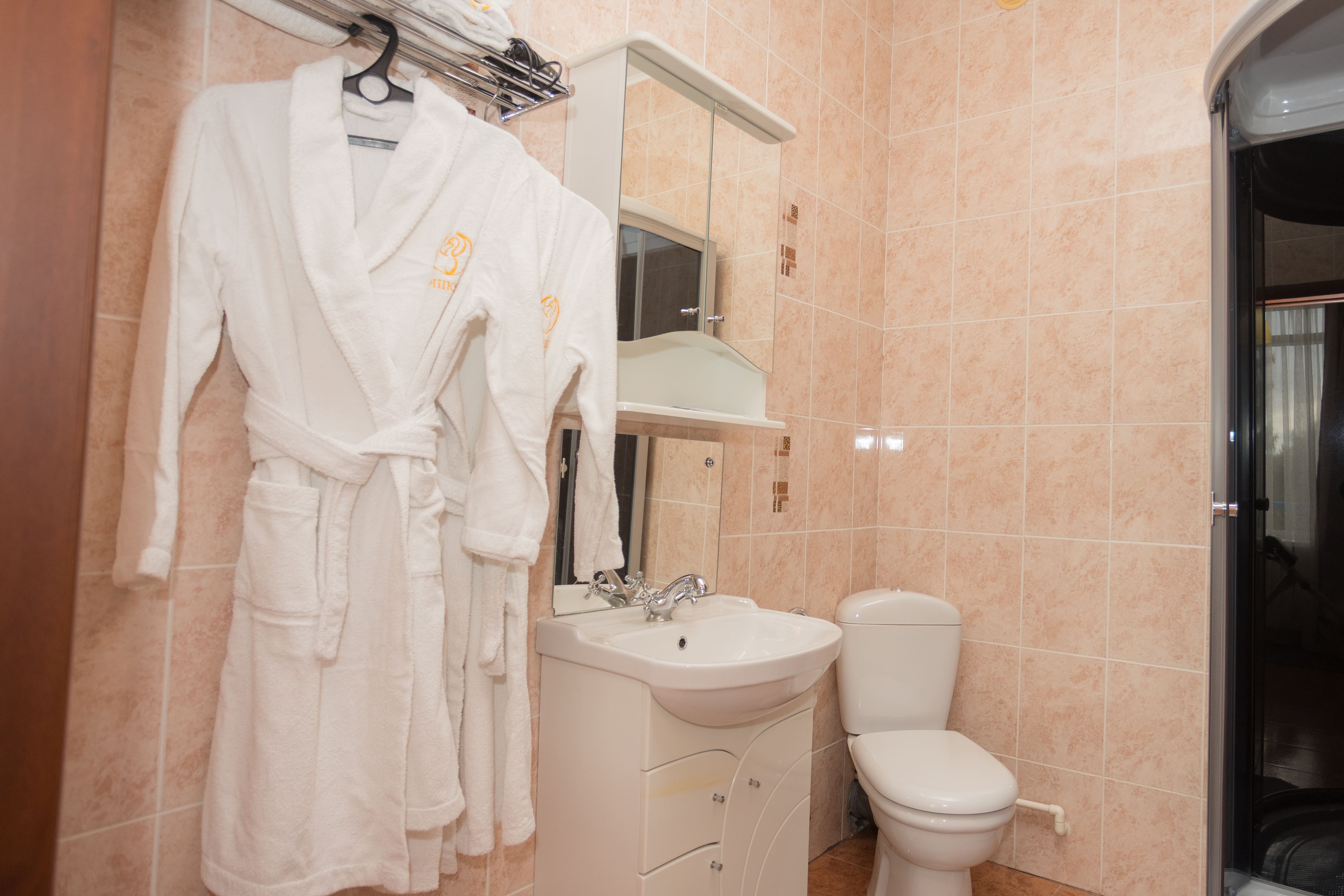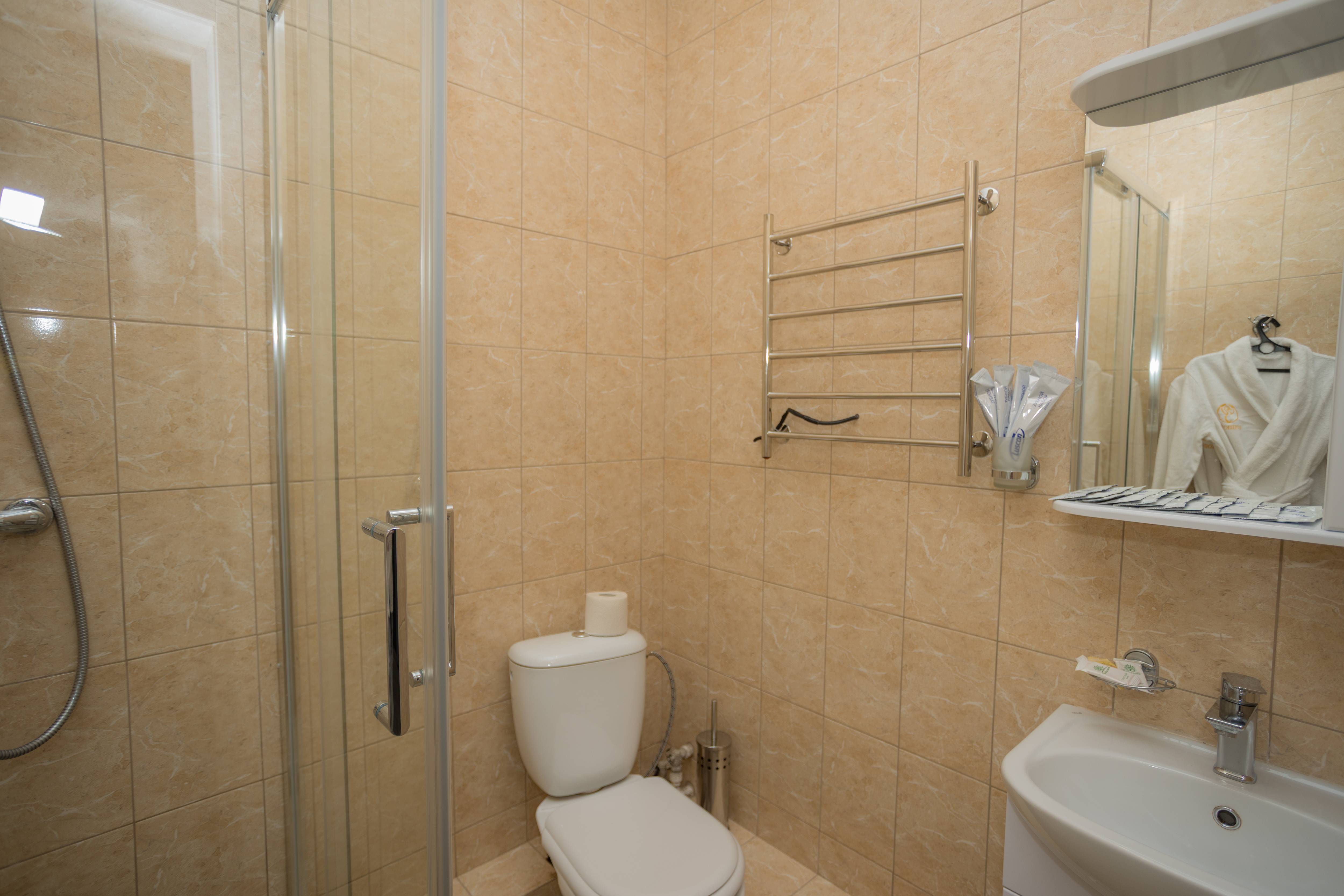 с душевой кабиной: ; тапочки: ; туалетные принадлежности: ; фен: ; халат: ;