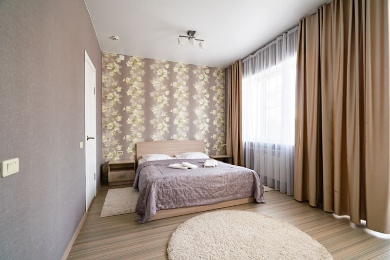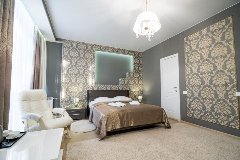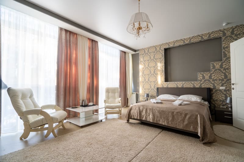 кровать двуспальная: ; прикроватные тумбочки: ; столик журнальный: ; стулья: ; шкаф: ;