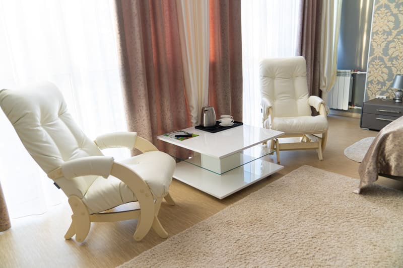 кресла: ; кровать двуспальная: ; прикроватные тумбочки: ; столик журнальный: ; стол обеденный: ; стулья: ; шкаф: ;