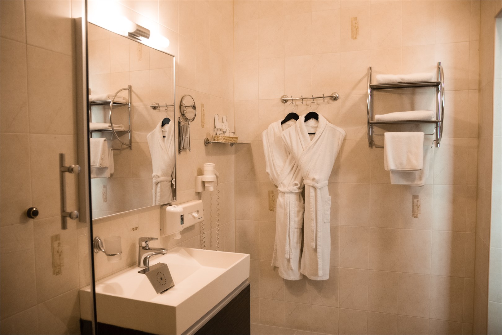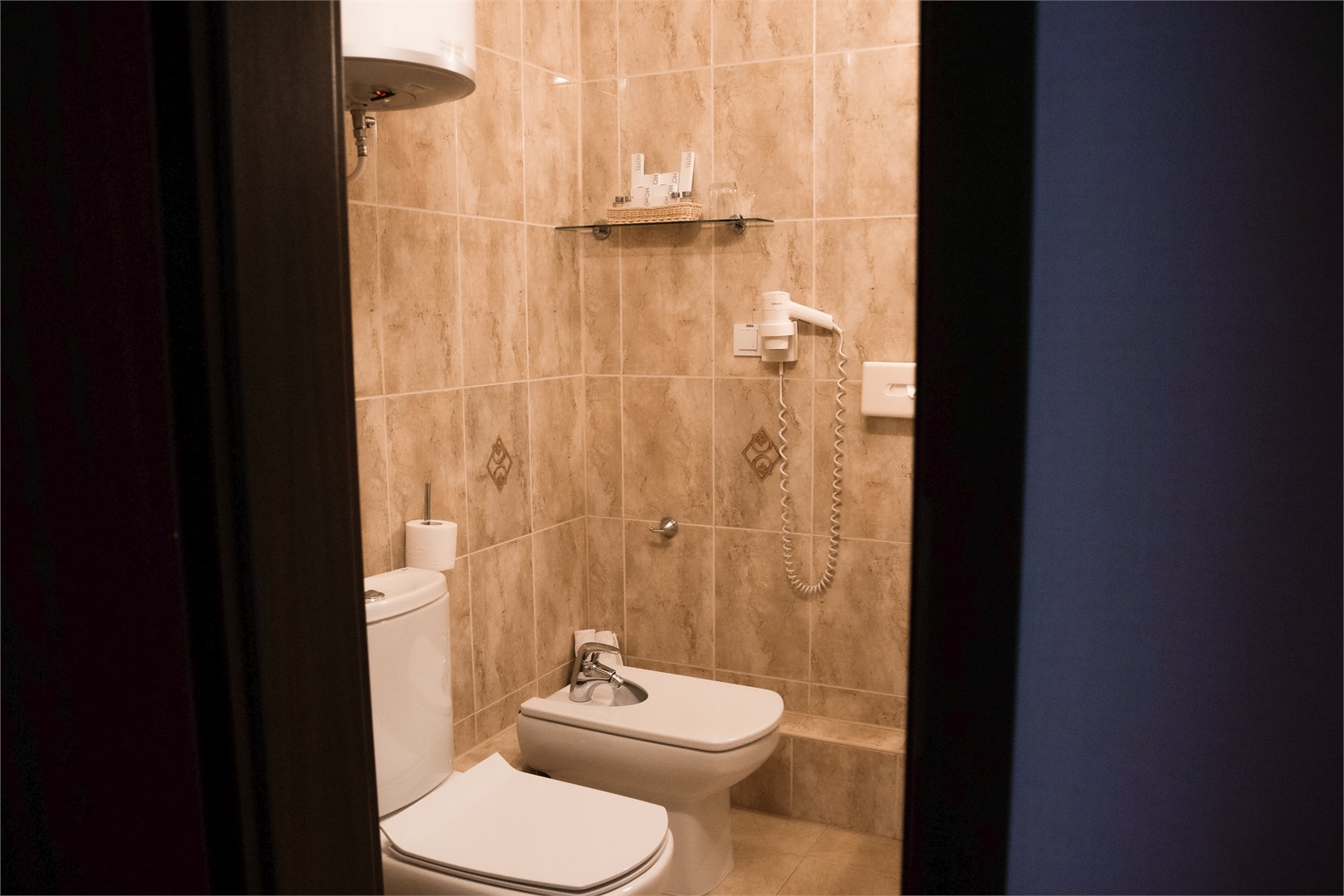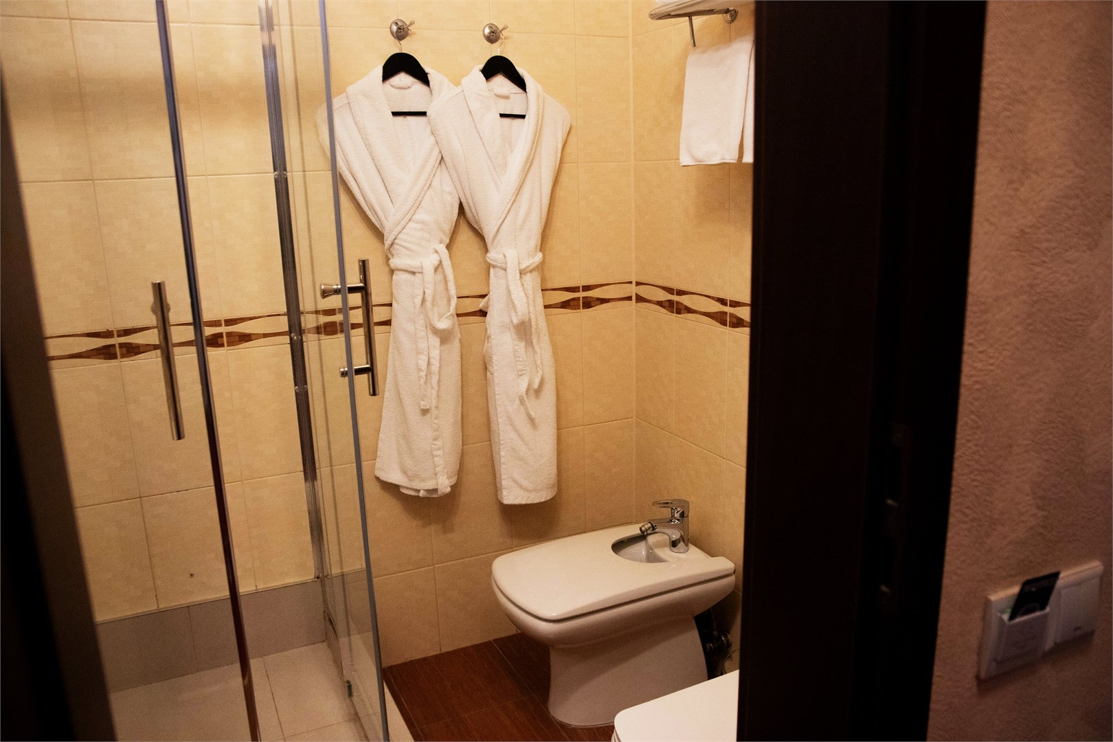 биде: ; с ванной или душевой кабиной: ; тапочки: ; туалетные принадлежности: ; фен: ; халат: ;