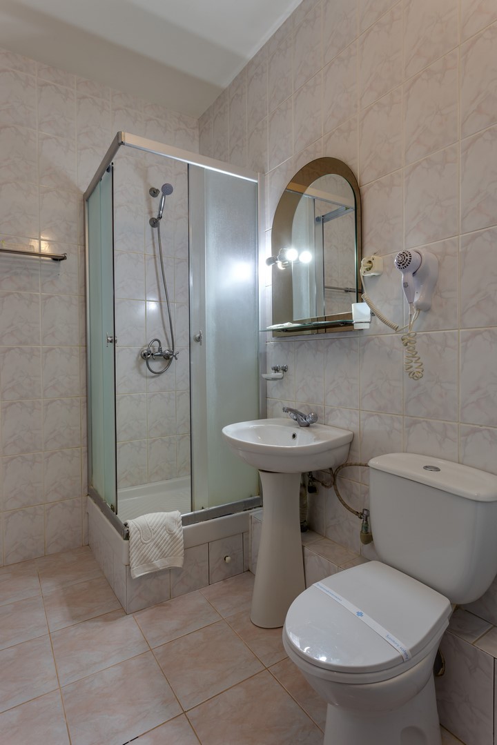 с душевой кабиной; туалетные принадлежности; фен;