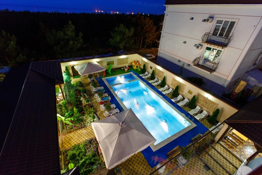 На территории разбит зеленый двор, в распоряжении гостей просторный 14-метровый бассейн с подогревом и детской зоной и кафе. Автовладельцы смогут оставить машину на парковке рядом с гостевым домом.