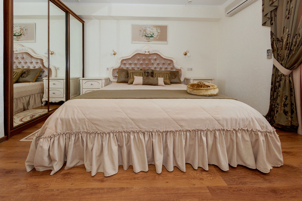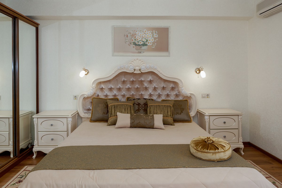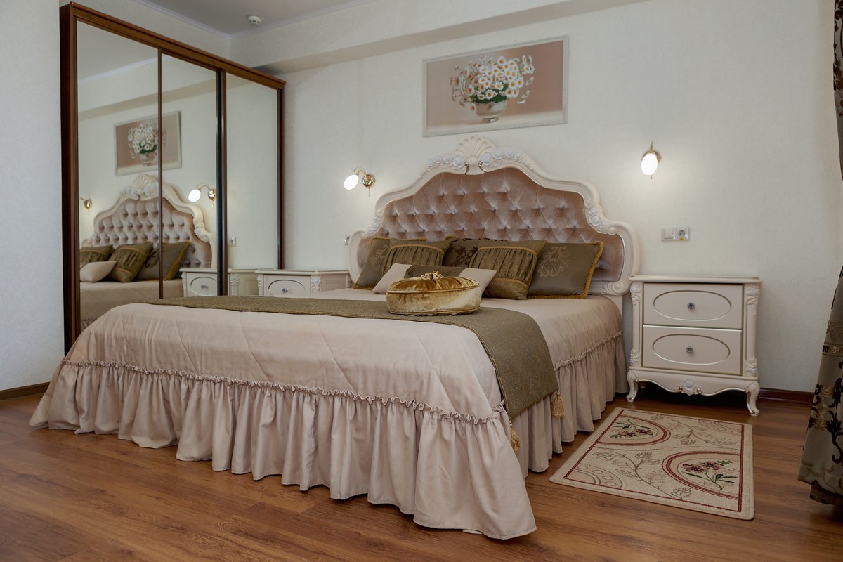 диван: ; кресла: ; кровать двуспальная: ; прикроватные тумбочки: ; стол: ; стулья: ; шкаф: ;