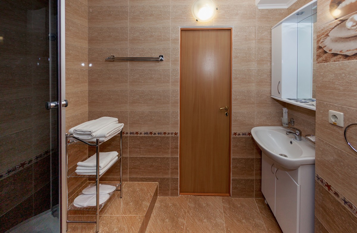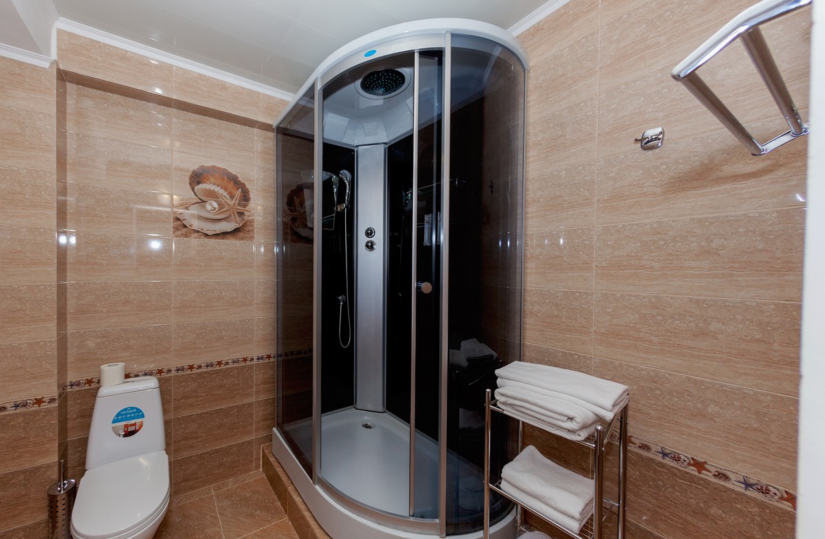 с душевой кабиной: ; тапочки: ; туалетные принадлежности: ; фен: ; халат: ;