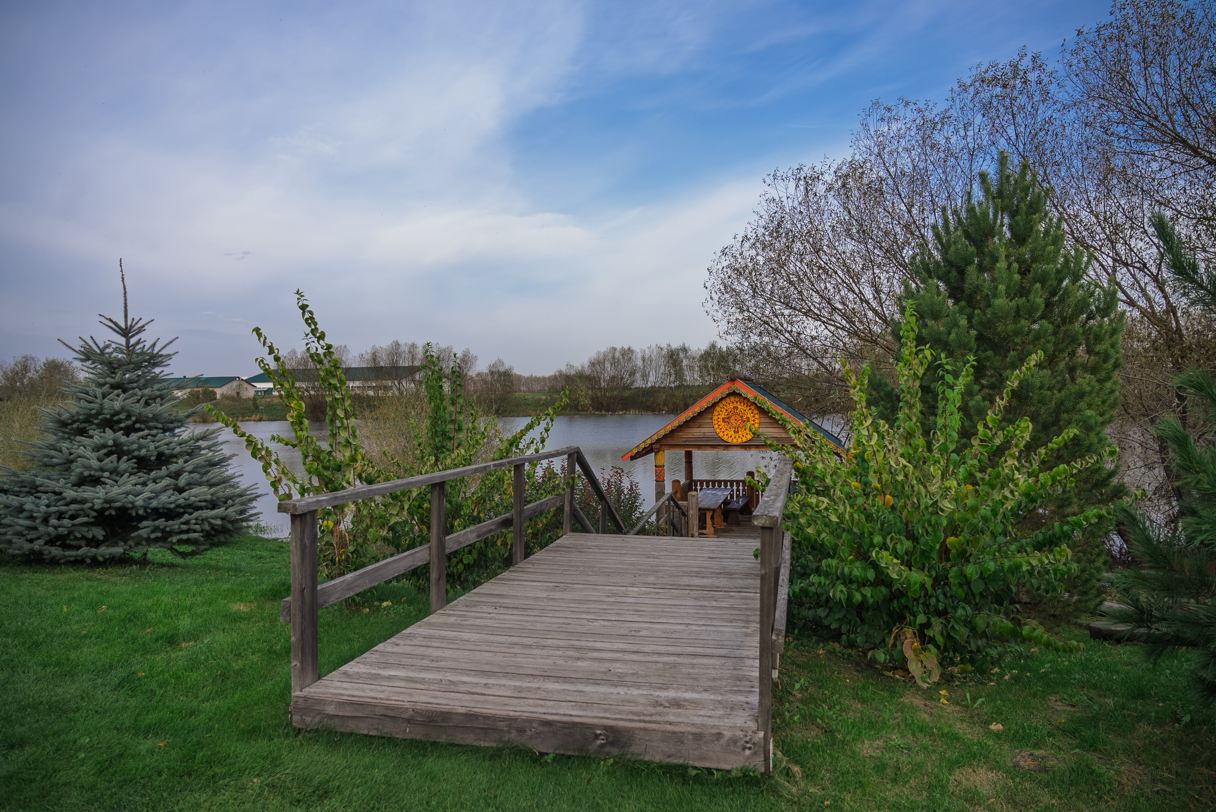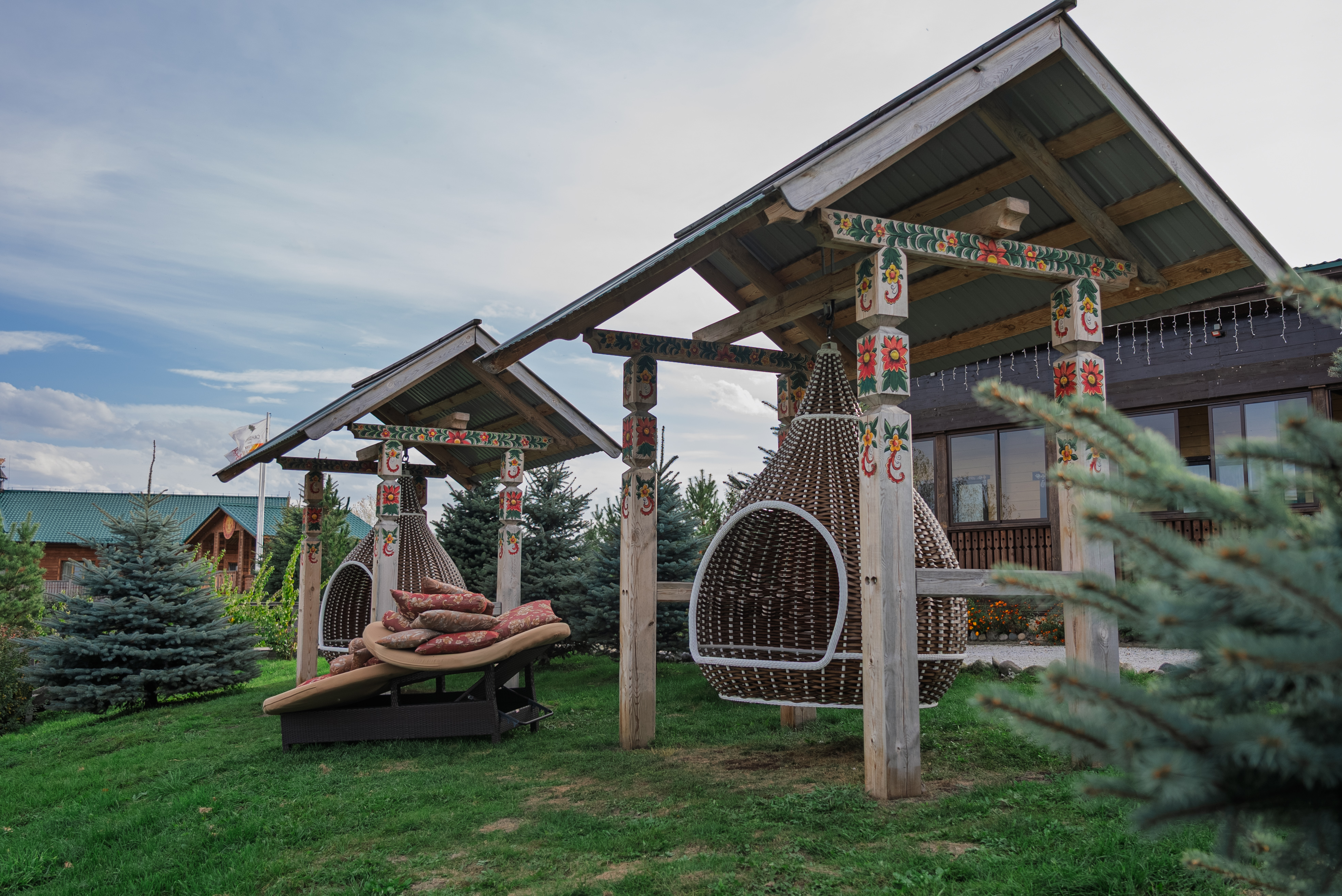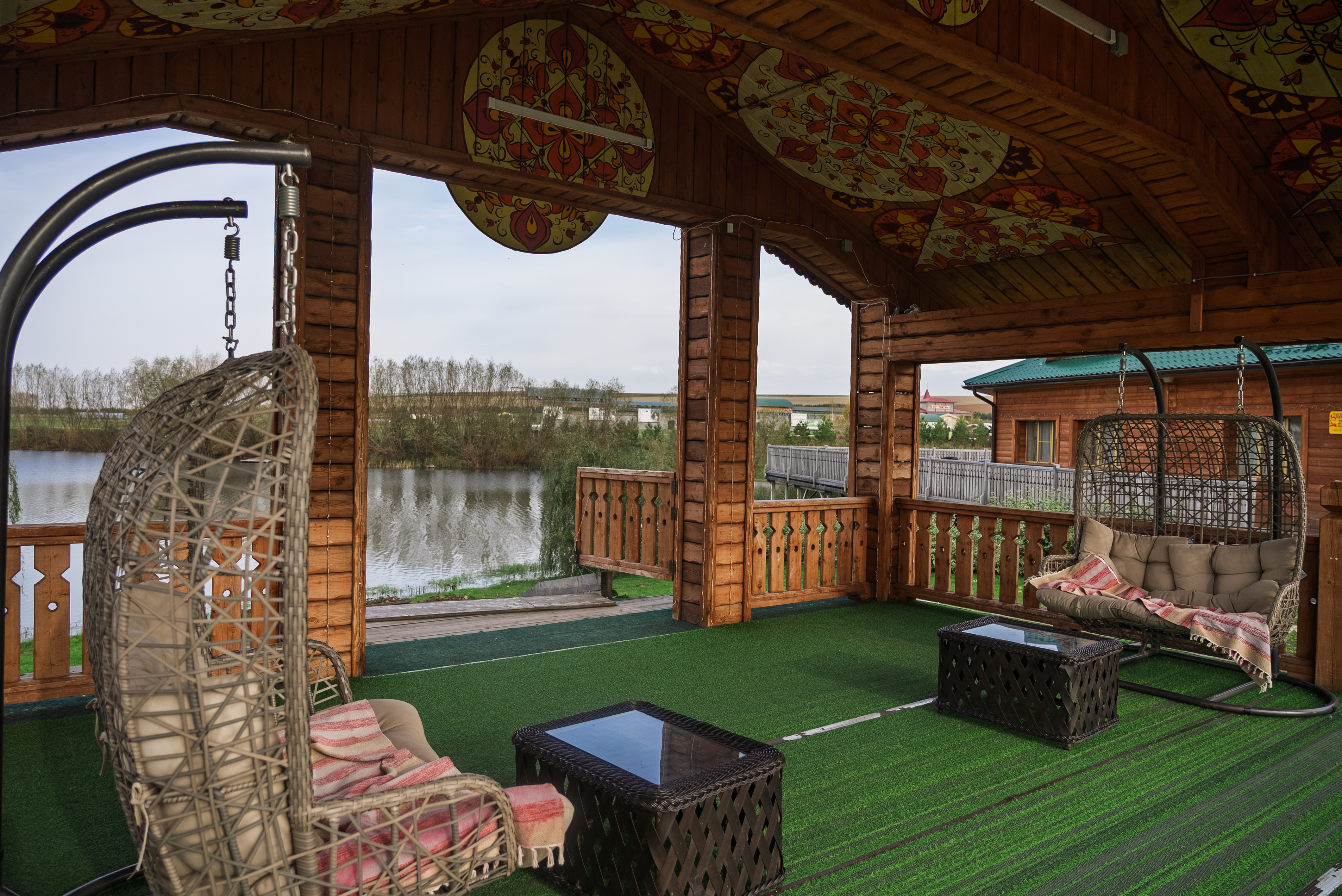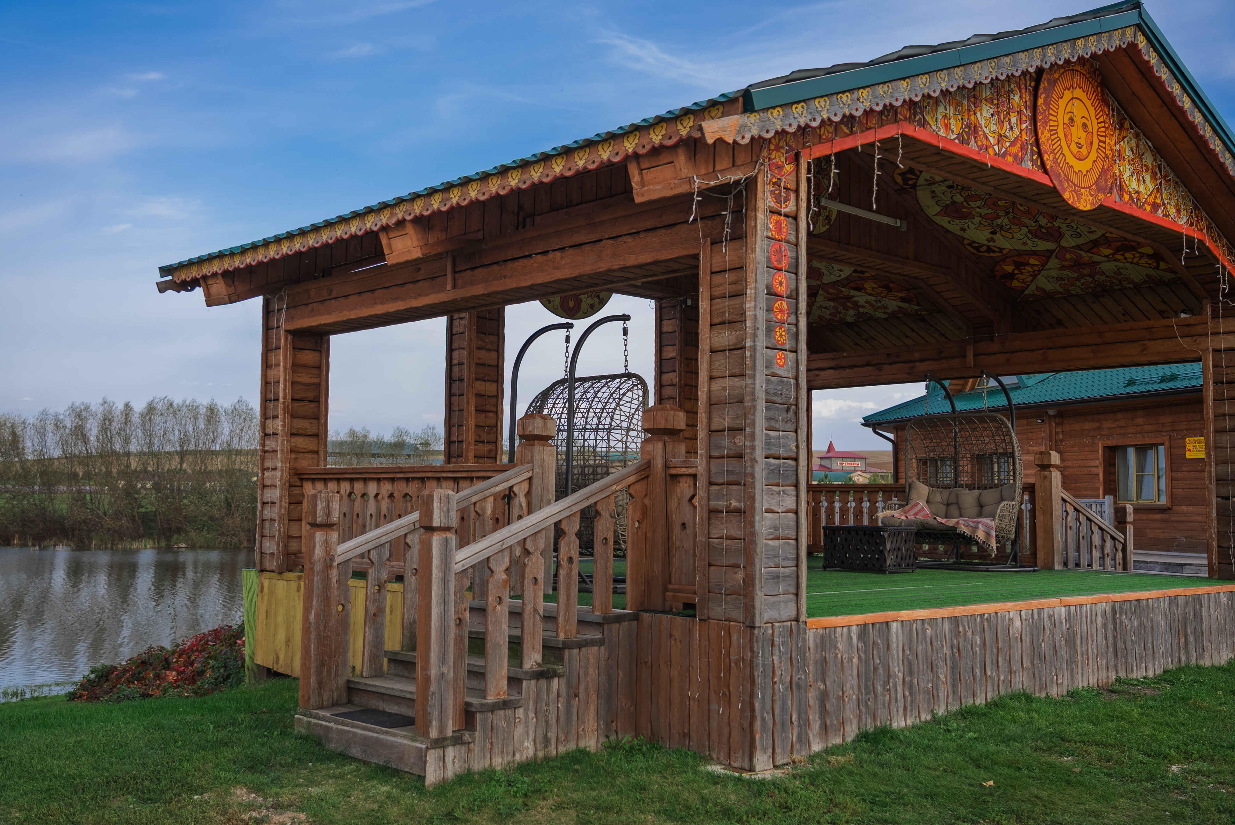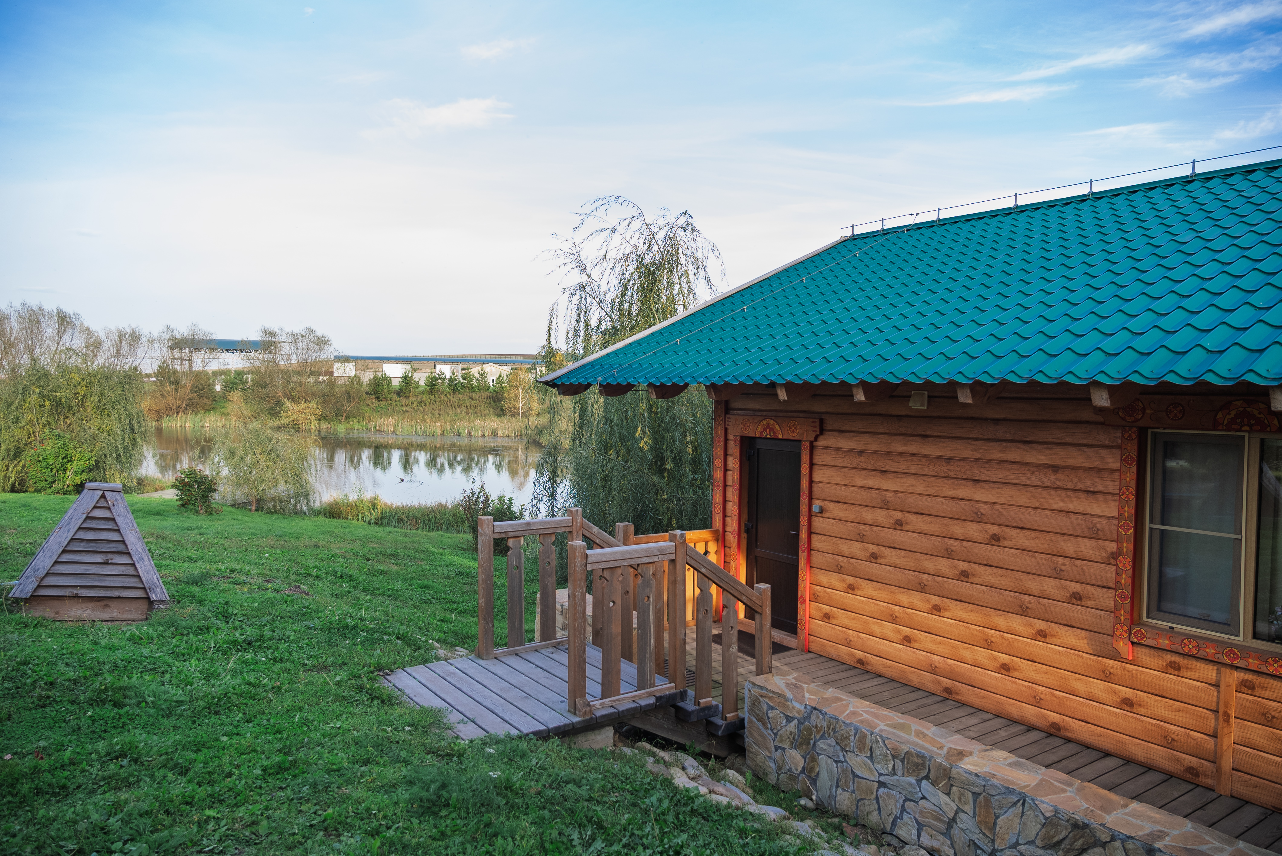 Территория комплекса раскинулась вдоль берега одного из трех искусственных озер, занимая площадь 2 гектара. Для размещения предусмотрено три одноэтажных корпуса из кедра с отдельным входом и верандой. Весь комплекс, включая номерной фонд, выполнен в традиционном русском стиле. К услугам отдыхающих 14 благоустроенных номеров, в каждом из которых есть мини-кухня, оборудованная холодильником, микроволновой печью, посудой, чайником и обеденной мебелью, а также телевизор, фен, туалетные принадлежности и халаты. Ароматная древесина домов, традиционная ручная роспись, авторский текстиль, лоскутные теплые одеяла и природная тишина на берегу озера делают отдых максимально комфортным.