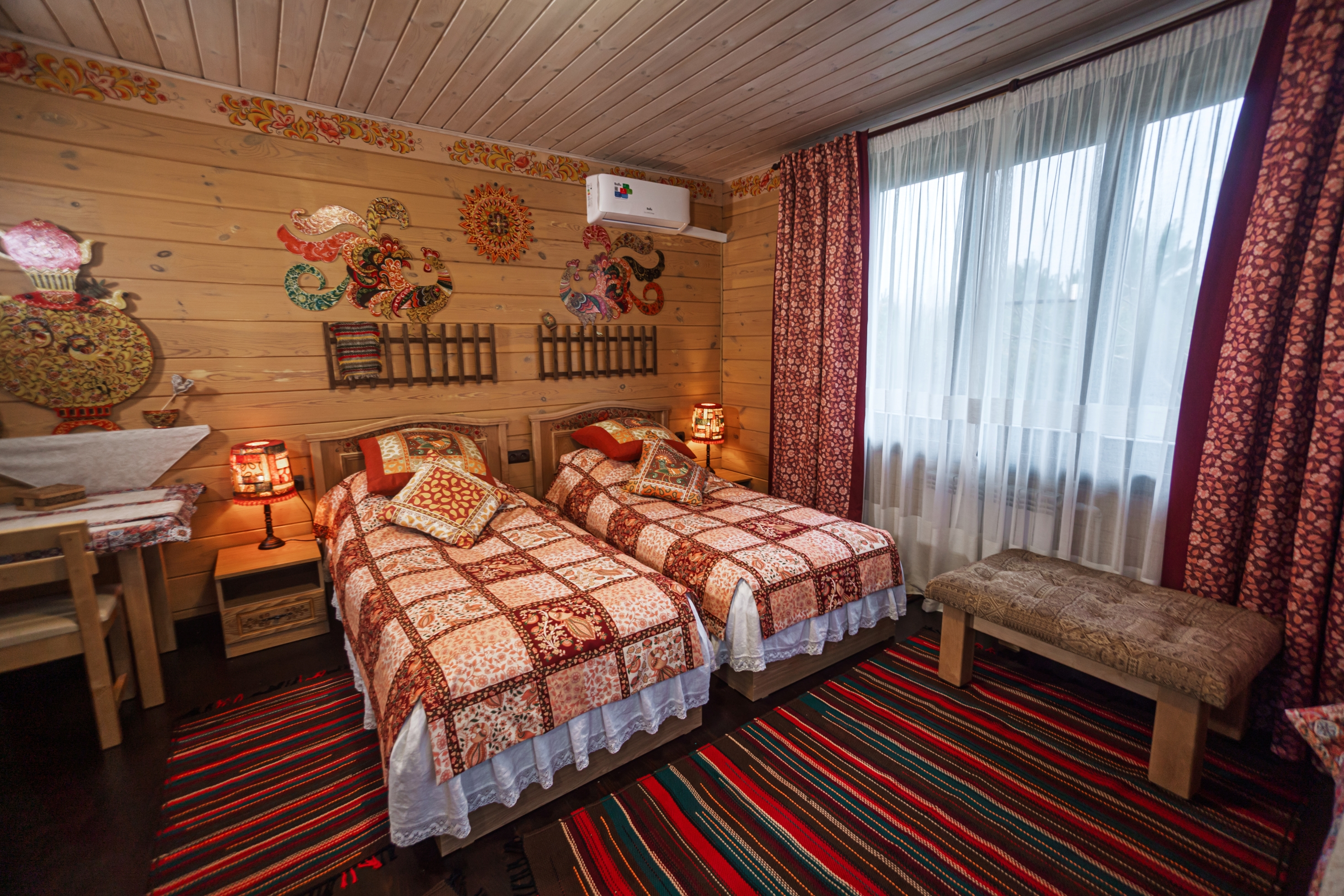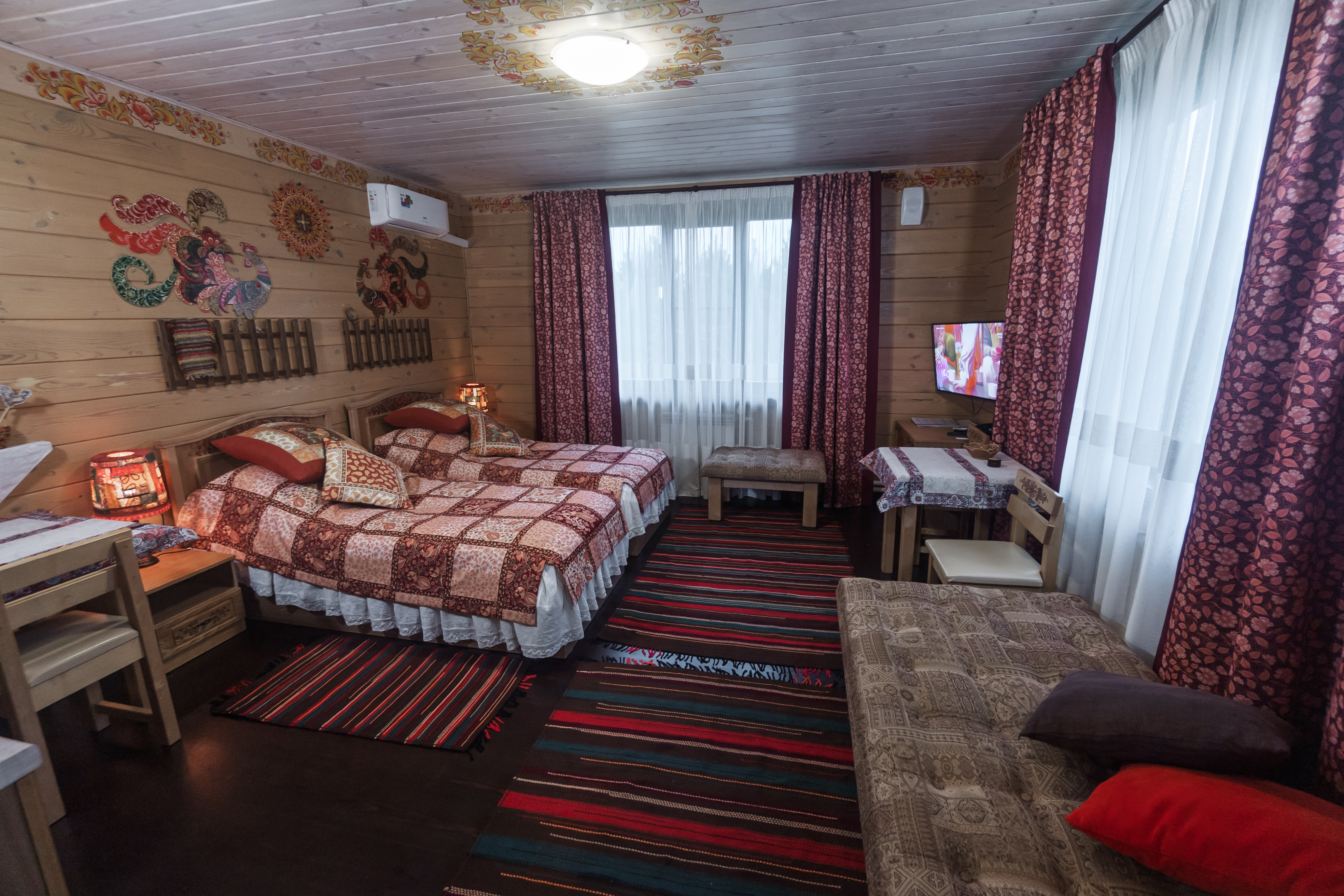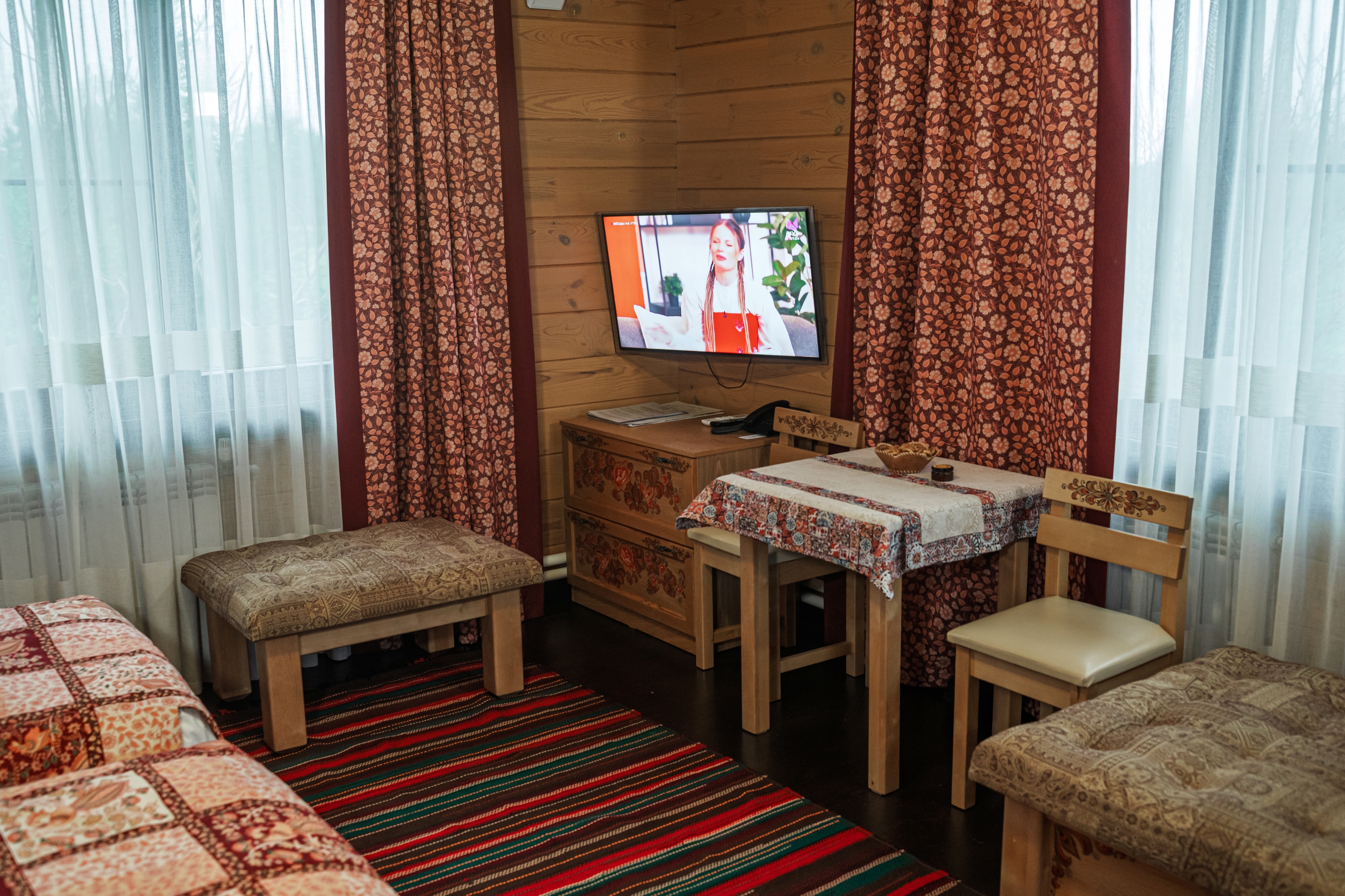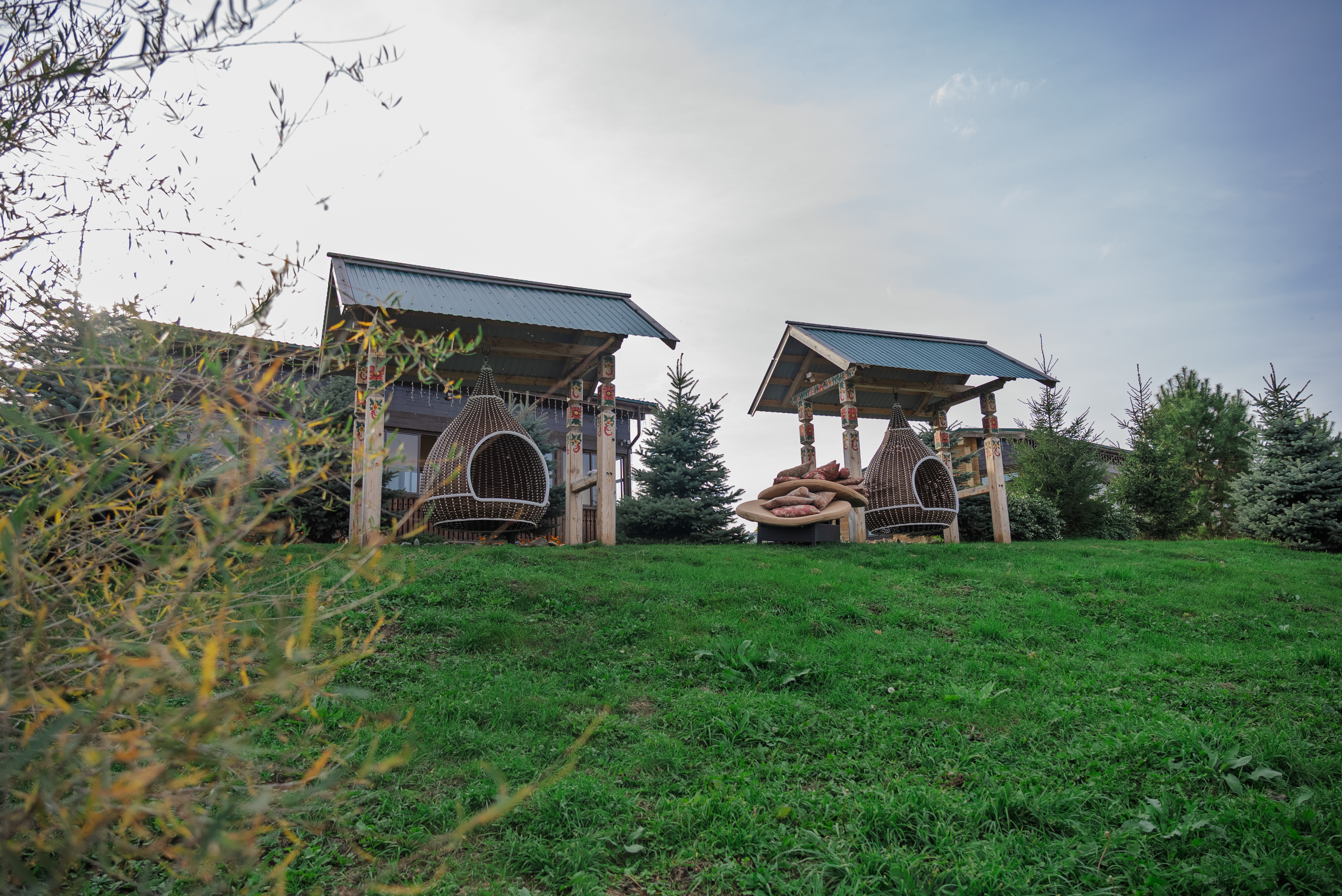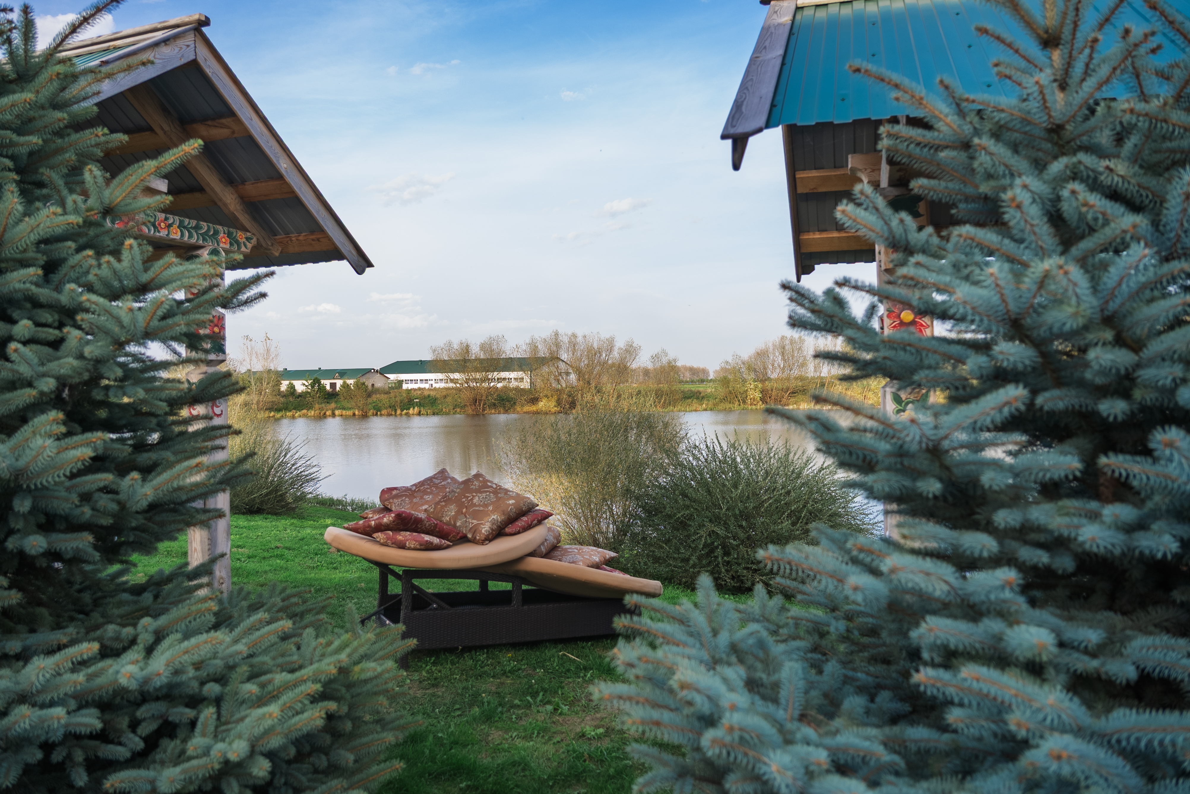 Территория комплекса раскинулась вдоль берега одного из трех искусственных озер, занимая площадь 2 гектара. Для размещения предусмотрено три одноэтажных корпуса из кедра с отдельным входом и верандой. Весь комплекс, включая номерной фонд, выполнен в традиционном русском стиле. К услугам отдыхающих 14 благоустроенных номеров, в каждом из которых есть мини-кухня, оборудованная холодильником, микроволновой печью, посудой, чайником и обеденной мебелью, а также телевизор, фен, туалетные принадлежности и халаты. Ароматная древесина домов, традиционная ручная роспись, авторский текстиль, лоскутные теплые одеяла и природная тишина на берегу озера делают отдых максимально комфортным.