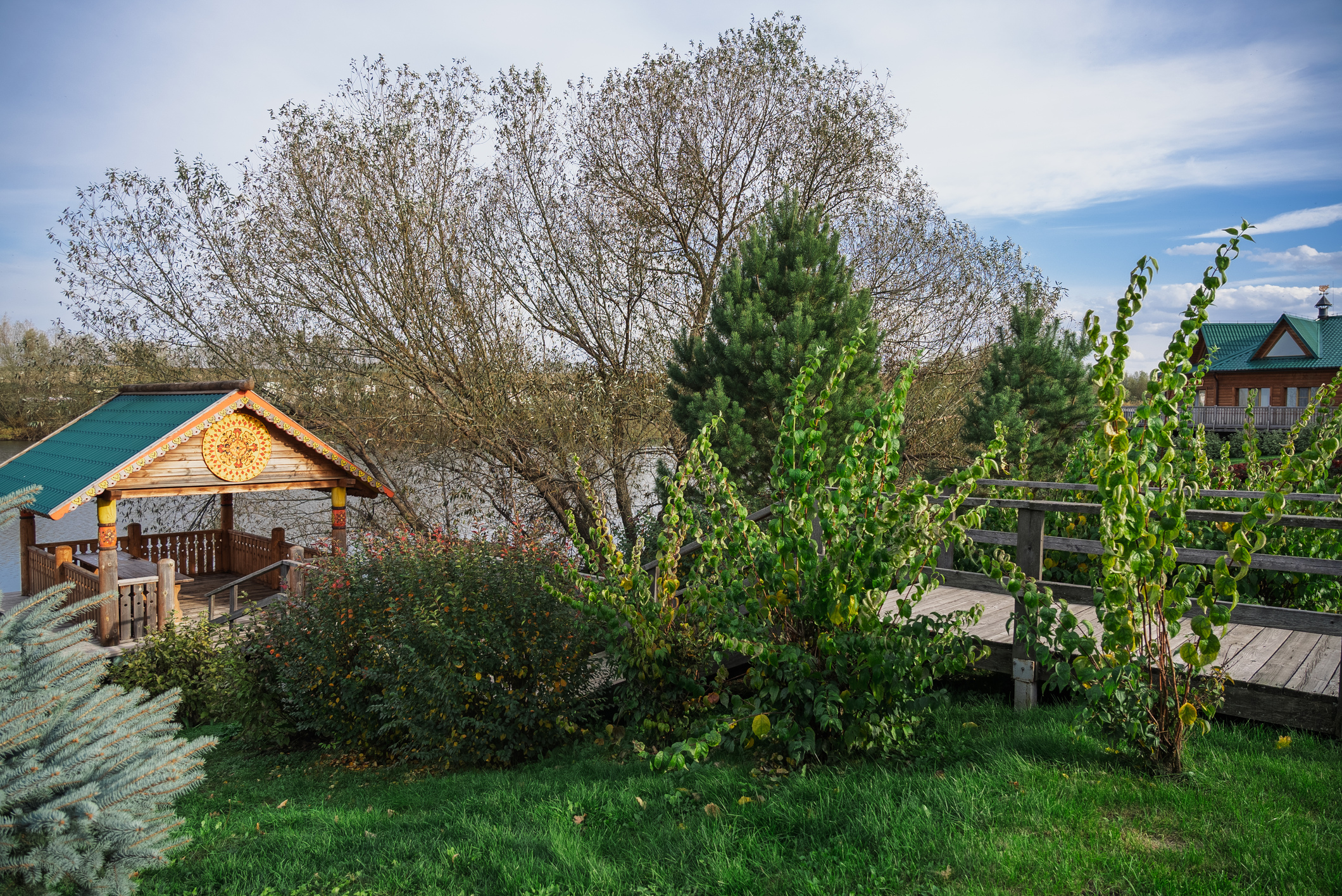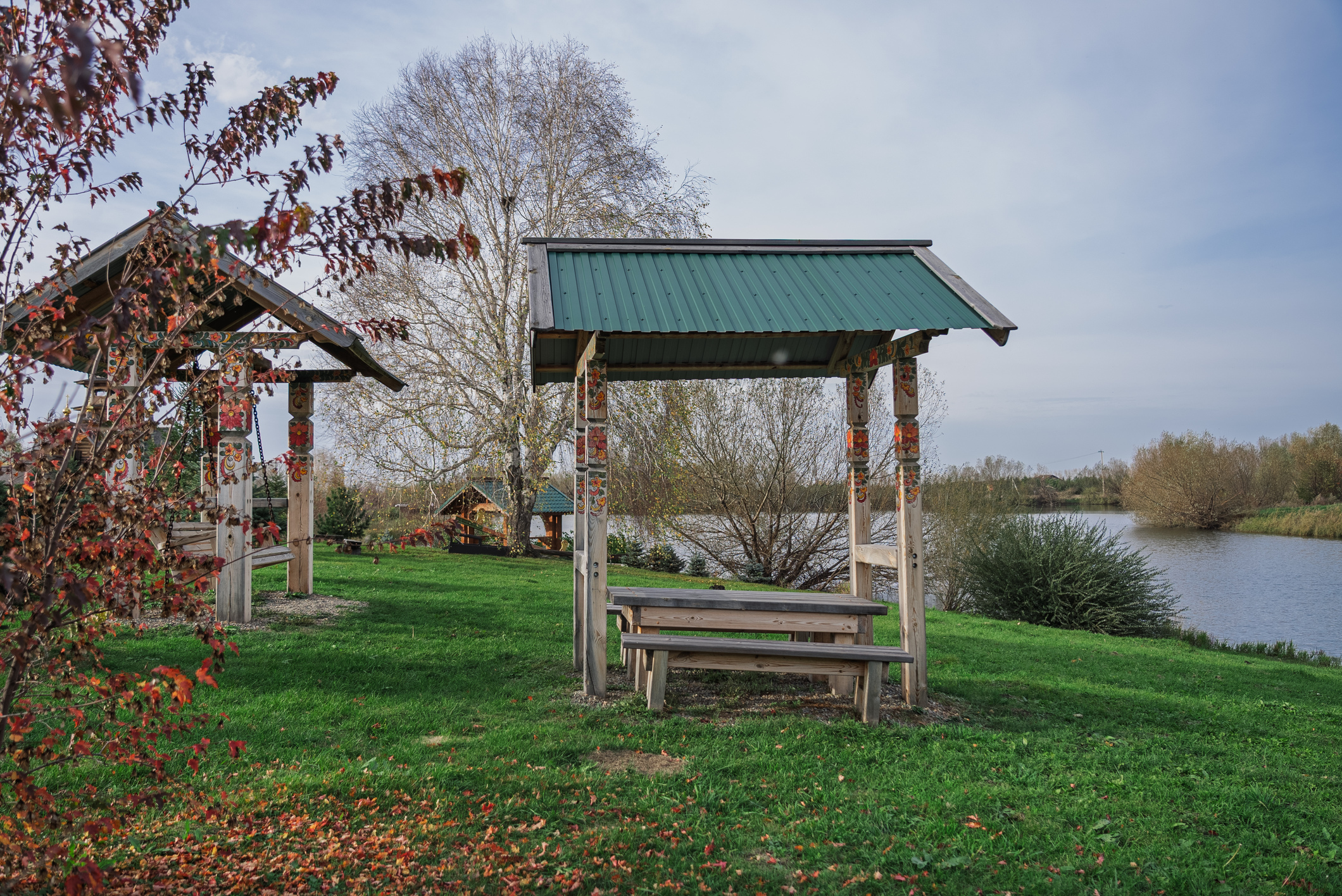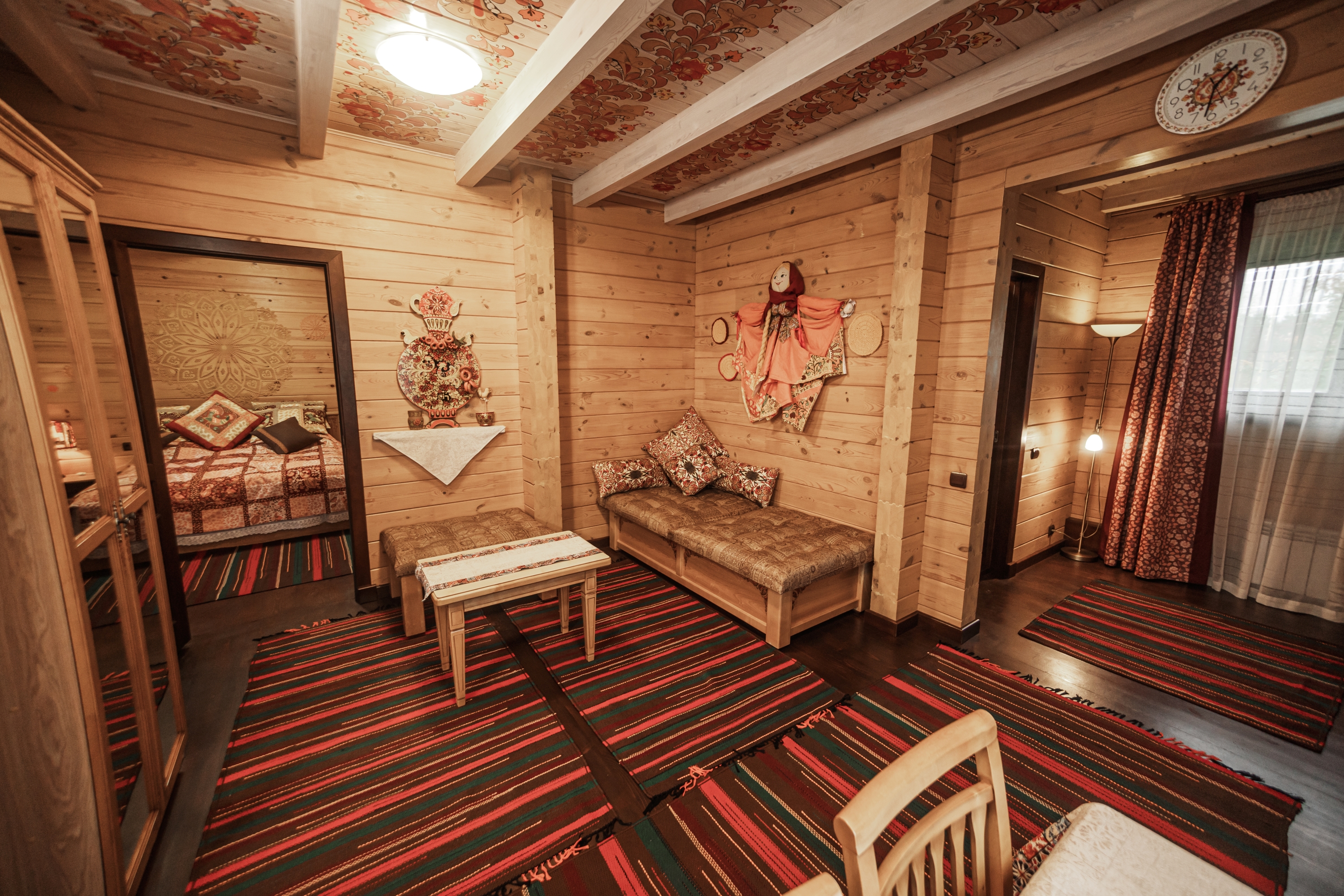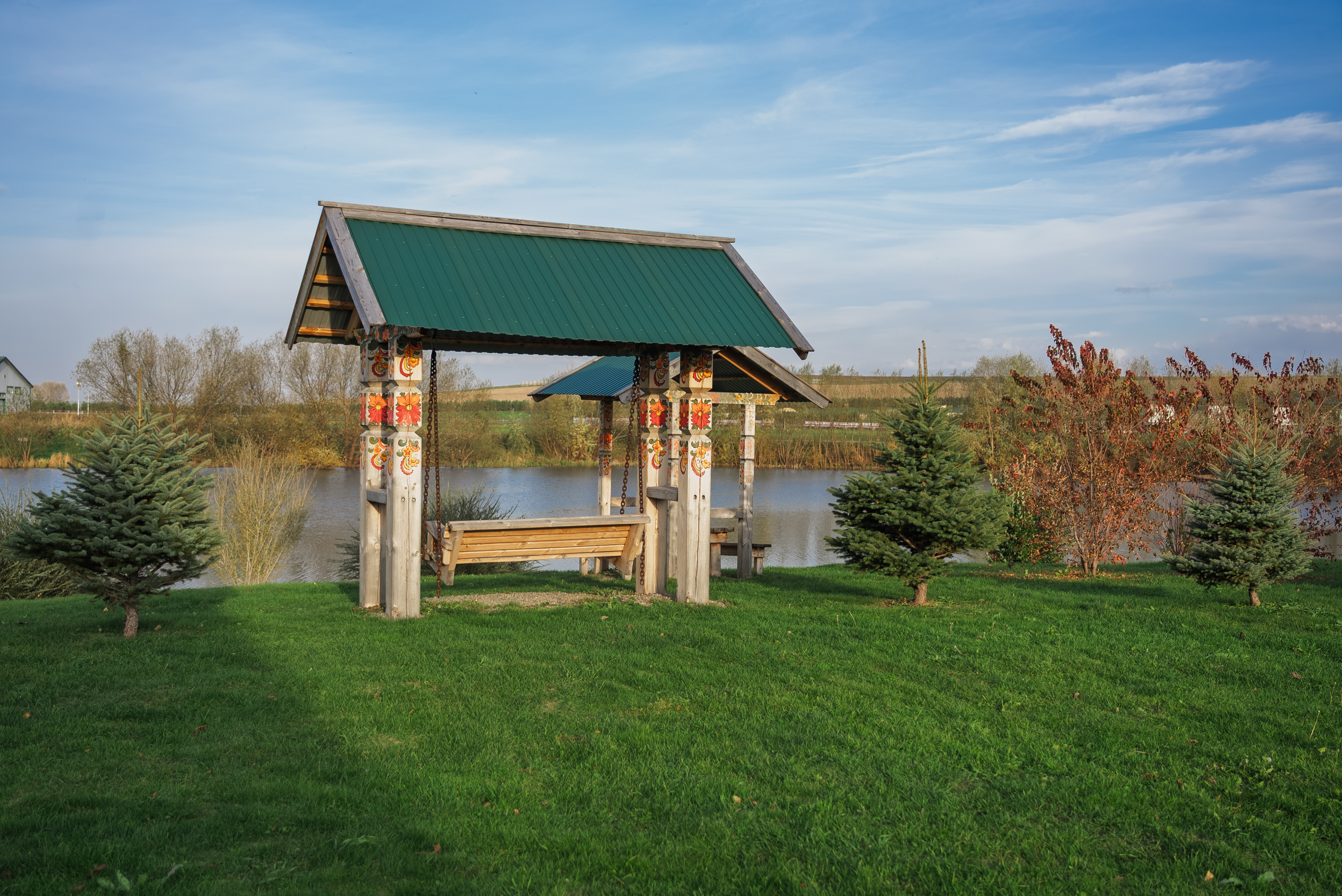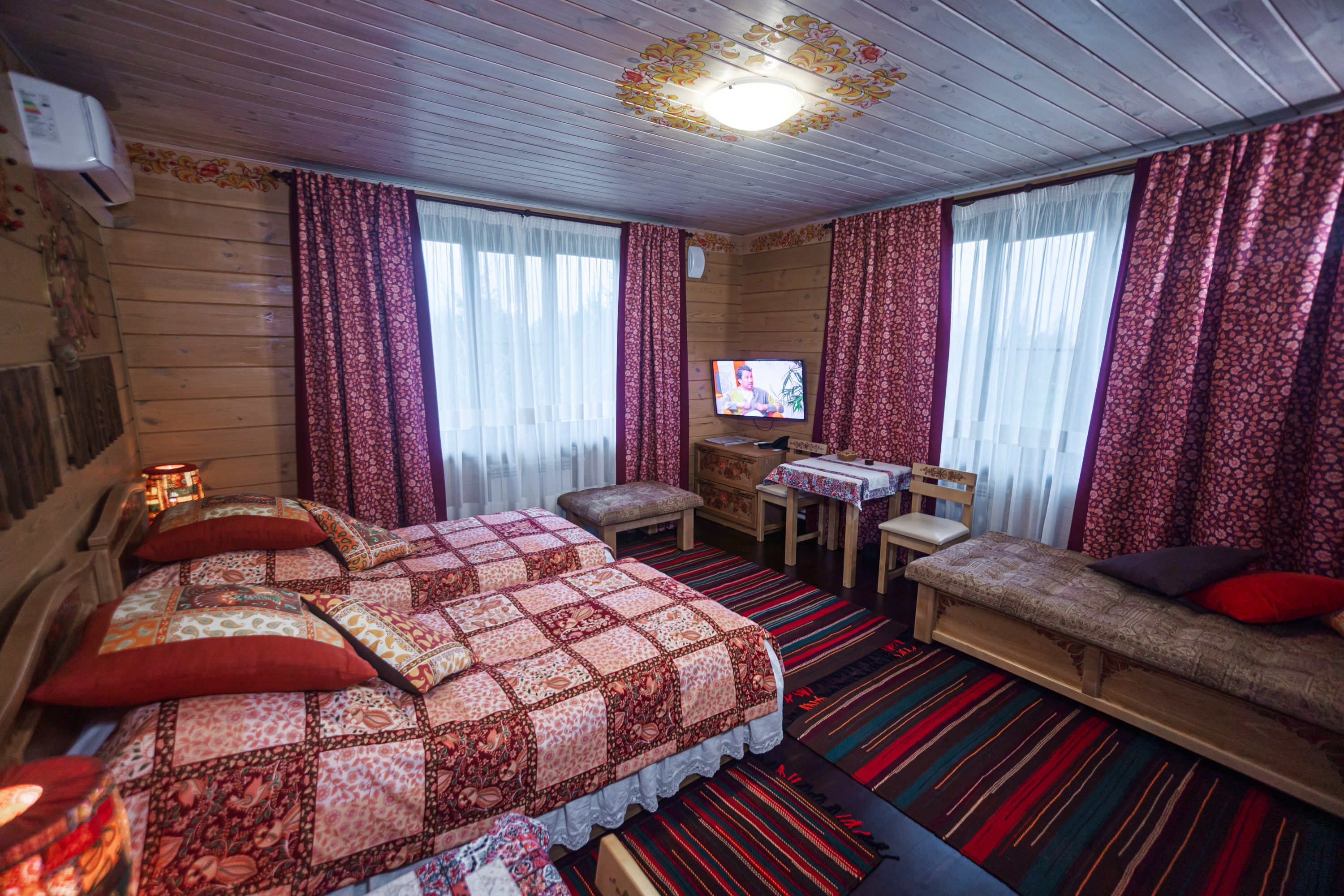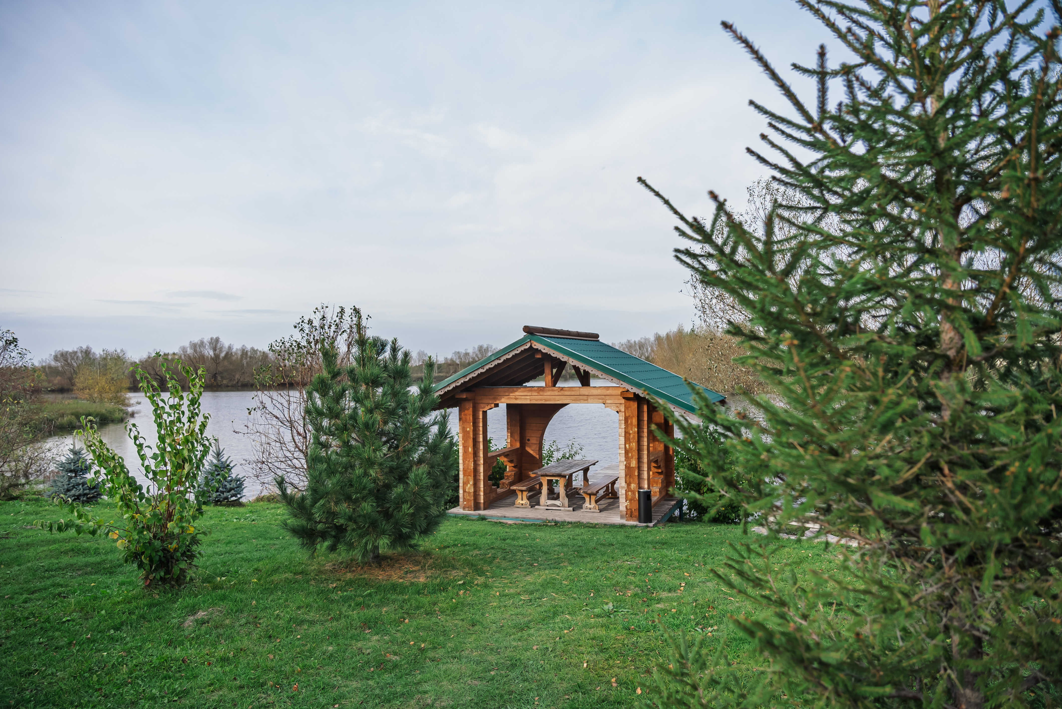Территория комплекса раскинулась вдоль берега одного из трех искусственных озер, занимая площадь 2 гектара. Для размещения предусмотрено три одноэтажных корпуса из кедра с отдельным входом и верандой. Весь комплекс, включая номерной фонд, выполнен в традиционном русском стиле. К услугам отдыхающих 14 благоустроенных номеров, в каждом из которых есть мини-кухня, оборудованная холодильником, микроволновой печью, посудой, чайником и обеденной мебелью, а также телевизор, фен, туалетные принадлежности и халаты. Ароматная древесина домов, традиционная ручная роспись, авторский текстиль, лоскутные теплые одеяла и природная тишина на берегу озера делают отдых максимально комфортным.