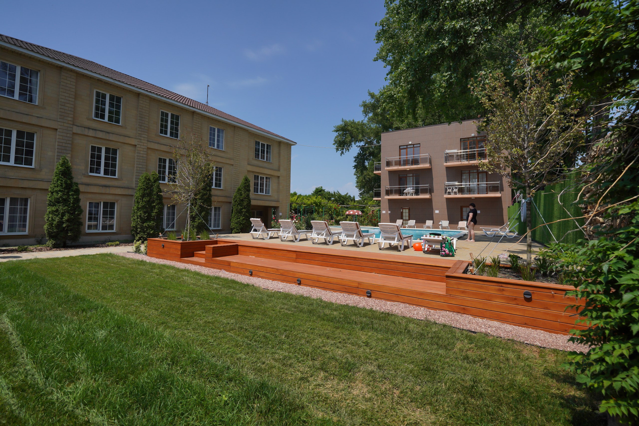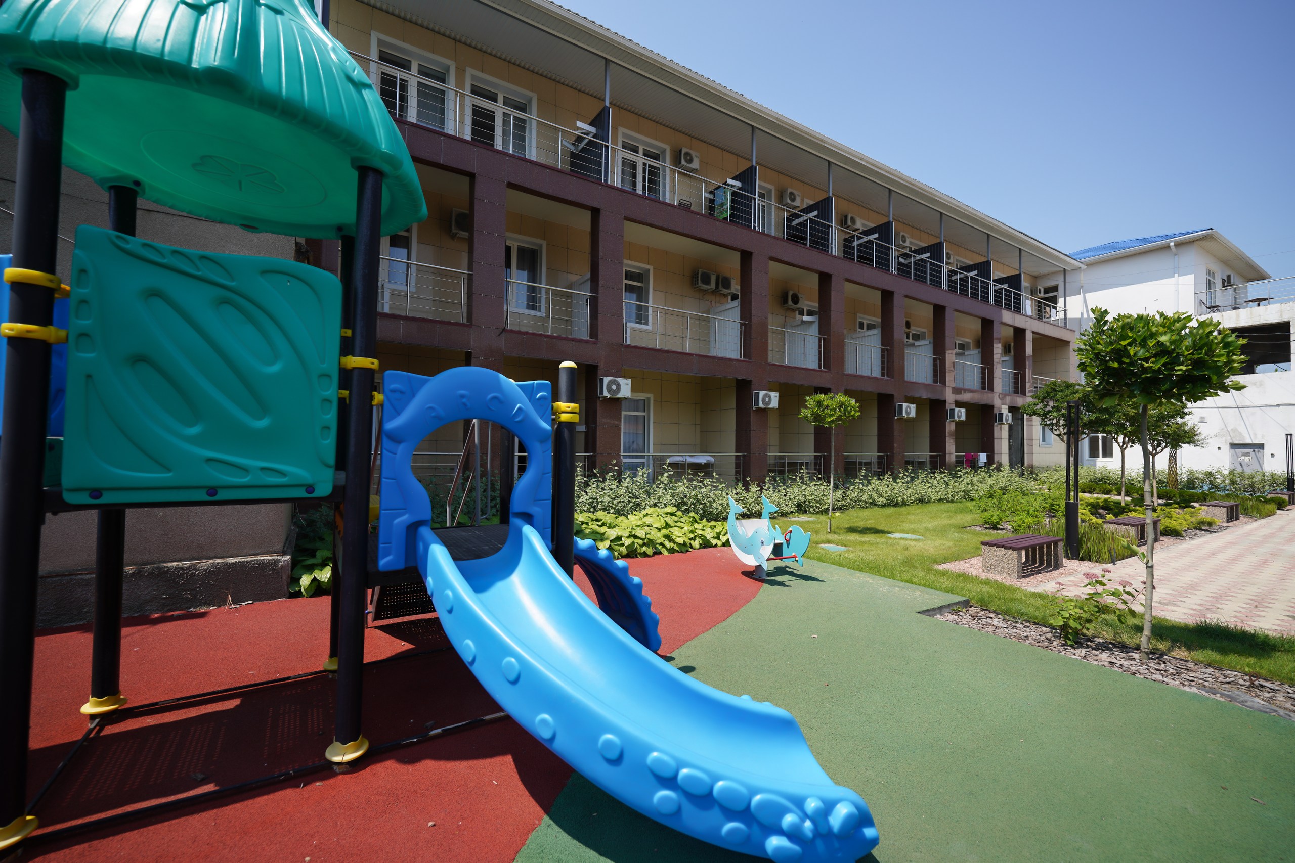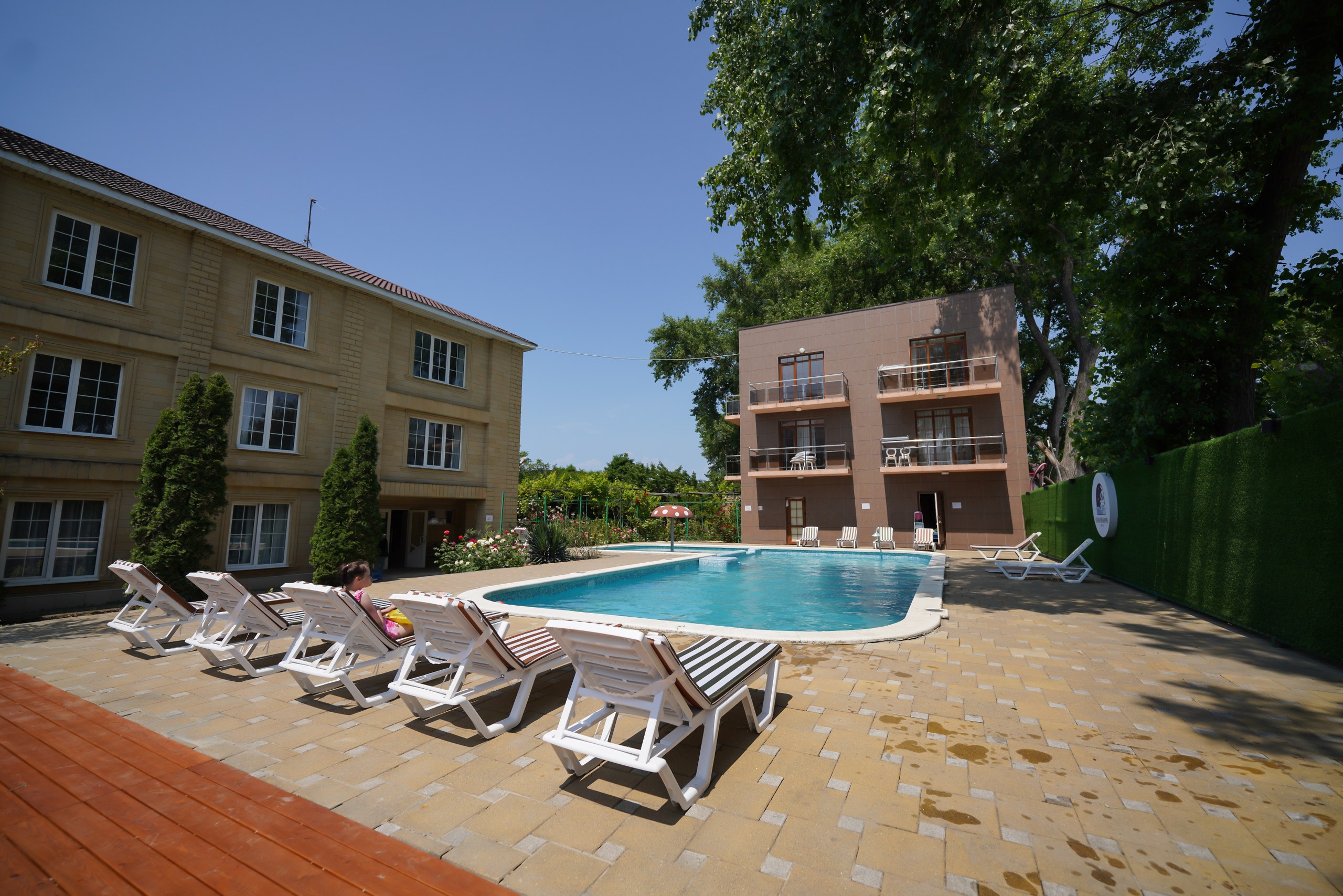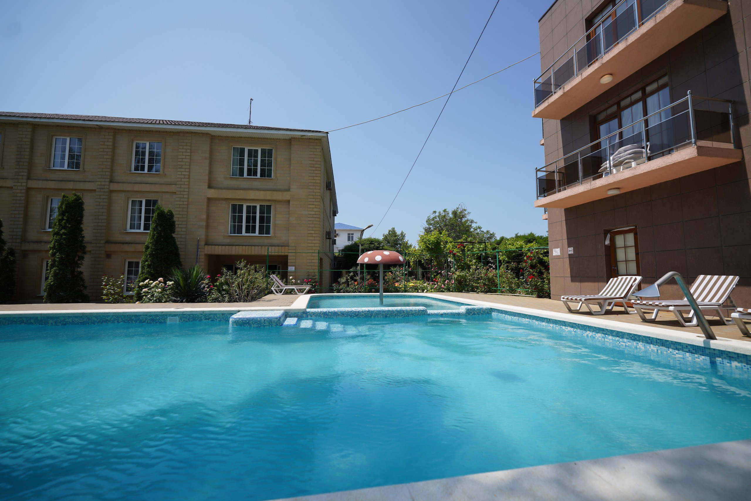 В распоряжении гостей уличный бассейн с гидромассажем и системой водопадов. Для детей оборудована игровая площадка с горками. Автовладельцы смогут оставить машину на парковке на территории.