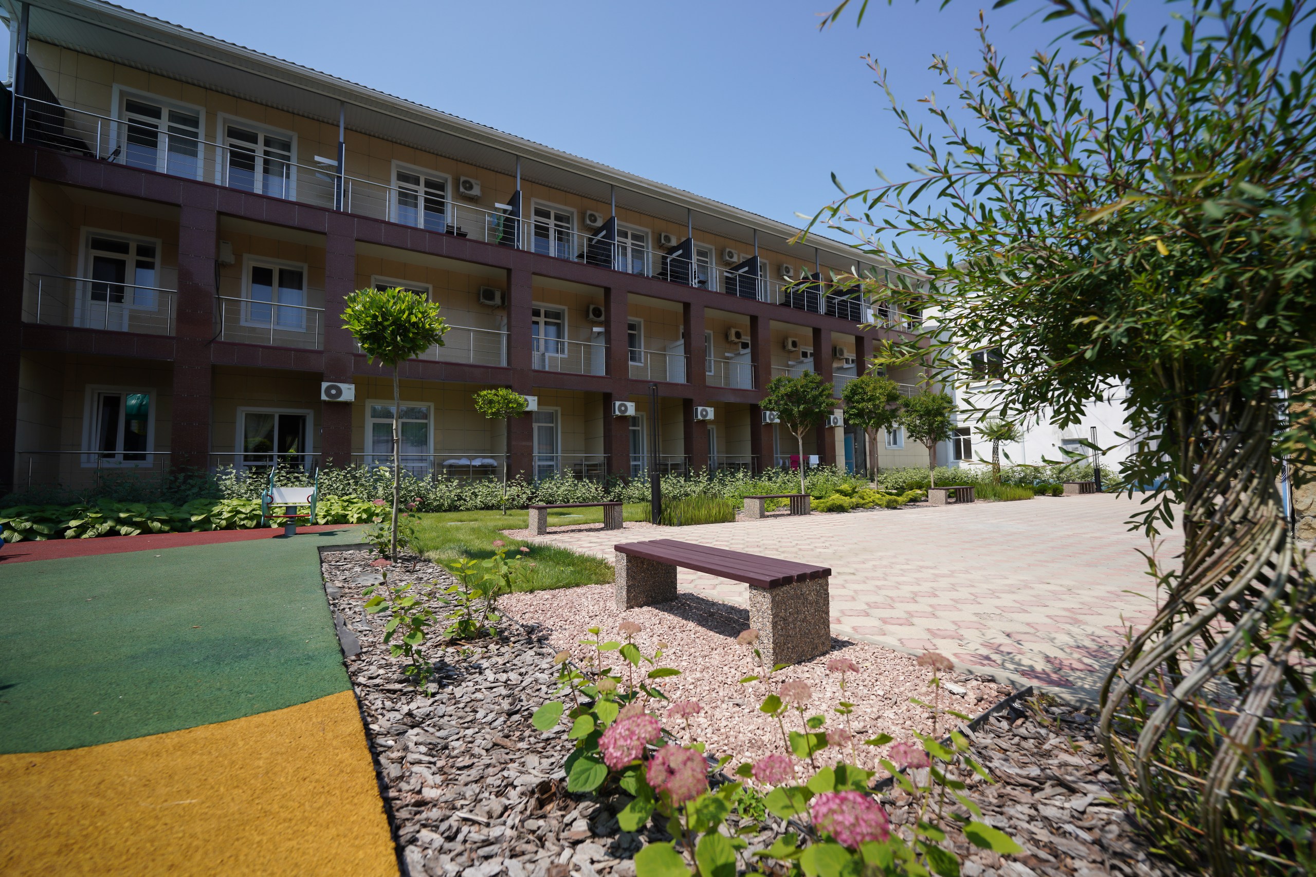 Отель находится в курортном Джемете, расположенном в 15 минутах езды от центра Анапы. В пешей доступности – магазины, кафе, столовые, аквапарк и парк развлечений. Дорога до аэропорта займет около 20 минут на авто, а железнодорожный вокзал – в 10 минут езды.