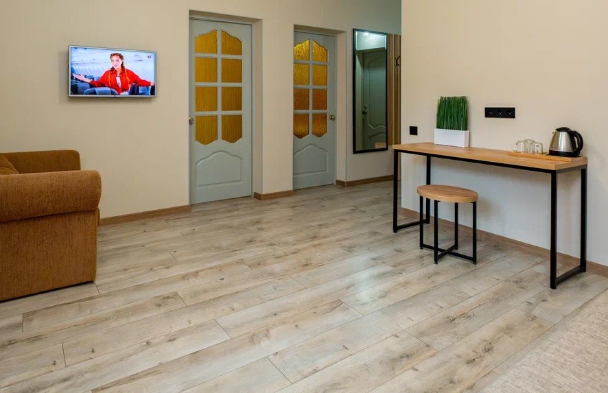 Отель разместился на благоустроенной территории площадью 1300 кв.м. и состоит из двух корпусов - в 2 и 4 этажа. Гостям доступны однокомнатные и двухкомнатные номера Стандарт, оснащенные санузлом, сплит-системой и балконами. В комнатах имеется техника - холодильник, телевизор, фен, электрочайник.