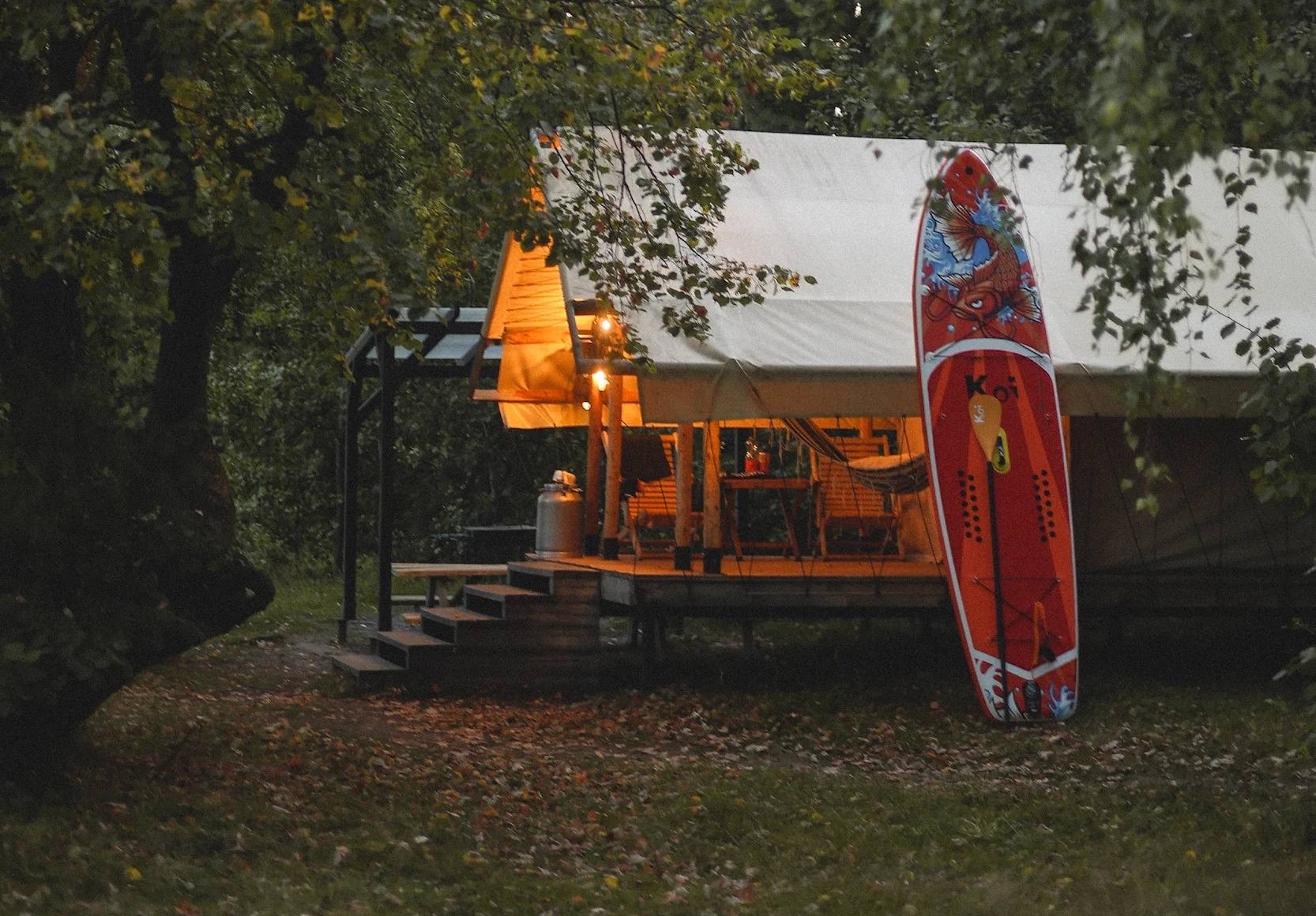 - Терраса: 8 кв.м., гамак возле глэмпа, 2 кресла - шезлонга, фляга с водой