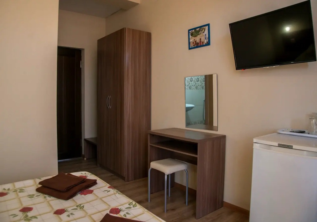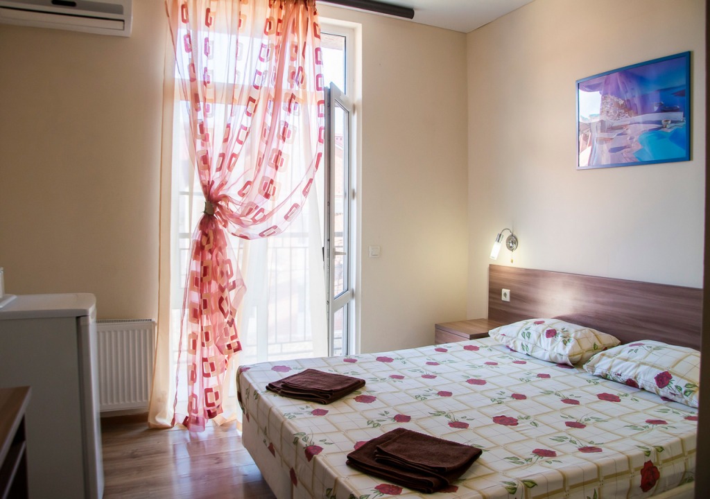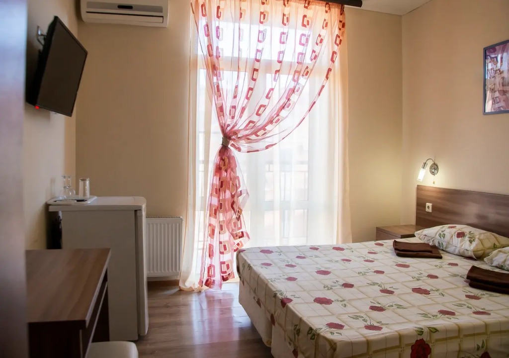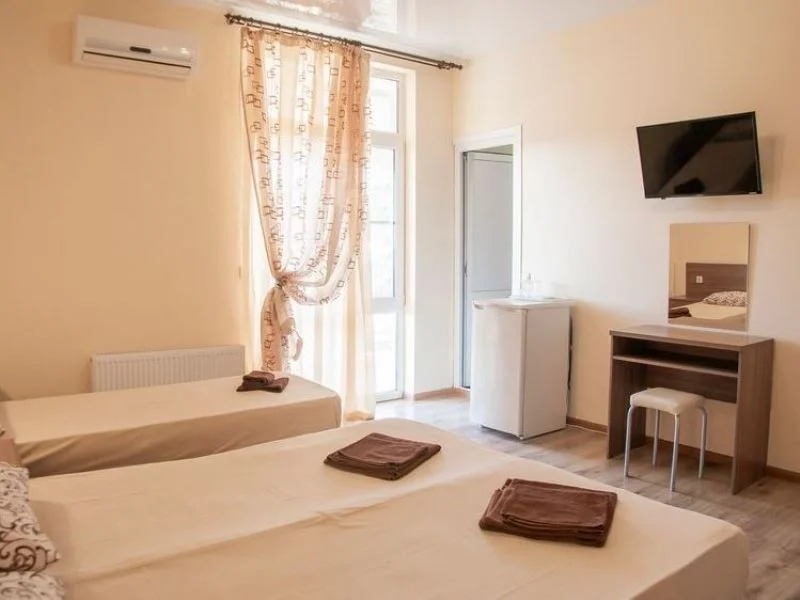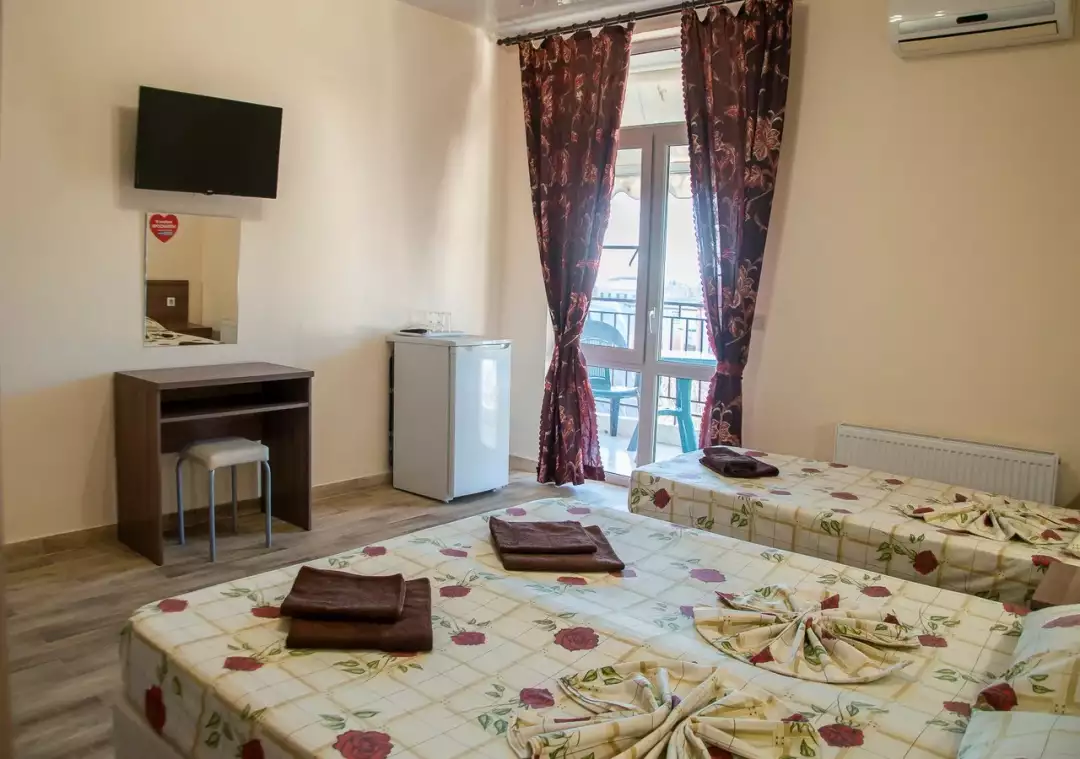Четырехэтажный корпус занимает небольшую закрытую территорию. В распоряжении отдыхающих комфортабельные номера с удобствами. В каждом есть кондиционер, телевизор, холодильник, а также санузел и душ. В ряде номеров предусмотрены балконы, откуда отрываются виды на Кавказские горы или море.
