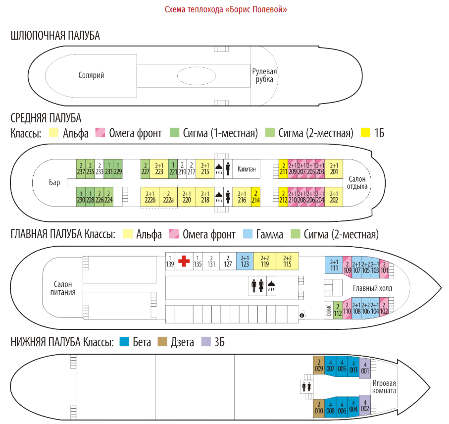 9 кают класса «Альфа» (2 основных места + 1 доп.место, кроме главной палубы)