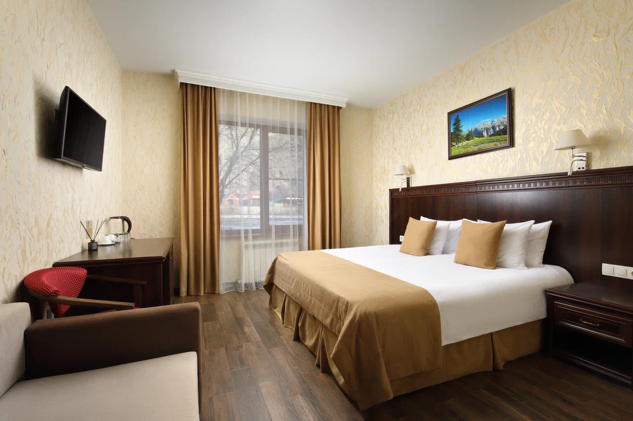 Трехэтажный корпус отеля разместился на небольшой охраняемой территории. Гостей ожидают 45 номеров категории Стандарт, Люкс и Улучшенный. Номера оборудованы ванной комнатой с набором косметических принадлежностей для гостей, есть телевизор-ЖК, мини-холодильник, электрочайник. С балконов открываются живописные виды на горные вершины.