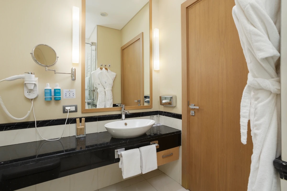 с ванной: ; с душевой кабиной: ; тапочки: ; туалетные принадлежности: ; фен: ; халат: ;