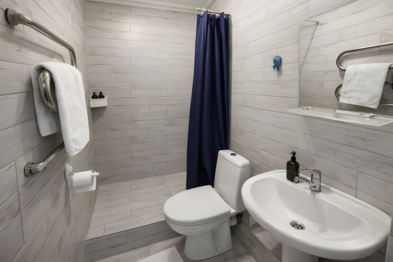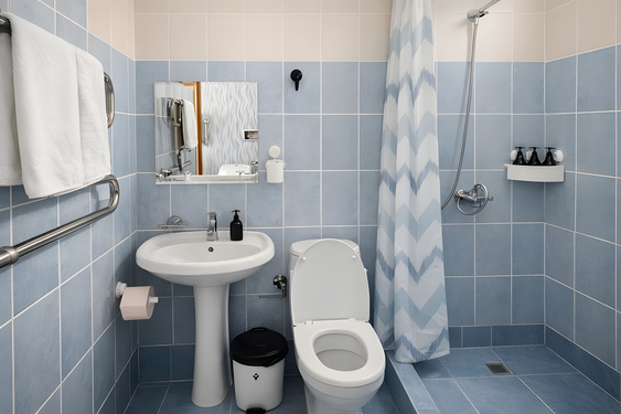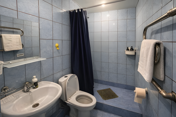 с душем: ; туалетные принадлежности: ; фен: ;