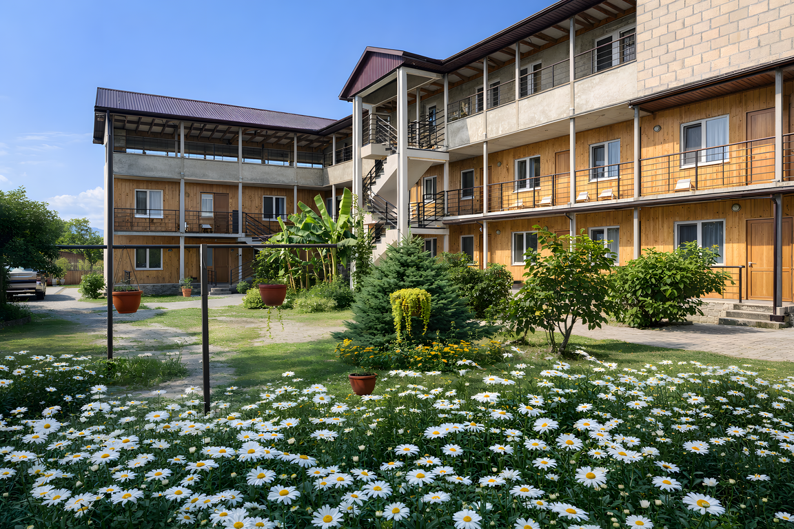 Гостевой дом «Шале у моря» находится в поселке Цандрипш, всего в пяти минутах неторопливой прогулки от галечной береговой линии Черного моря. Это тихая, зеленая локация вдали от шумных курортных центров, где легко дышится и отдыхается. Рядом с объектом есть все необходимое для комфортного быта: продуктовые магазины, уютные кафе, рынок, аптека и остановка общественного транспорта. Для путешественников на автомобиле предусмотрена удобная парковка, а граница с Россией находится примерно в четырех километрах.
