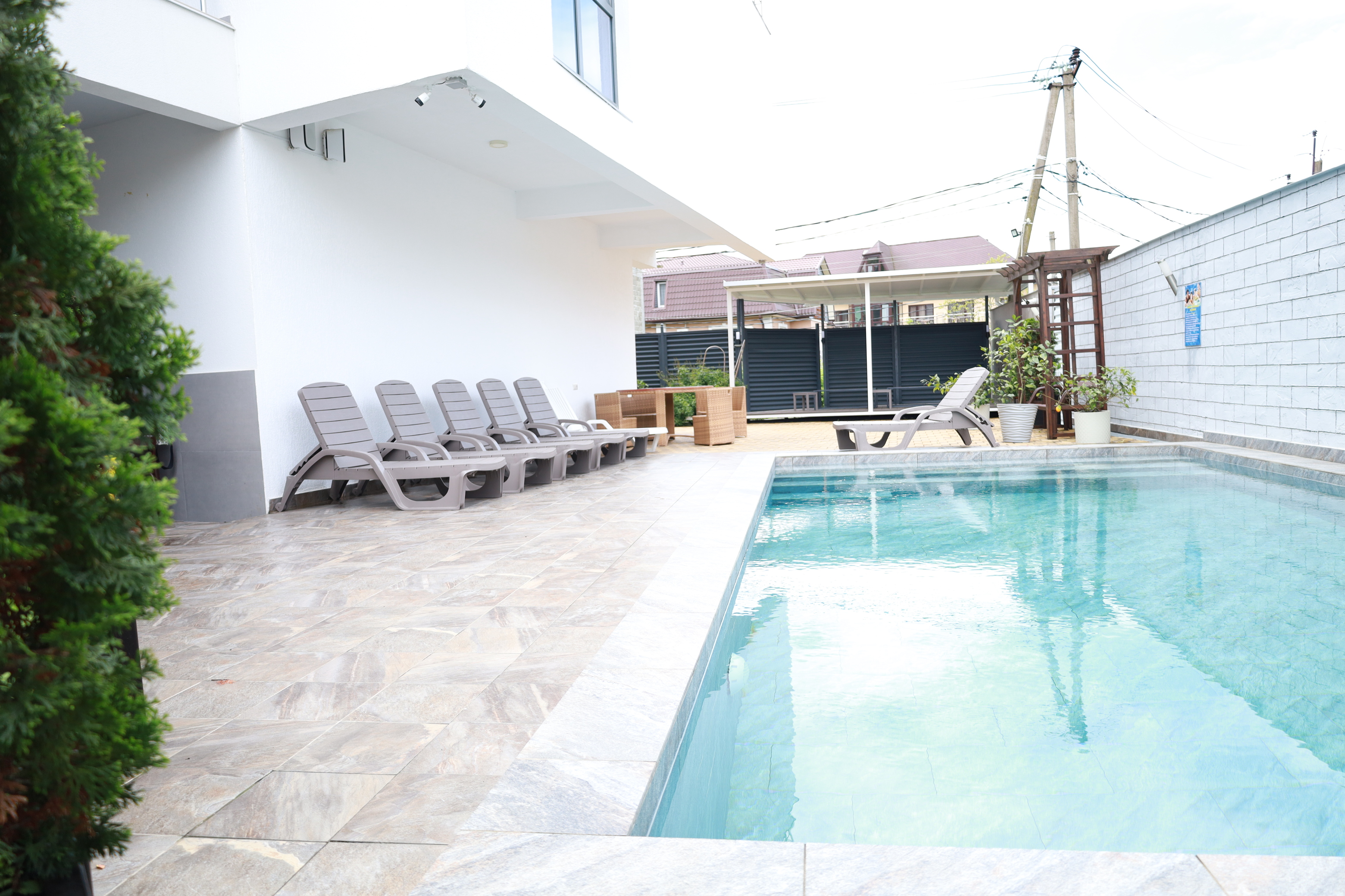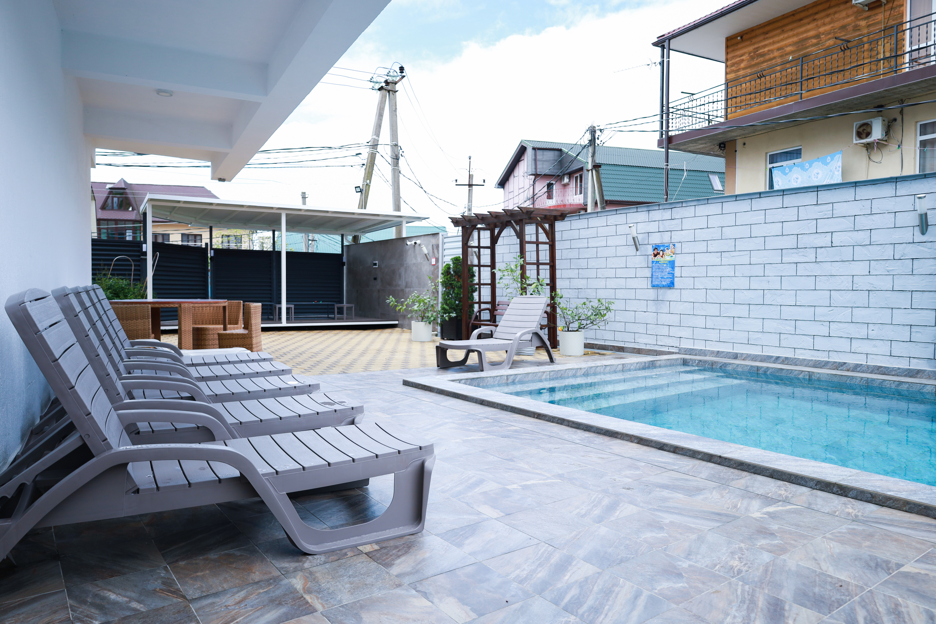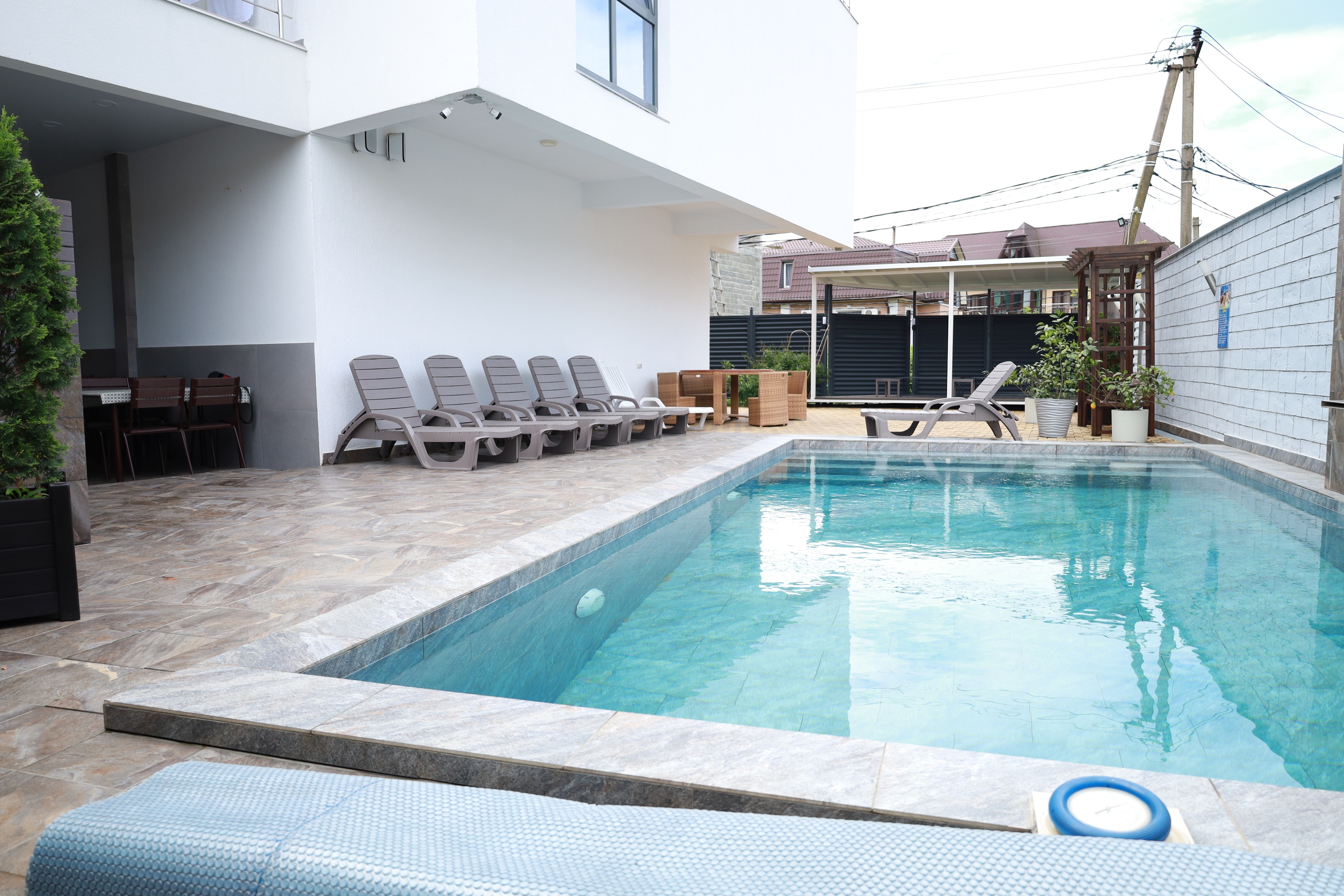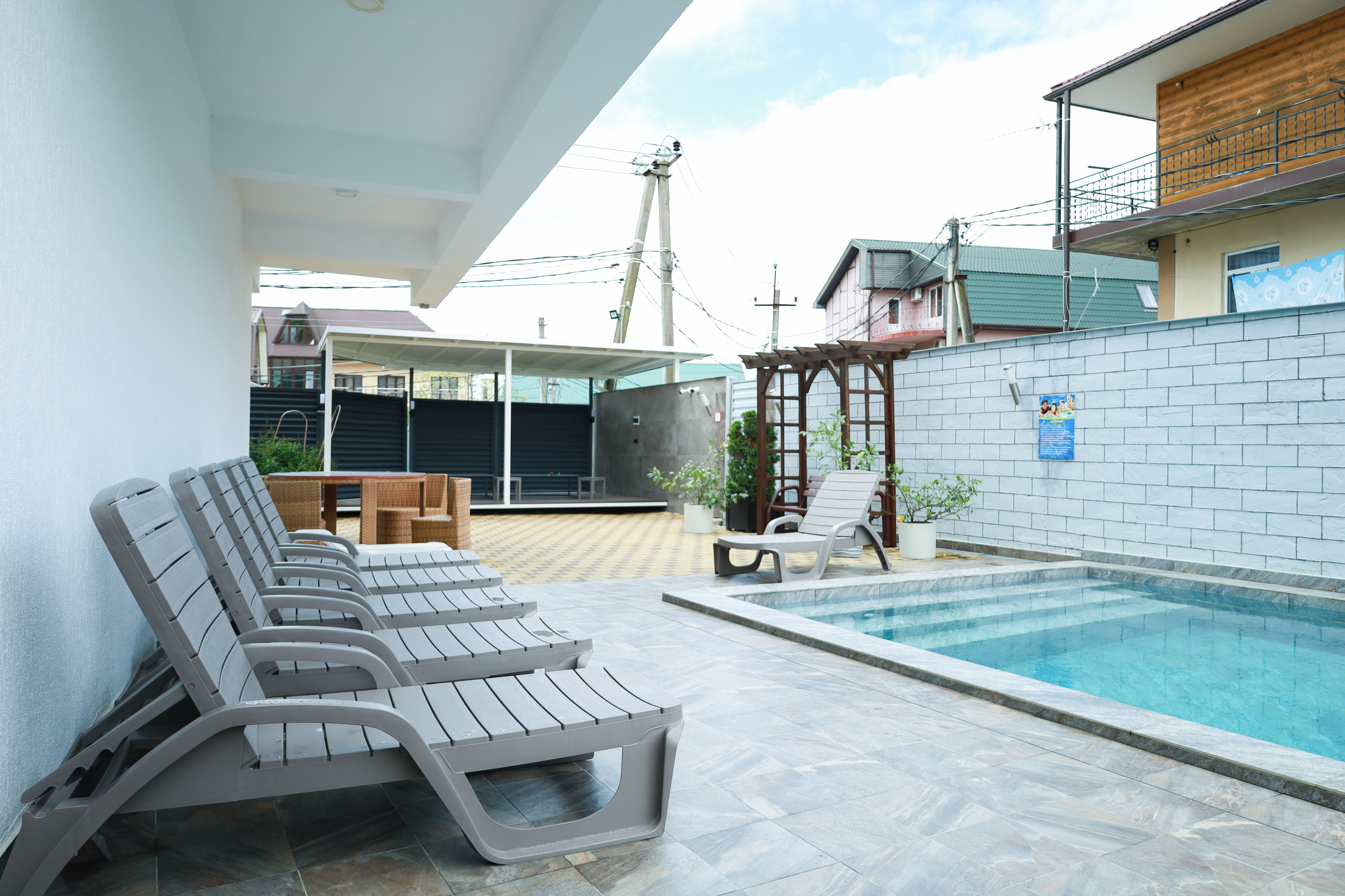На первом этаже гостевого дома работает общая кухня, полностью оборудованная необходимой посудой и техникой. Во внутреннем дворике – открытый бассейн с подогревом, а рядом с ним – небольшая зона для загара с шезлонгами. Также в распоряжении гостей – беспроводной интернет и прачечная. Родителям с малышами администрация предоставляет в аренду детские кроватки, а для автовладельцев доступны парковочные места.