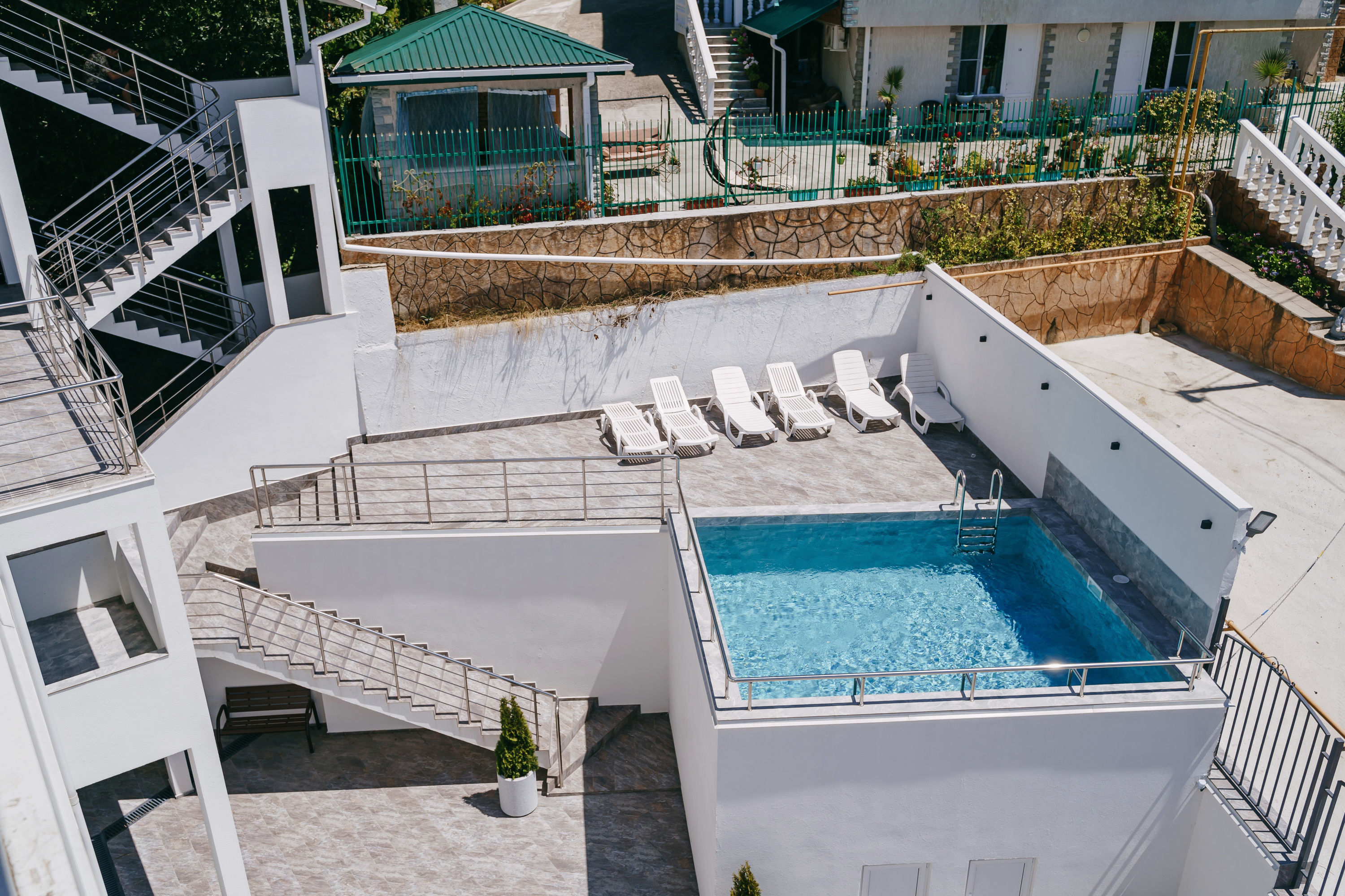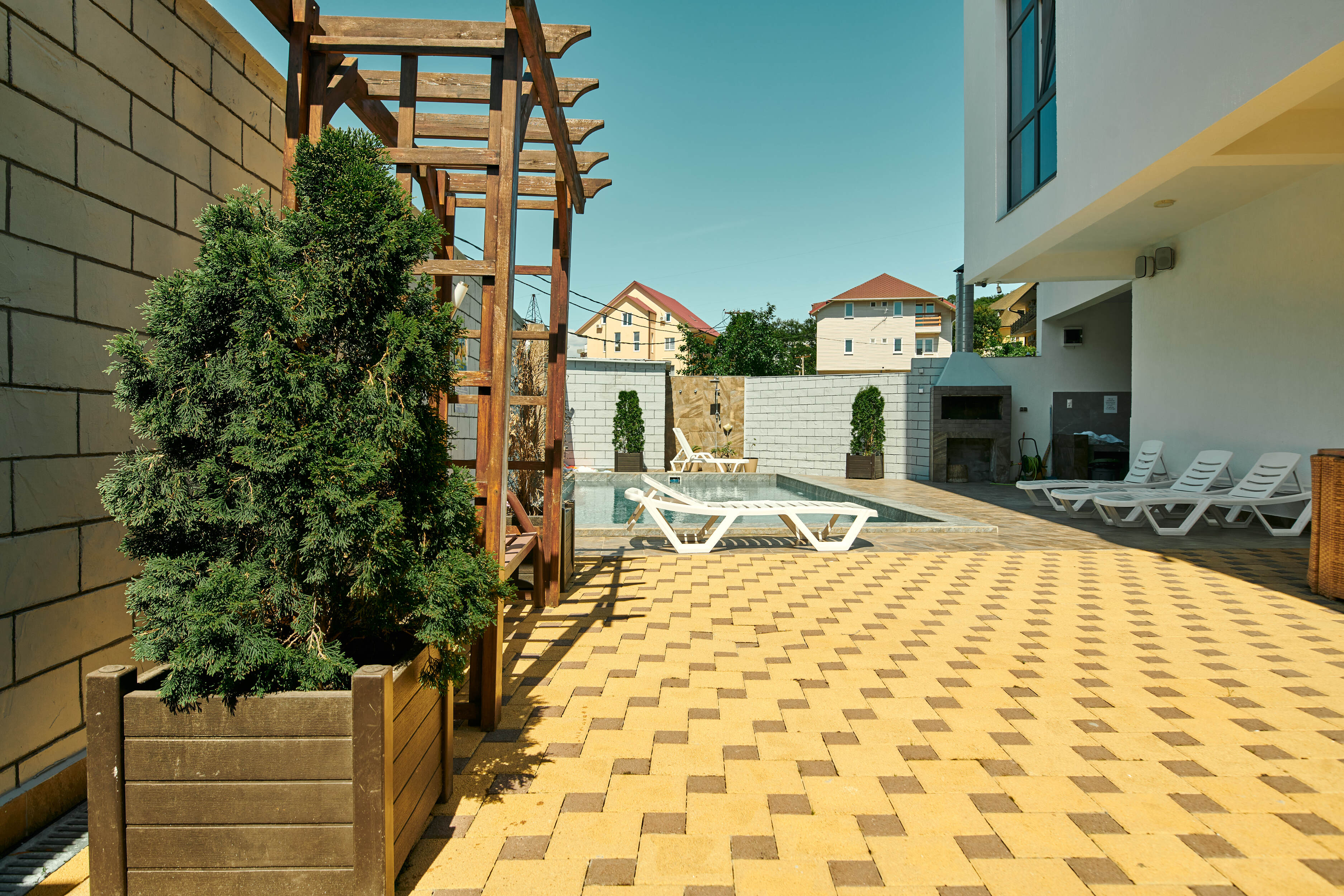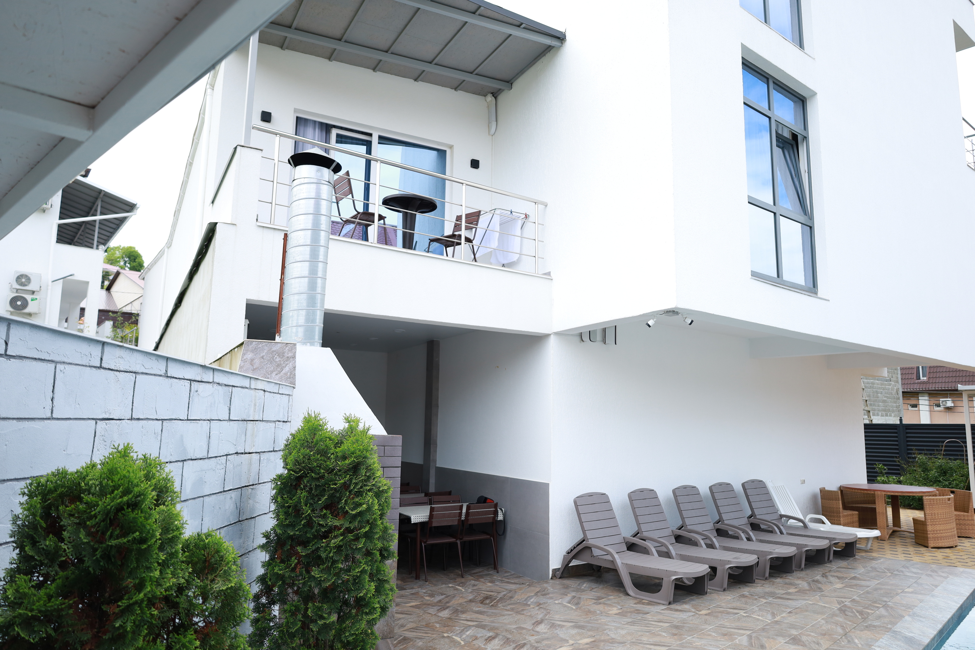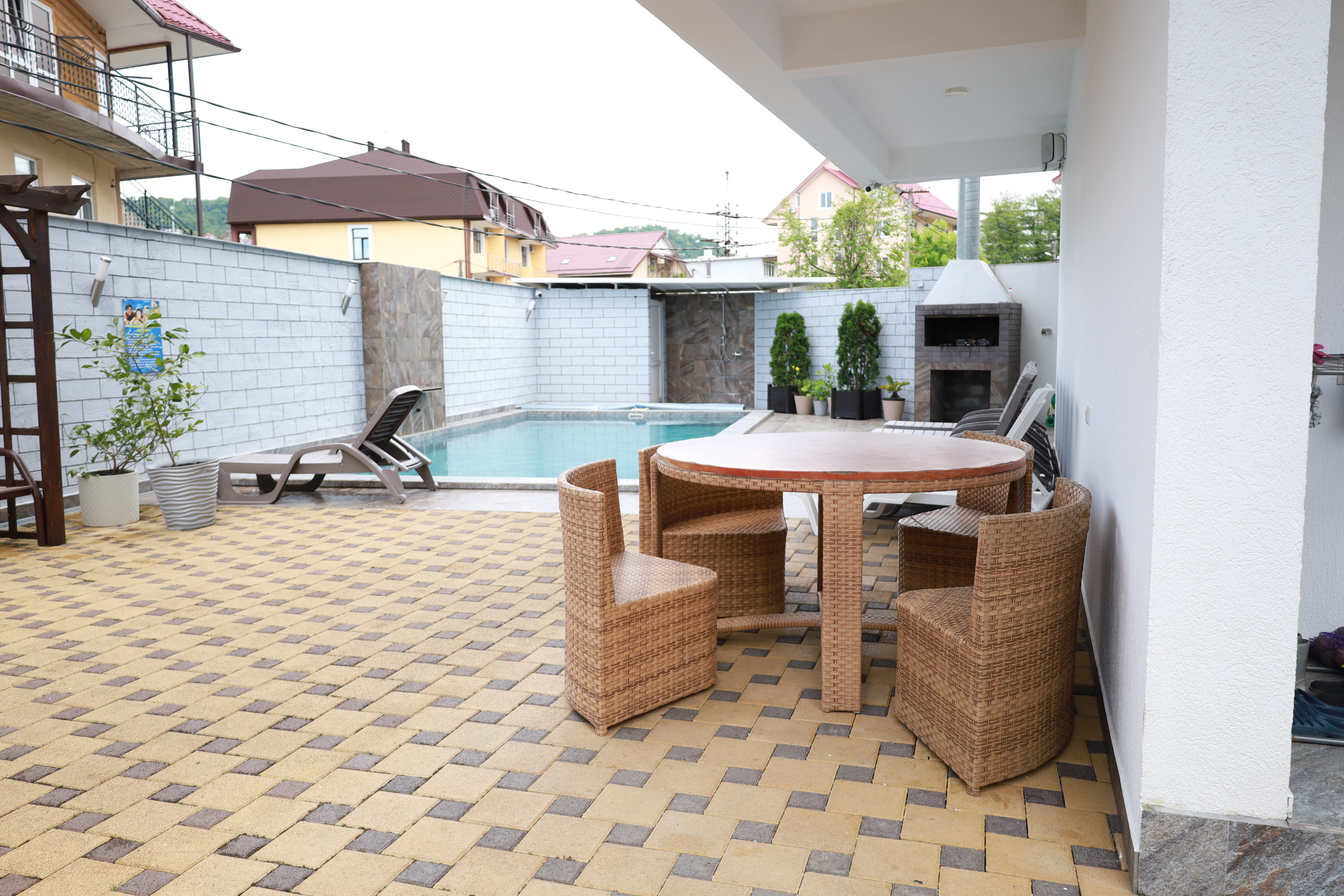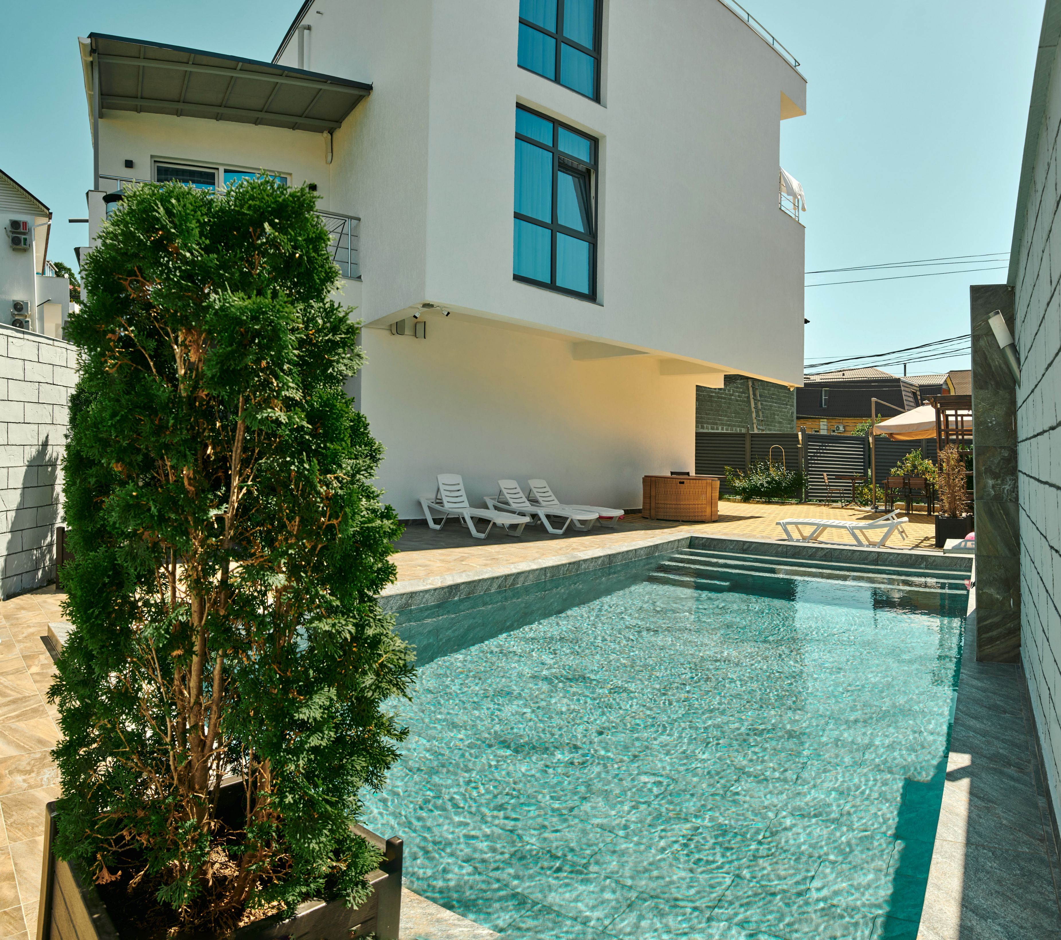 На первом этаже гостевого дома работает общая кухня, полностью оборудованная необходимой посудой и техникой. Во внутреннем дворике – открытый бассейн с подогревом, а рядом с ним – небольшая зона для загара с шезлонгами. Также в распоряжении гостей – беспроводной интернет и прачечная. Родителям с малышами администрация предоставляет в аренду детские кроватки, а для автовладельцев доступны парковочные места.