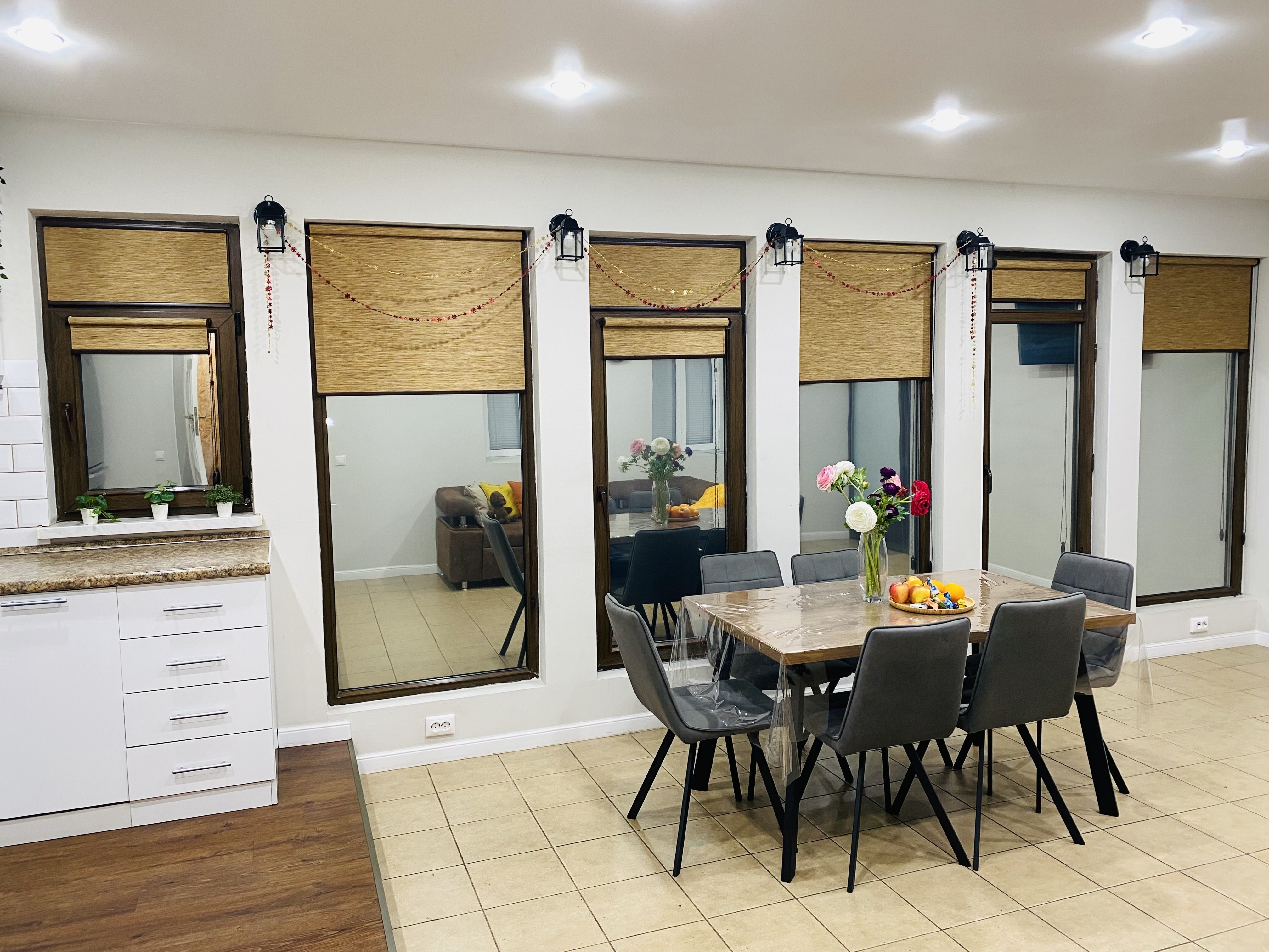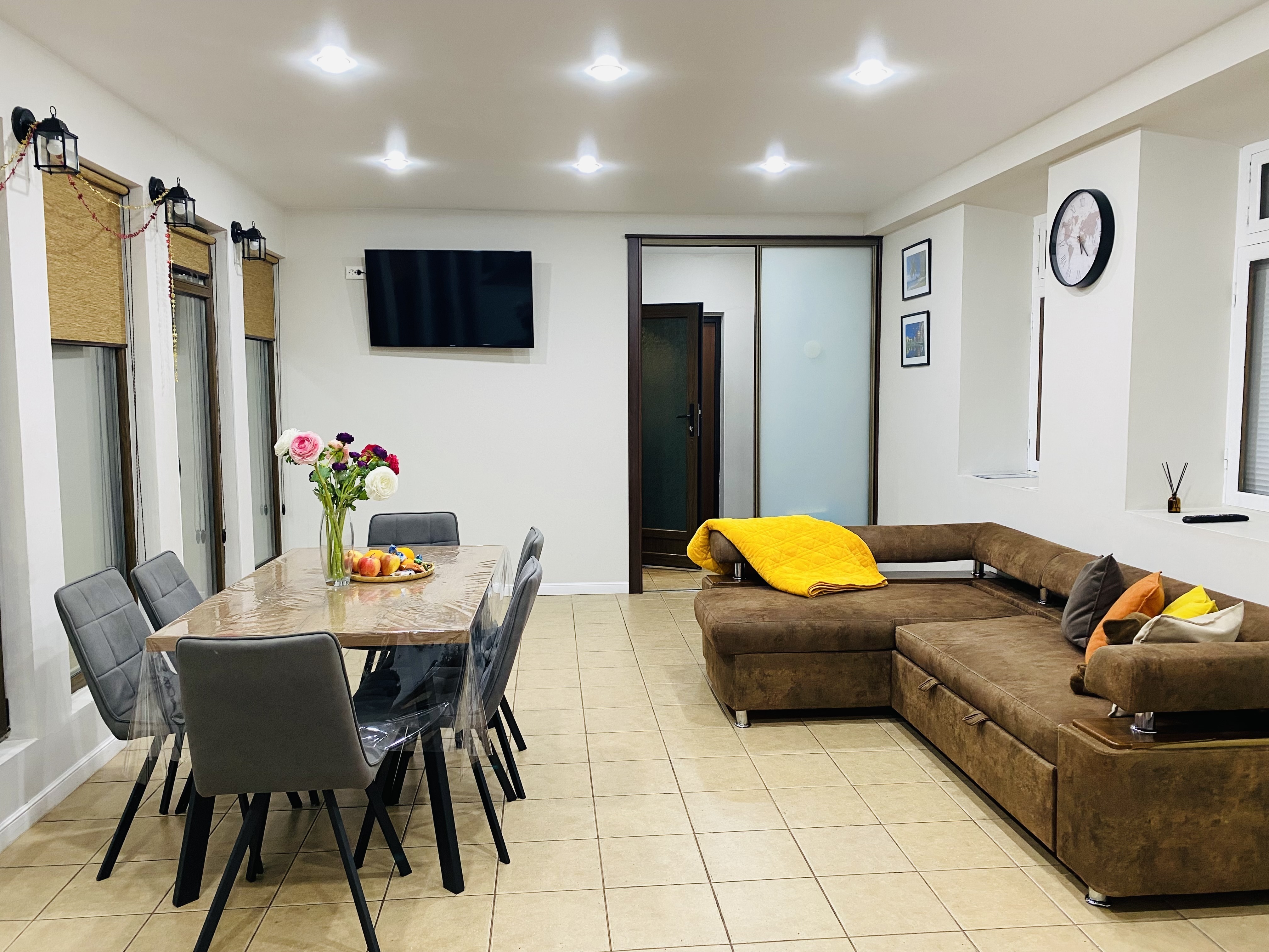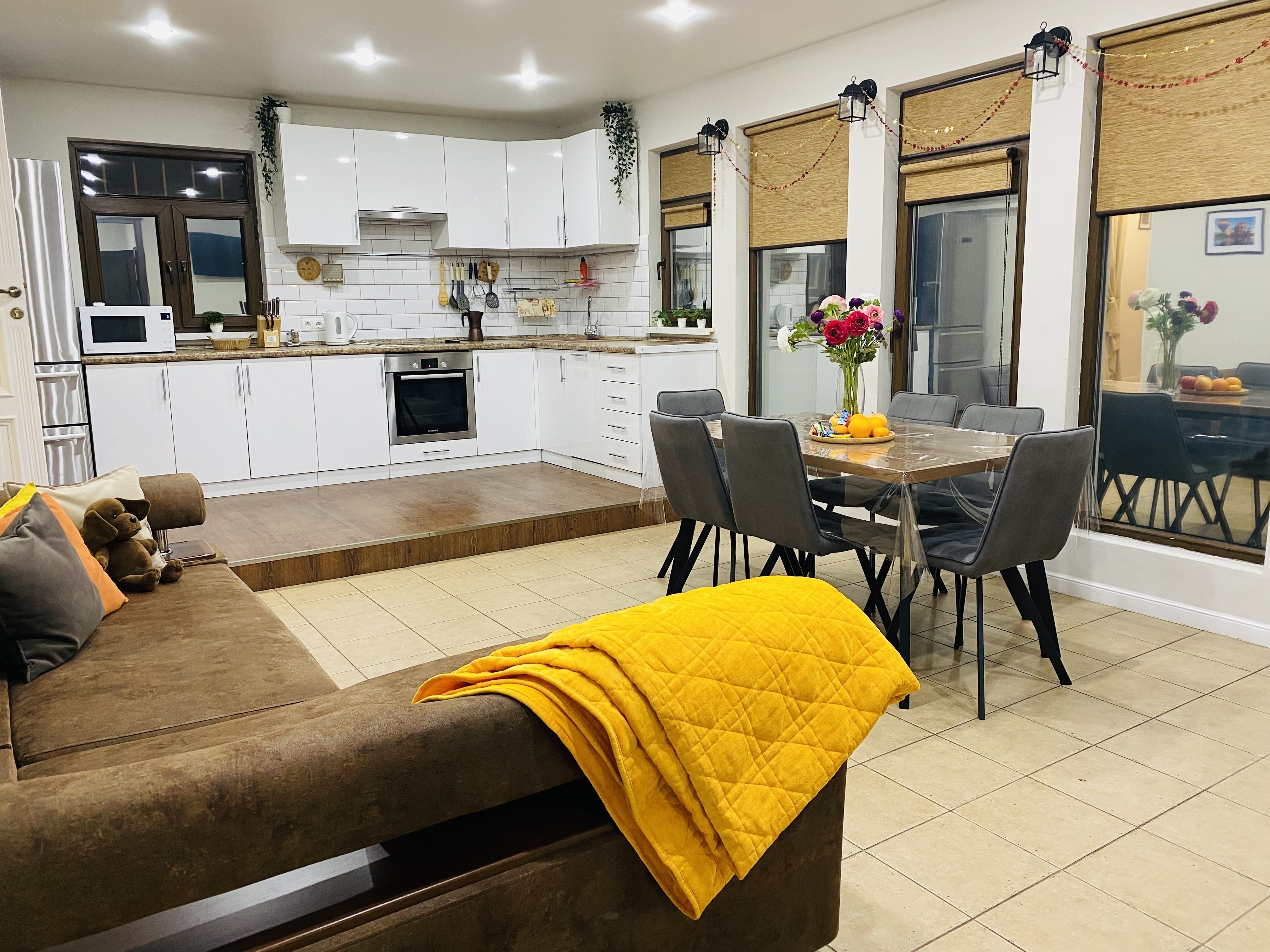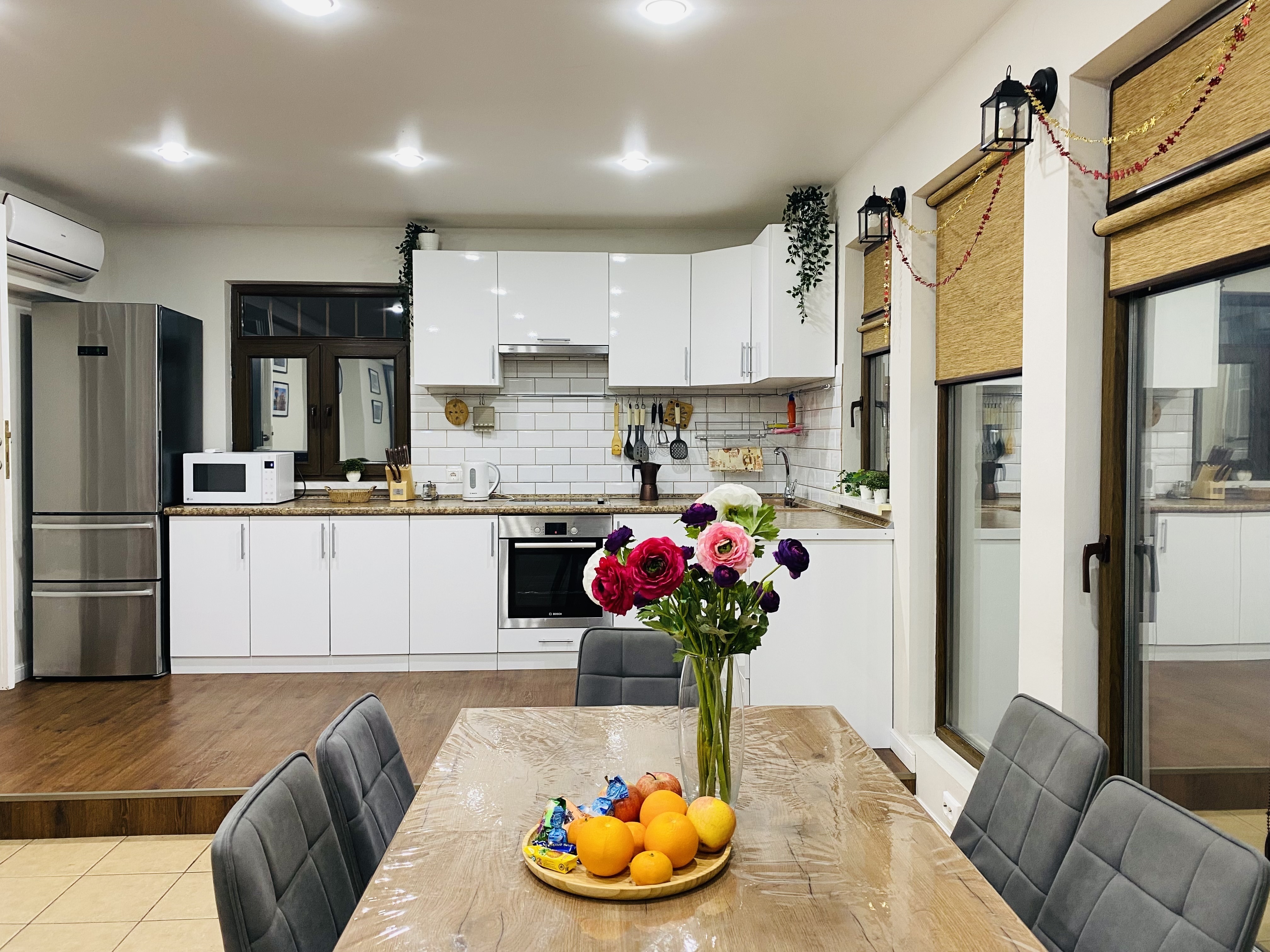 Коттедж состоит из 3 спален, кухни-гостиной и 2 санузлов. В комнатах установлены современные кровати для отдыха и сна, шкафы для хранения одежды, раскладной диван. Также для гостей предоставлены телевизор с плоским экраном, кондиционер, гладильная доска. Санузлы с ванной и душем, есть стиральная машинка. Кухня оборудована плитой, микроволновой печью, холодильником, электрическим чайником, посудомоечной машиной, а также удобной обеденной зоной. На свежем воздухе для отдыхающих установлены качели, детская игровая площадка, так же есть терраса с обеденным столом, мебелью и мангальной зоной. Гостям на автомобиле предоставляется гараж.