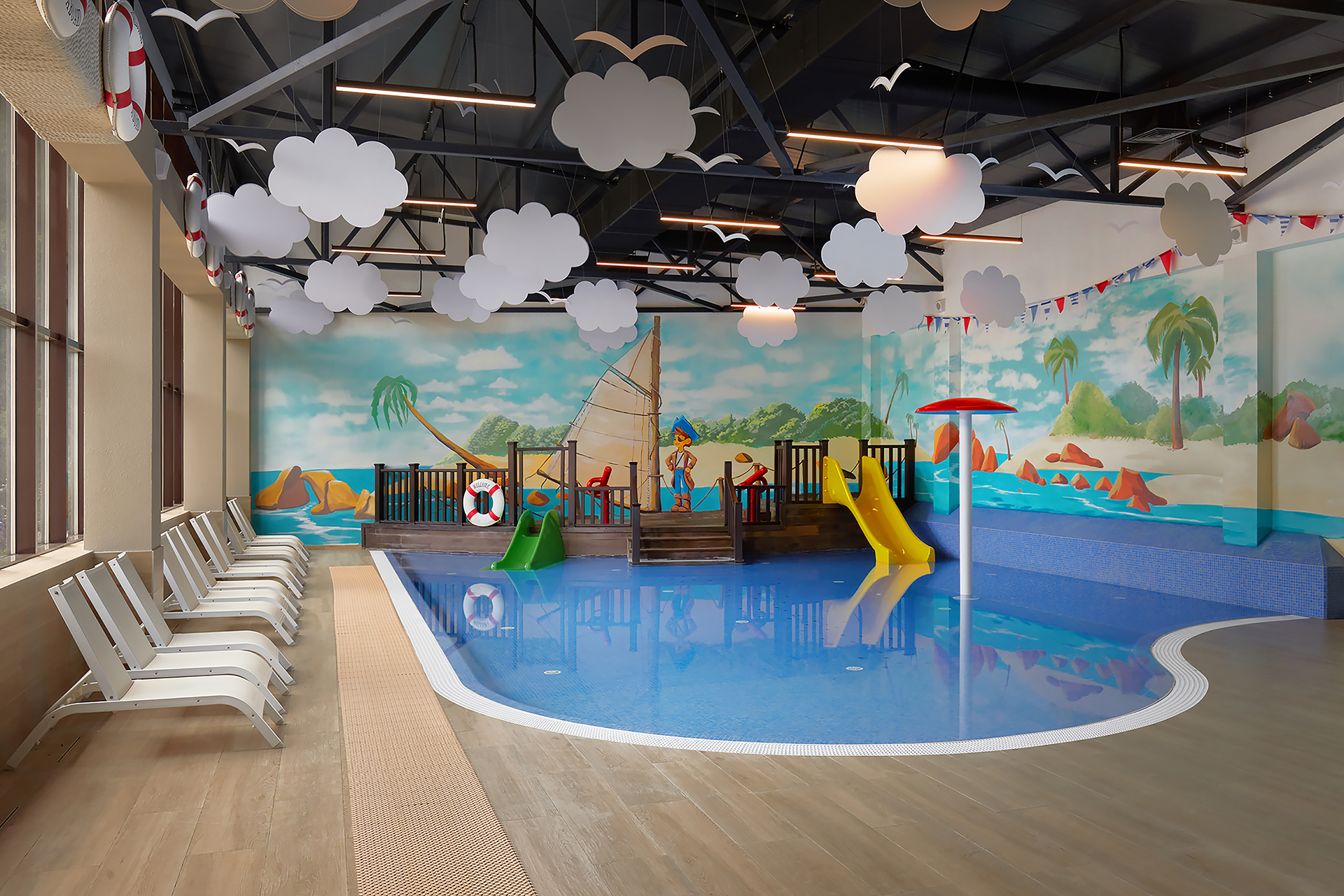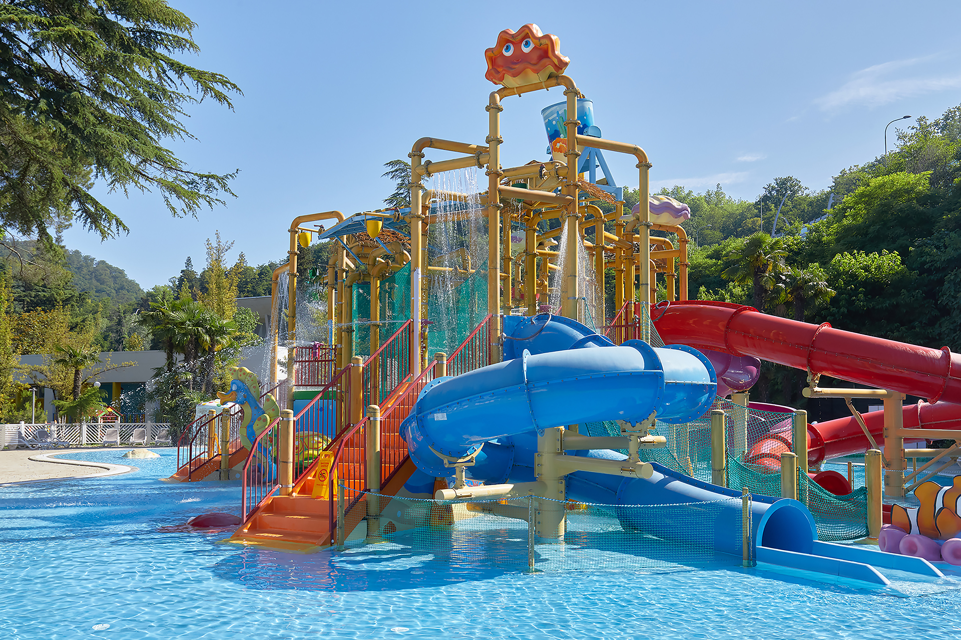 - детский бассейн: открытый бассейн для детей 1-18 лет (глубина воды 0,3 м, темп. воды 26° С). 4 горки: Компактная горка, Мультислайд и две Гидротрубы;