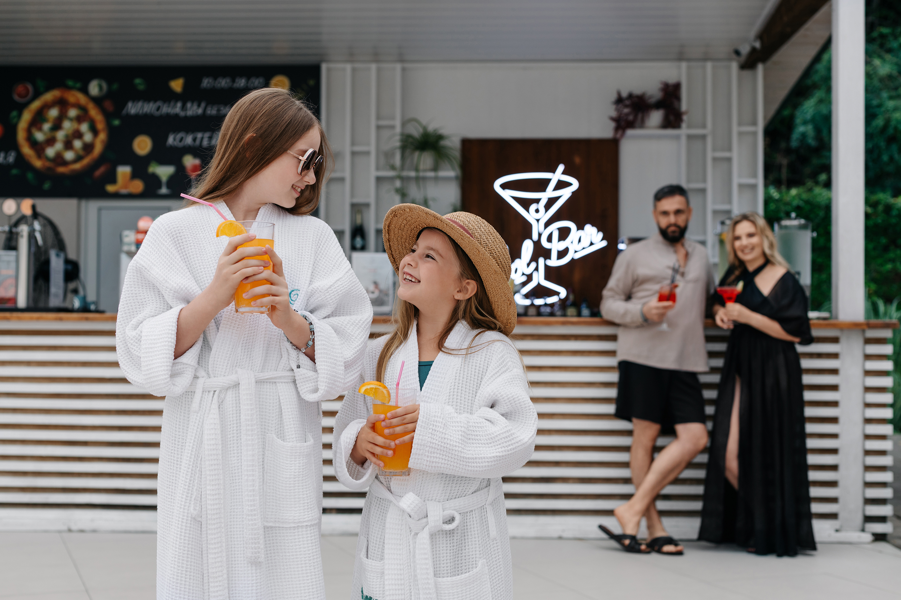 В зоне бассейна расположены снек-бар, где можно перекусить пиццей и фруктами, и бар c прохладительными напитками и коктейлями.
