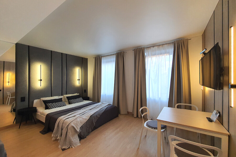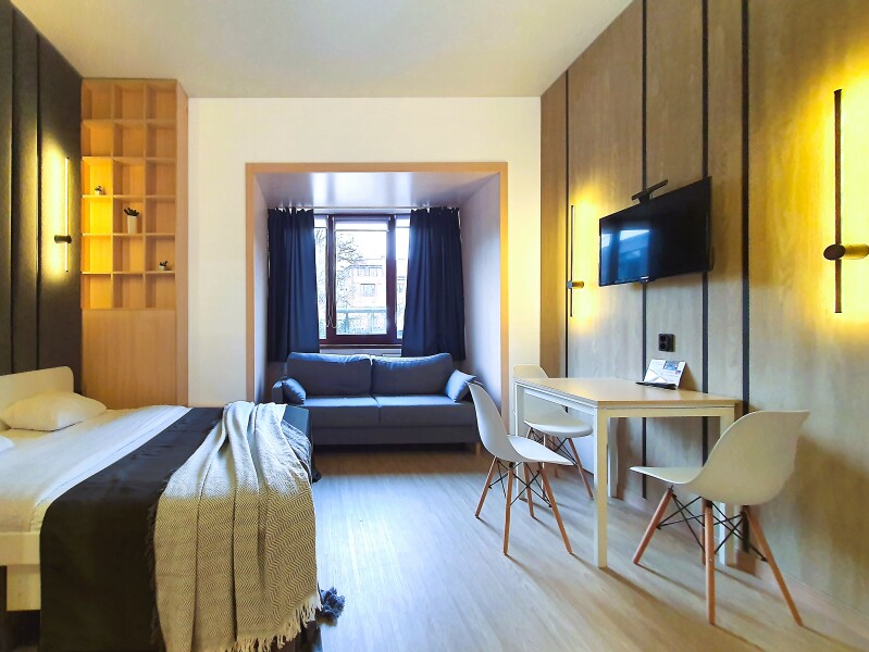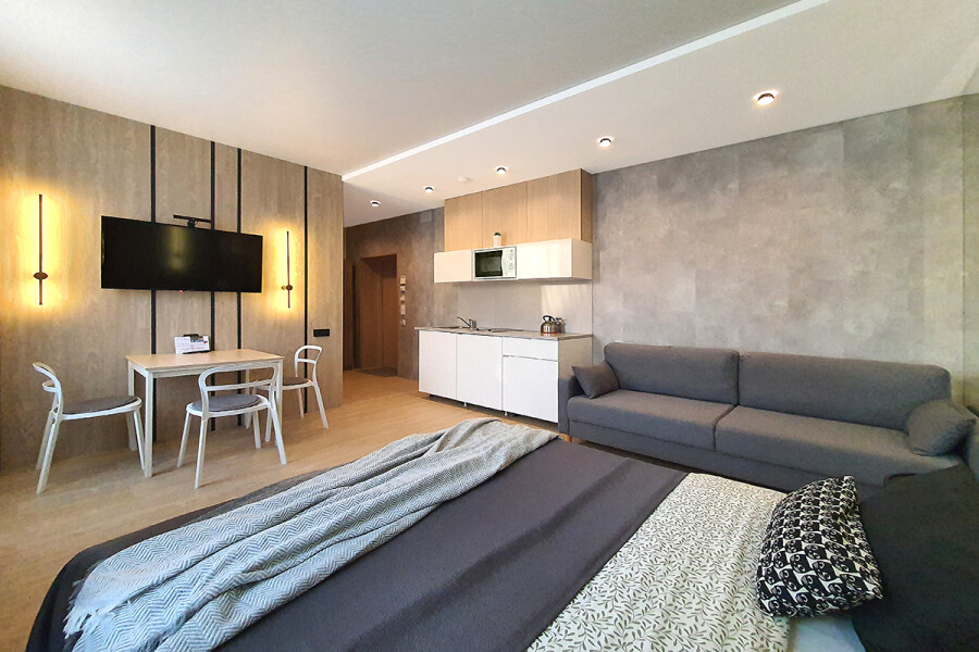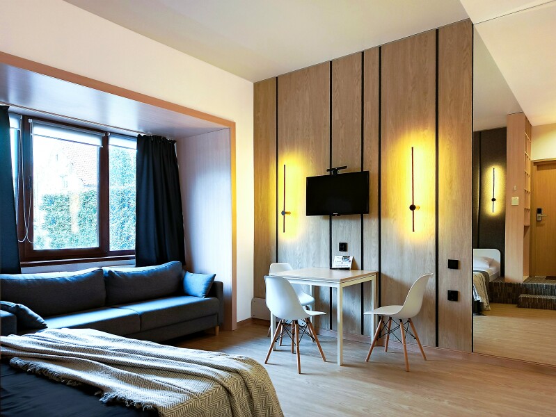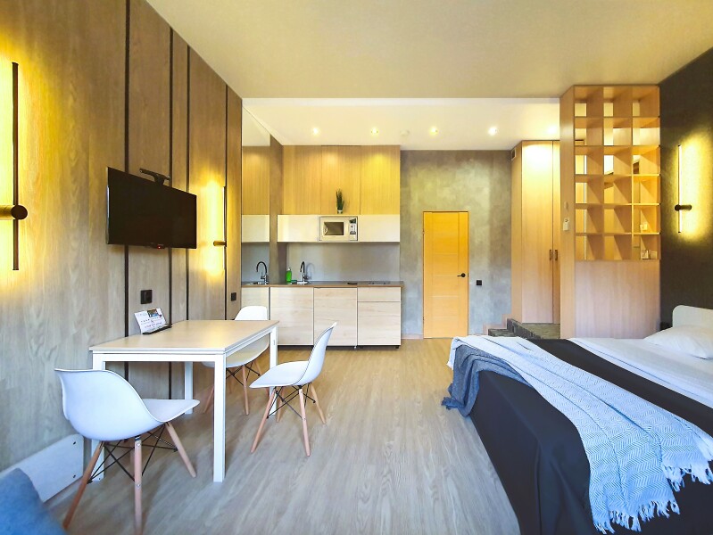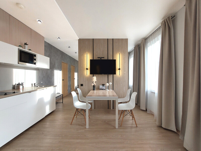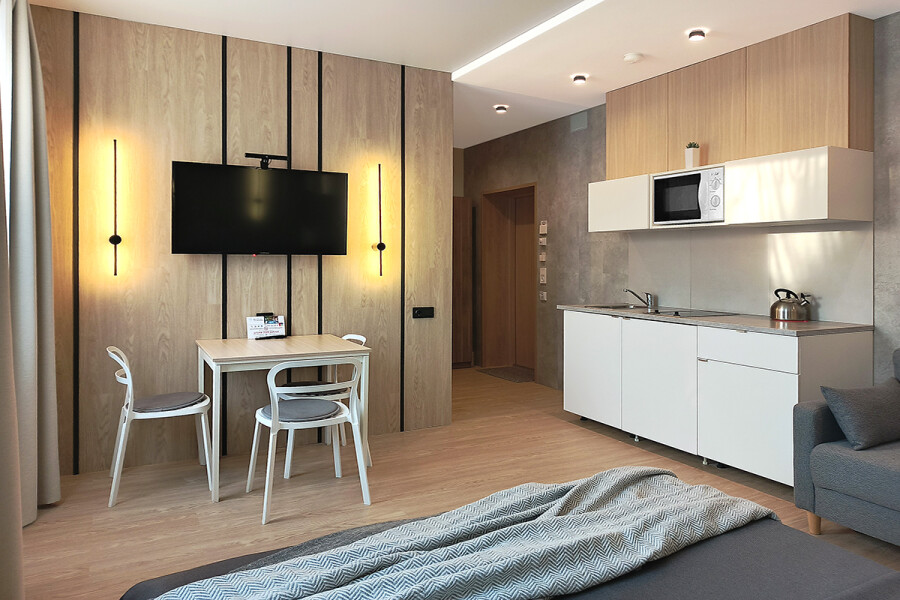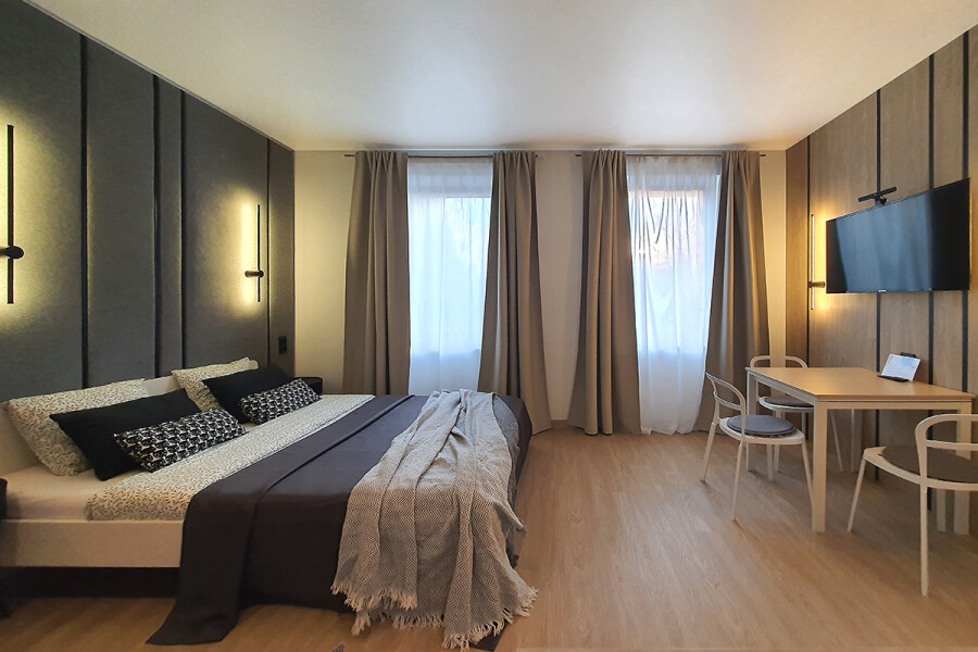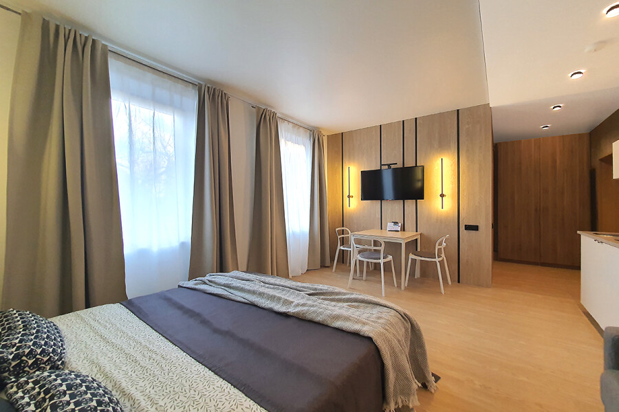 Небольшое двухэтажное здание отеля располагается на озелененной благоустроенной территории. В распоряжении гостей просторные номера-апартаменты со светлыми стильными интерьерами. Все номера оснащены мини-кухней, которая, в свою очередь, укомплектована всей необходимой посудой и техникой, в том числе в номерах есть стиральные машины. А в санузлах, оборудованных душем или ванной, для гостей подготовлены наборы косметических принадлежностей.