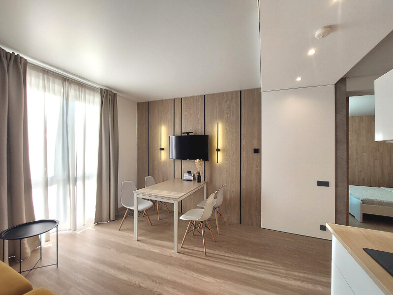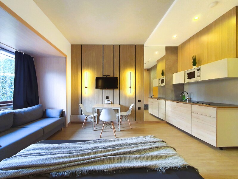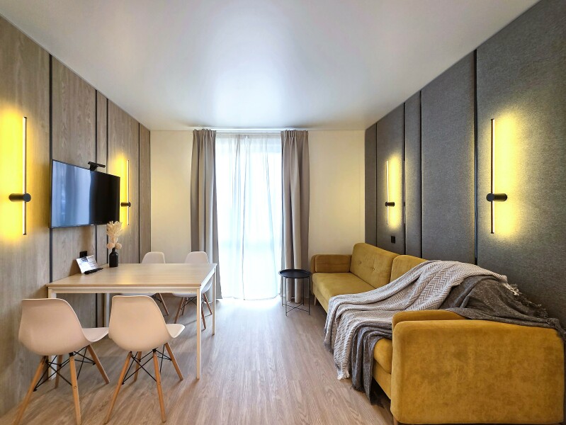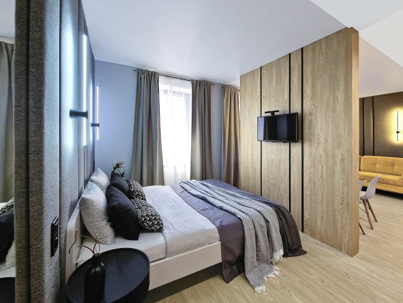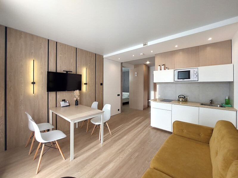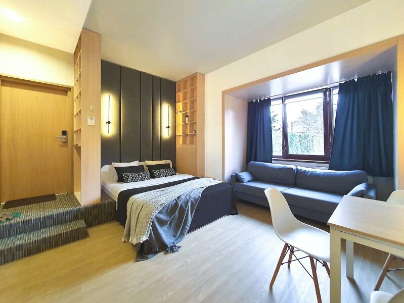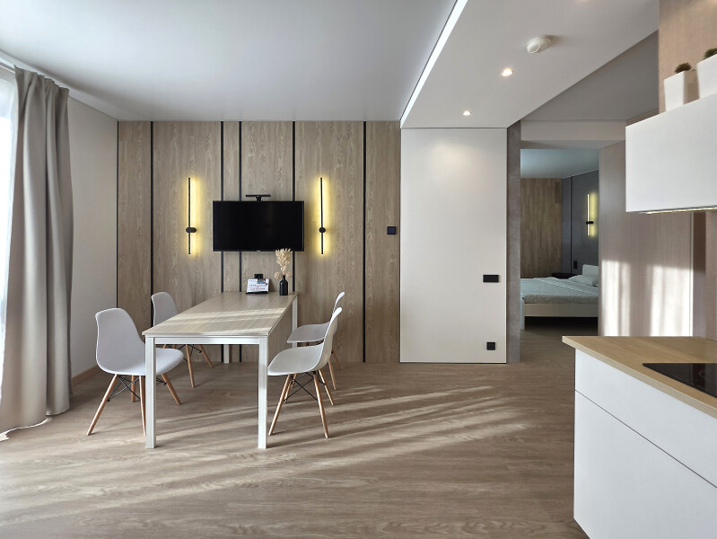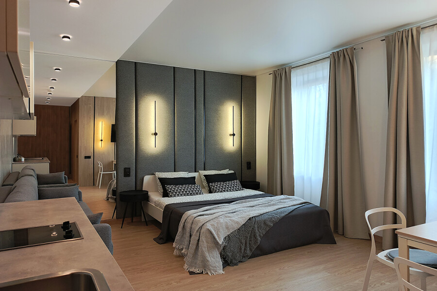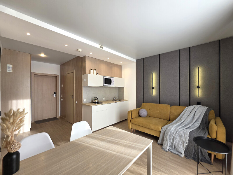 Небольшое двухэтажное здание отеля располагается на озелененной благоустроенной территории. В распоряжении гостей просторные номера-апартаменты со светлыми стильными интерьерами. Все номера оснащены мини-кухней, которая, в свою очередь, укомплектована всей необходимой посудой и техникой, в том числе в номерах есть стиральные машины. А в санузлах, оборудованных душем или ванной, для гостей подготовлены наборы косметических принадлежностей.