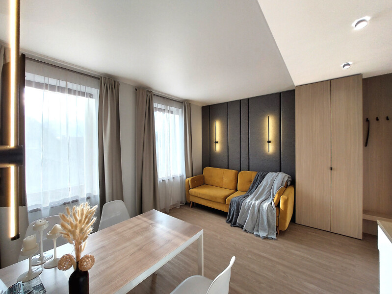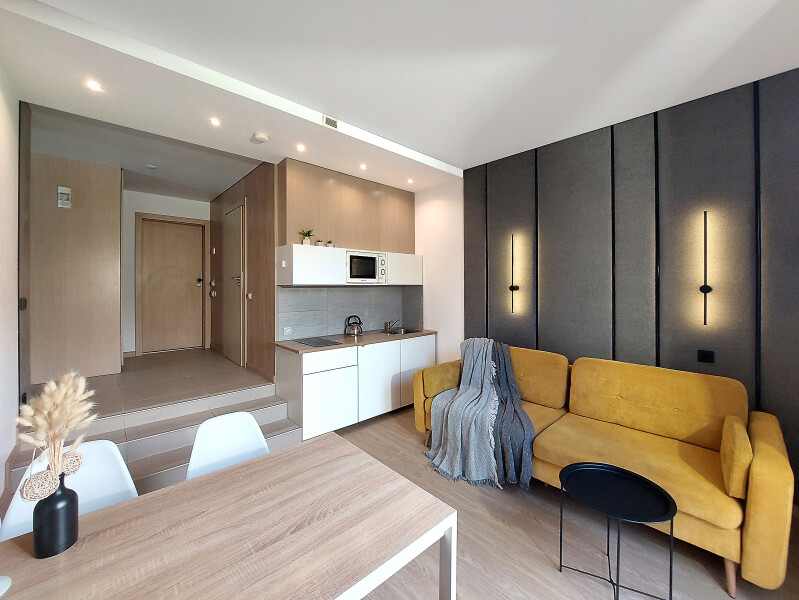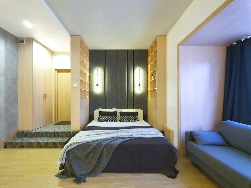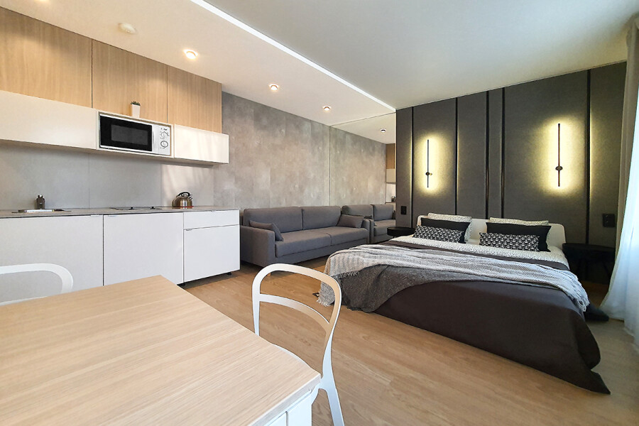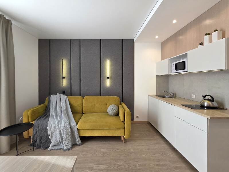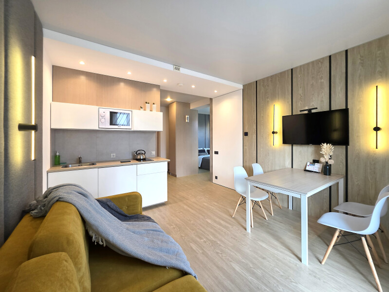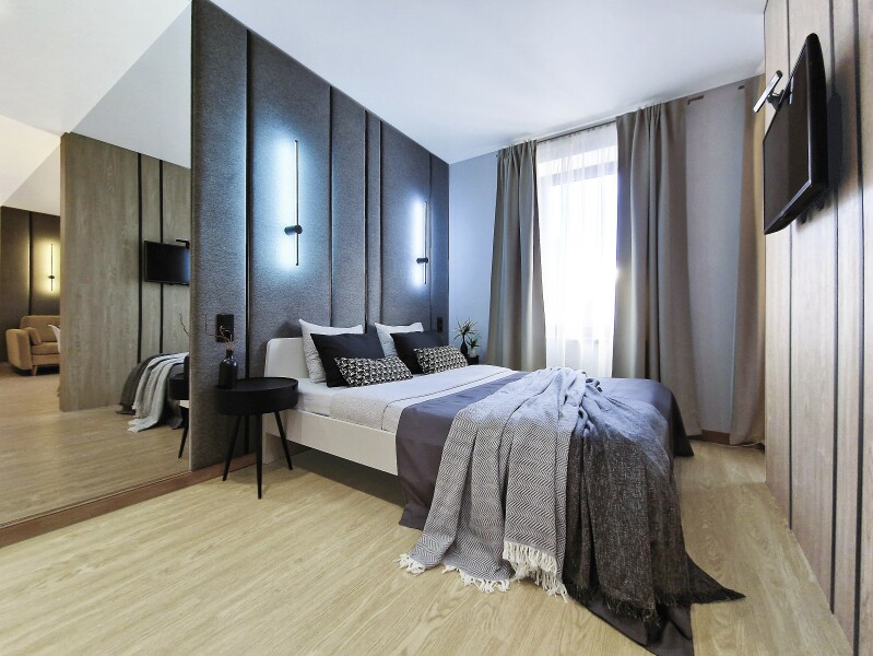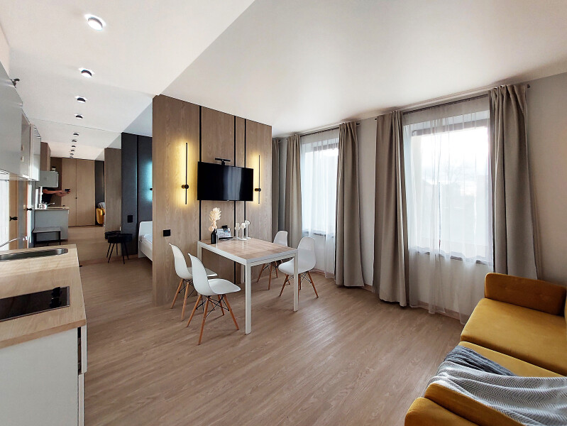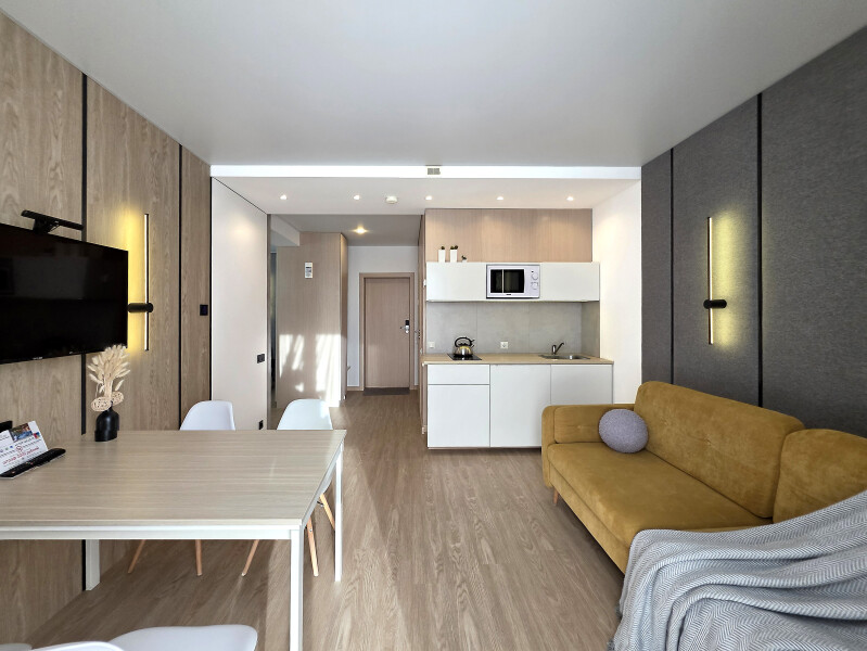 Небольшое двухэтажное здание отеля располагается на озелененной благоустроенной территории. В распоряжении гостей просторные номера-апартаменты со светлыми стильными интерьерами. Все номера оснащены мини-кухней, которая, в свою очередь, укомплектована всей необходимой посудой и техникой, в том числе в номерах есть стиральные машины. А в санузлах, оборудованных душем или ванной, для гостей подготовлены наборы косметических принадлежностей.