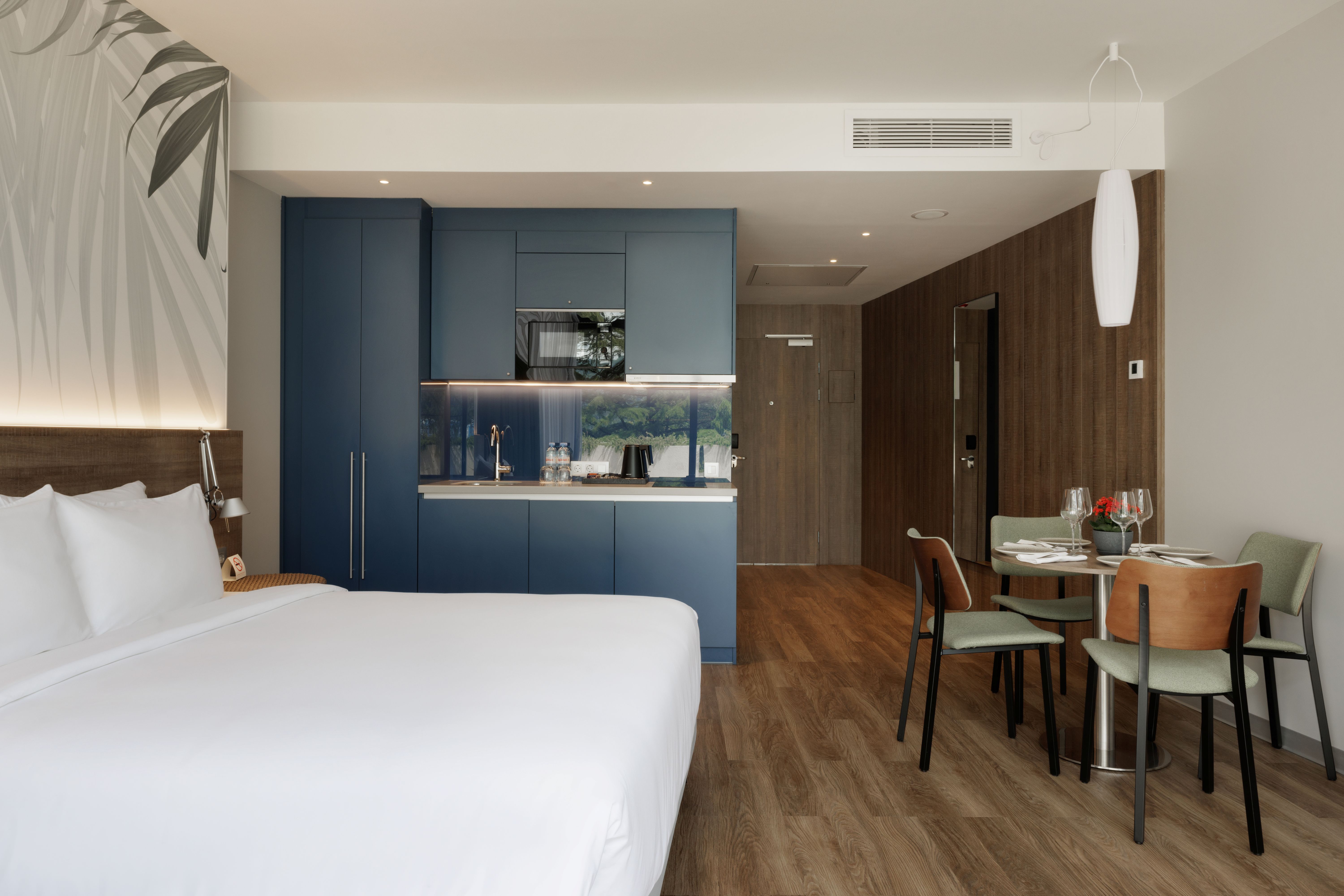 кондиционер: ; микроволновая печь: ; набор посуды: ; плита индукционная: ; посудомоечная машина: ; сейф: ; телевизор ЖК: ; телефон: ; умная колонка: ; чайная станция: ; электрочайник: ;
