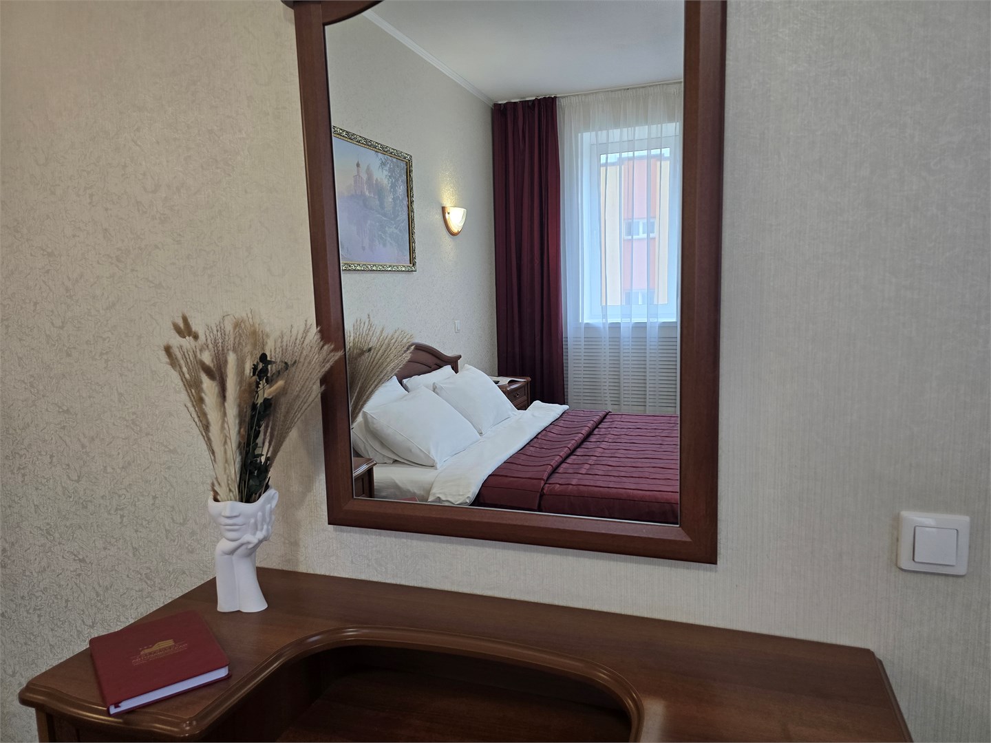вешалка: ; зеркало: ; кровать двуспальная: ; прикроватные тумбочки: ; стол: ; стулья: ; шкаф: ;