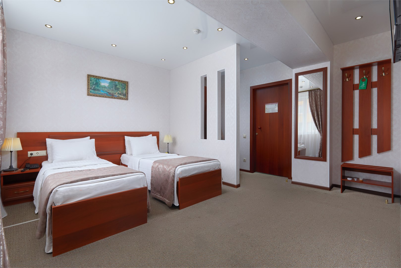 вешалка: ; зеркало: ; кровати односпальные: ; прикроватные тумбочки: ; стол: ; стулья: ; шкаф: ;
