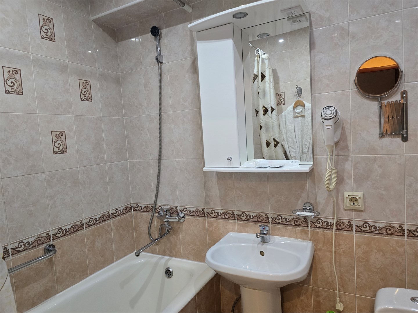 с душем: ; тапочки: ; туалетные принадлежности: ; фен: ; халат: ;
