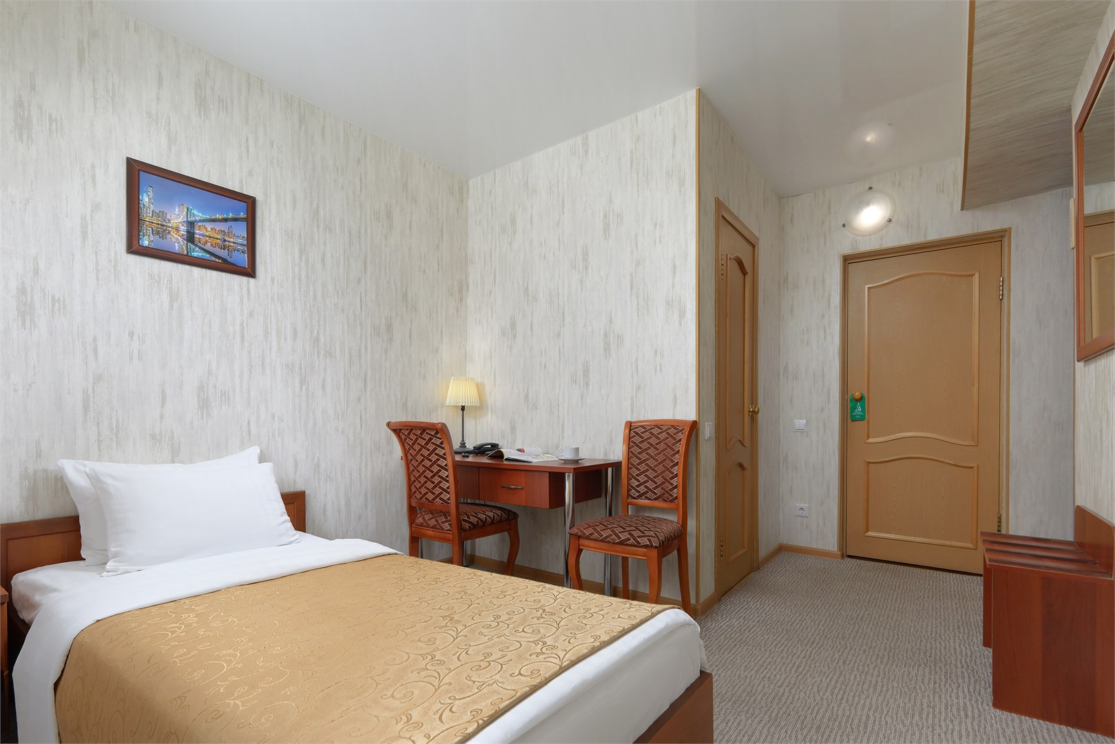 вешалка: ; зеркало: ; кровать односпальная: ; прикроватная тумбочка: ; стол: ; стул: ; шкаф: ;
