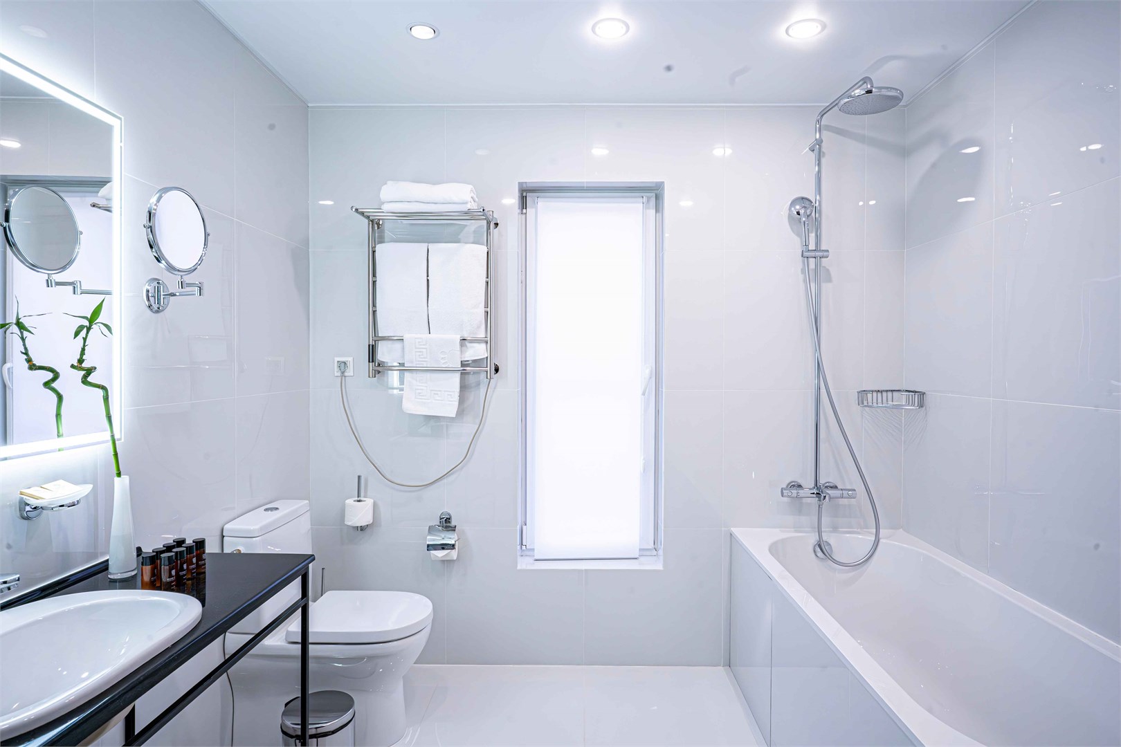 с душем или ванной: ; тапочки: ; туалетные принадлежности: ; фен: ; халат: ;