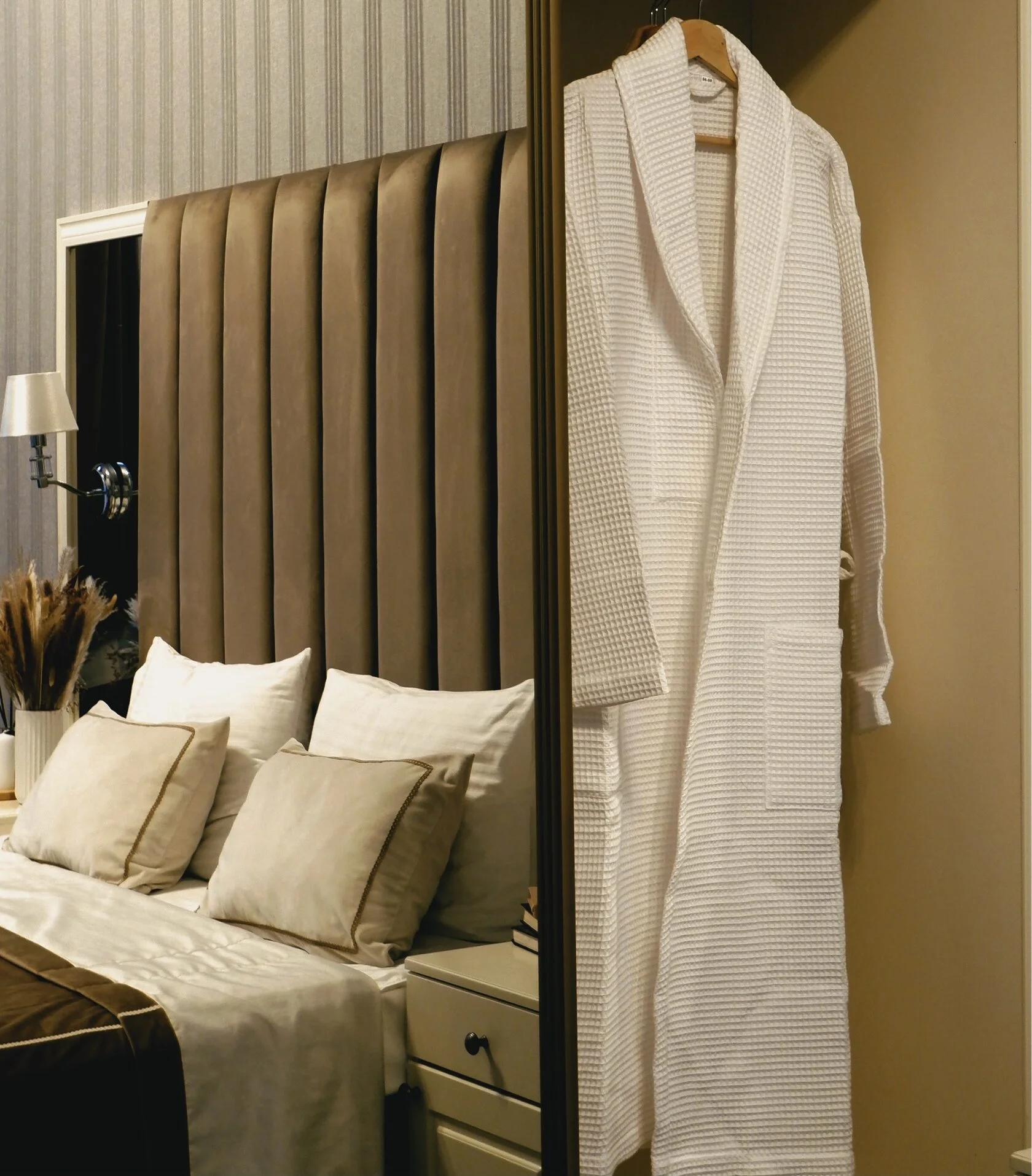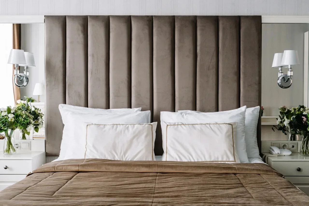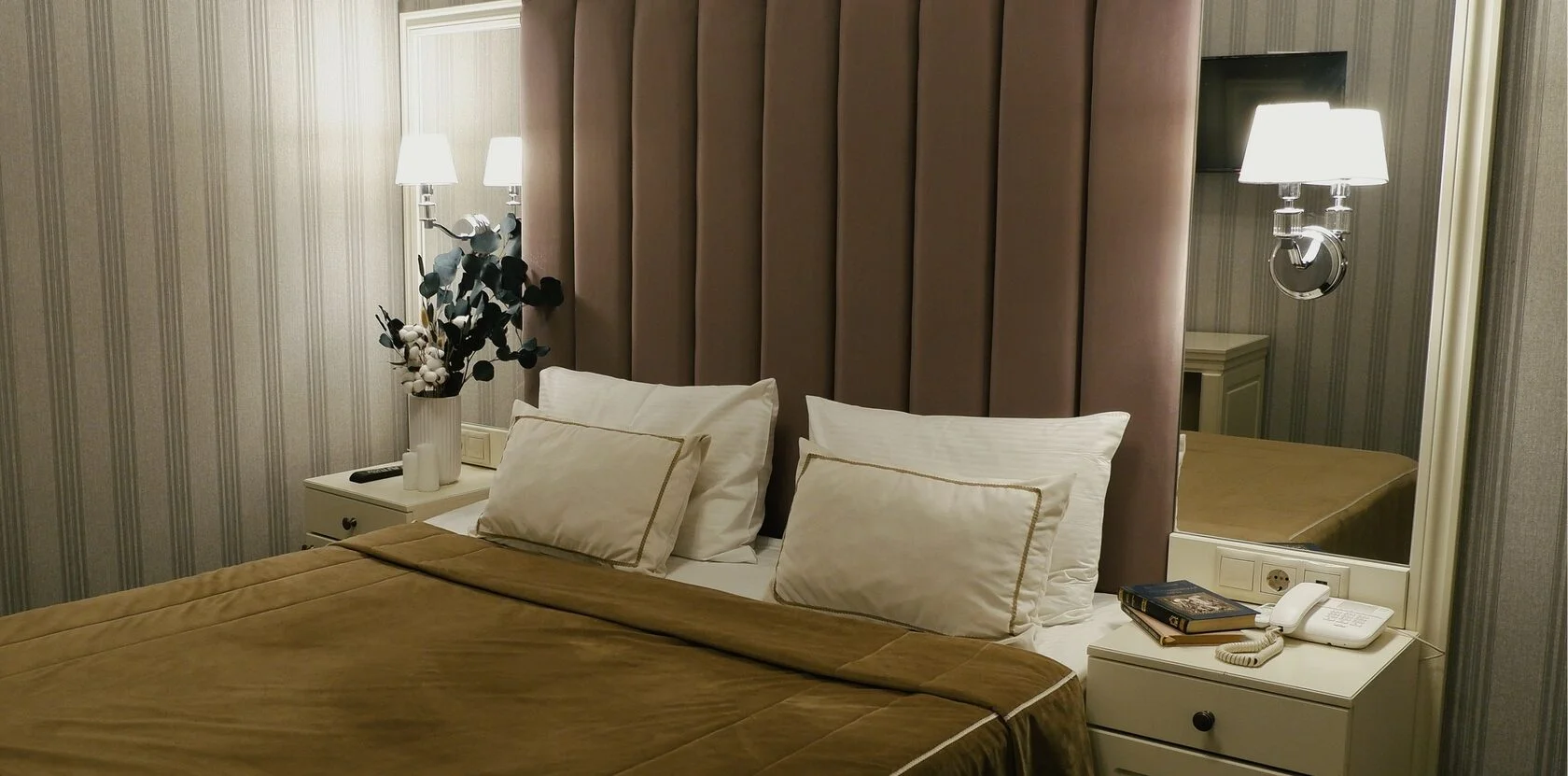 зеркало: ; кровать двуспальная: ; прикроватные тумбочки: ; стол: ; стулья: ; шкаф: ;