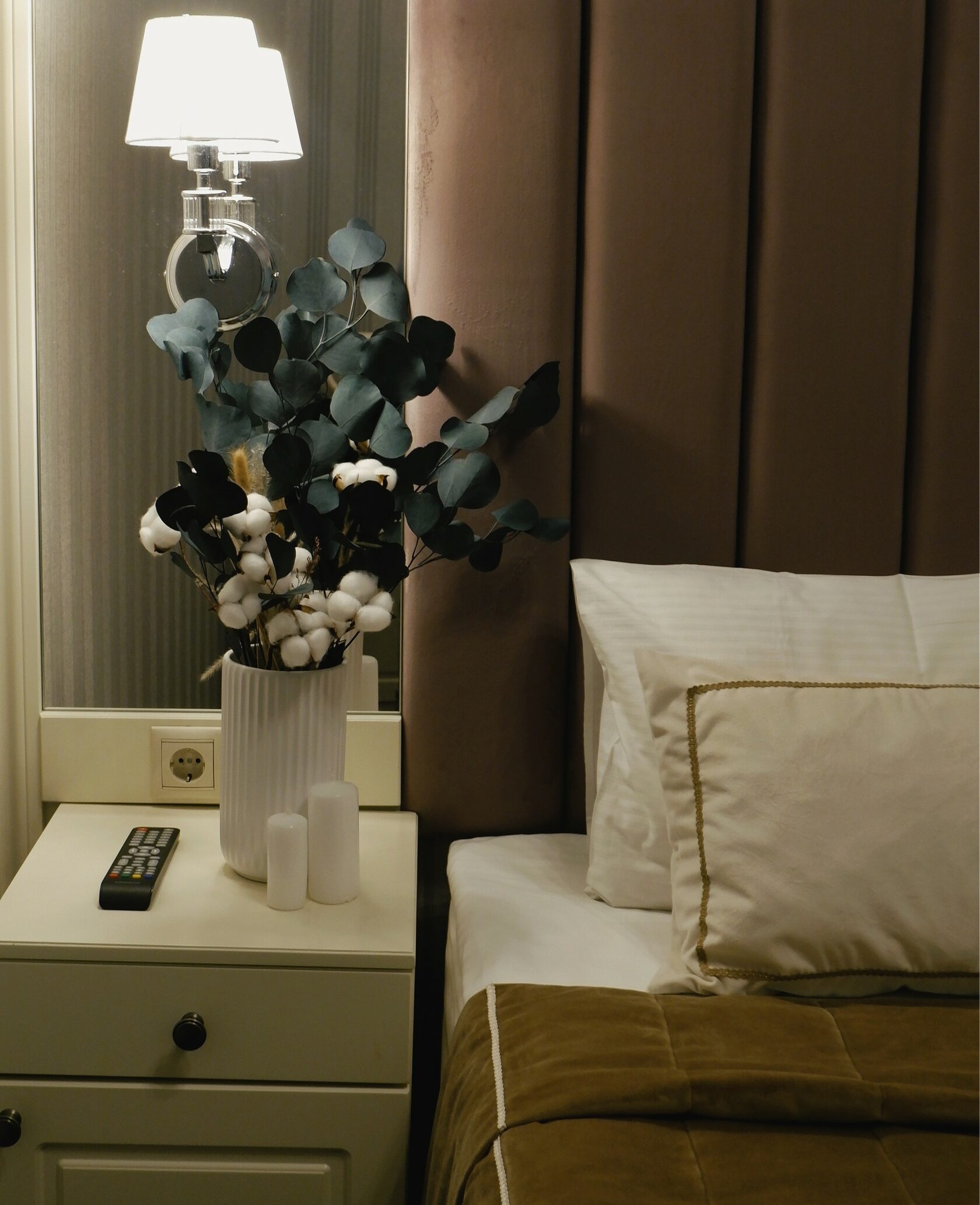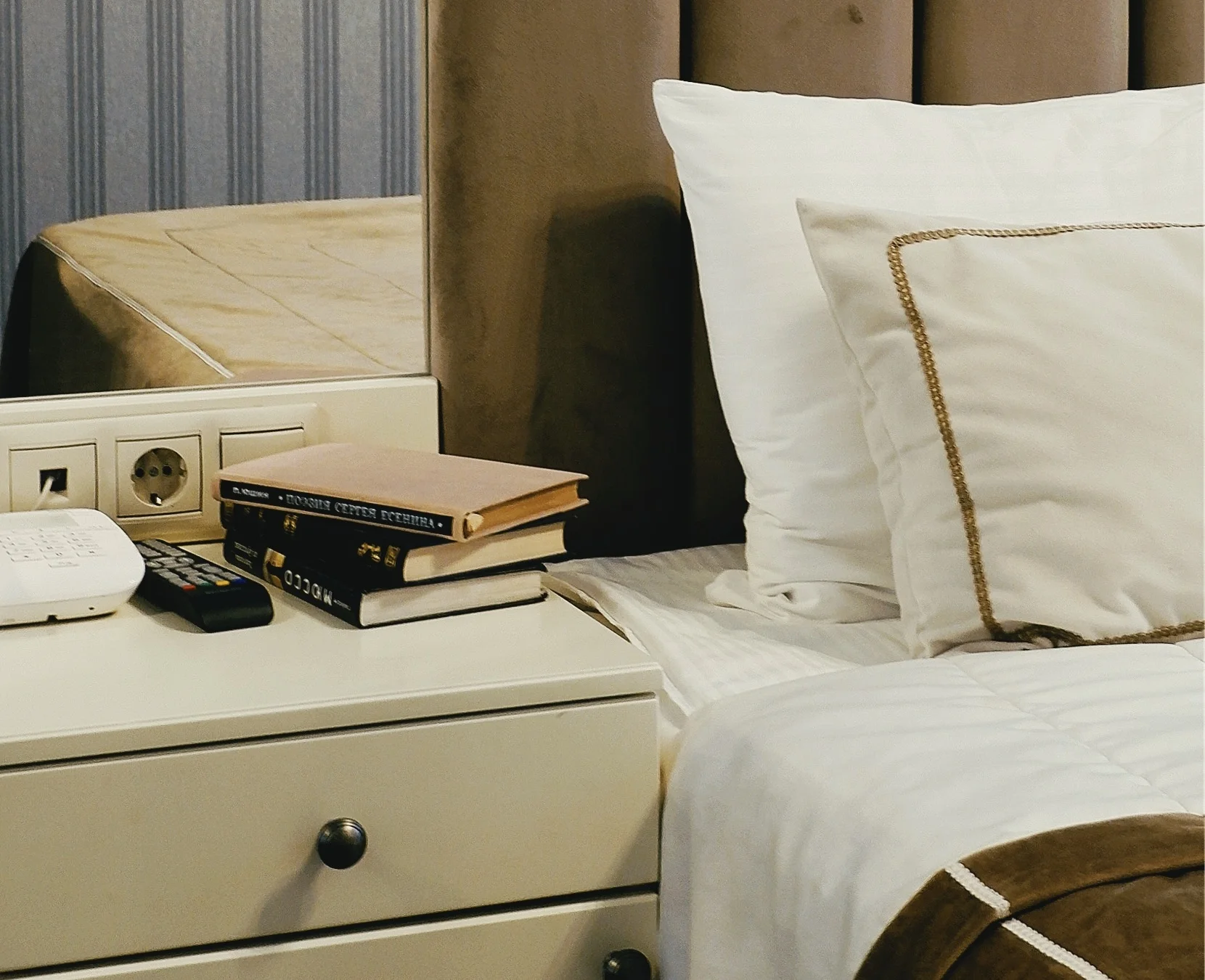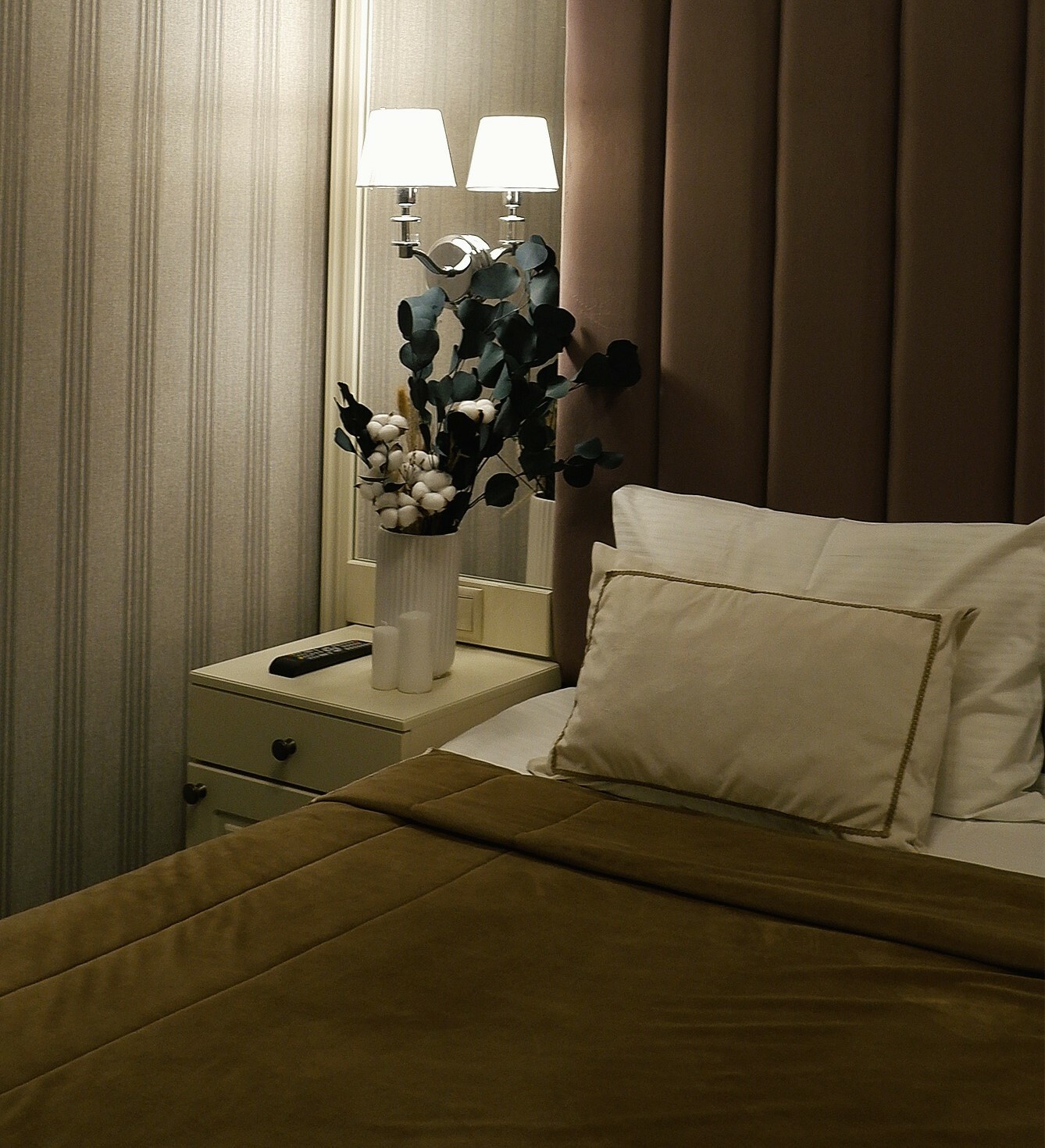 зеркало: ; кровать двуспальная: ; прикроватные тумбочки: ; стол: ; стулья: ; шкаф: ;