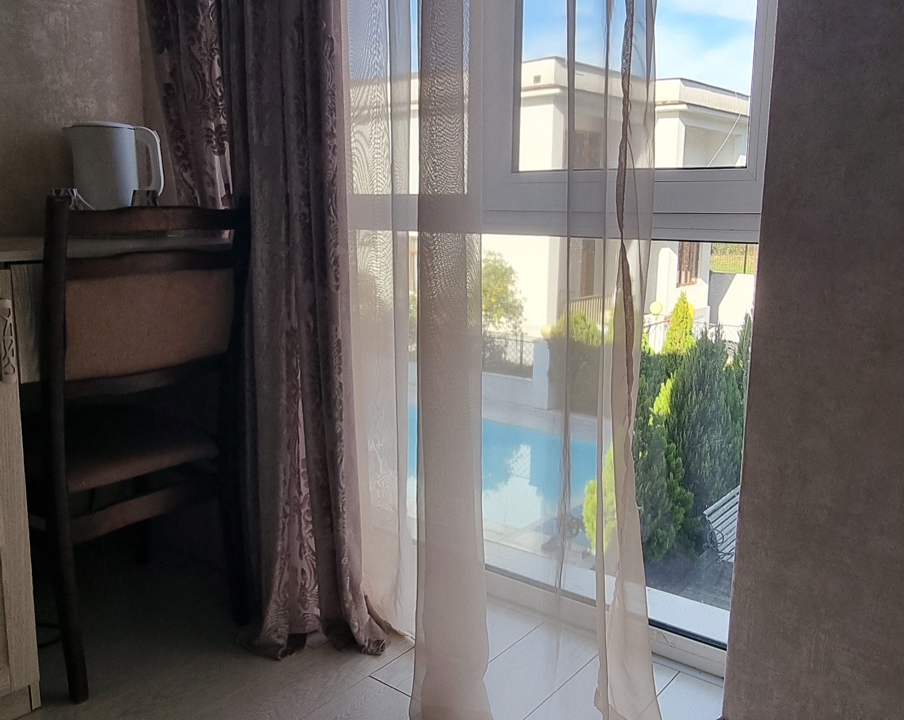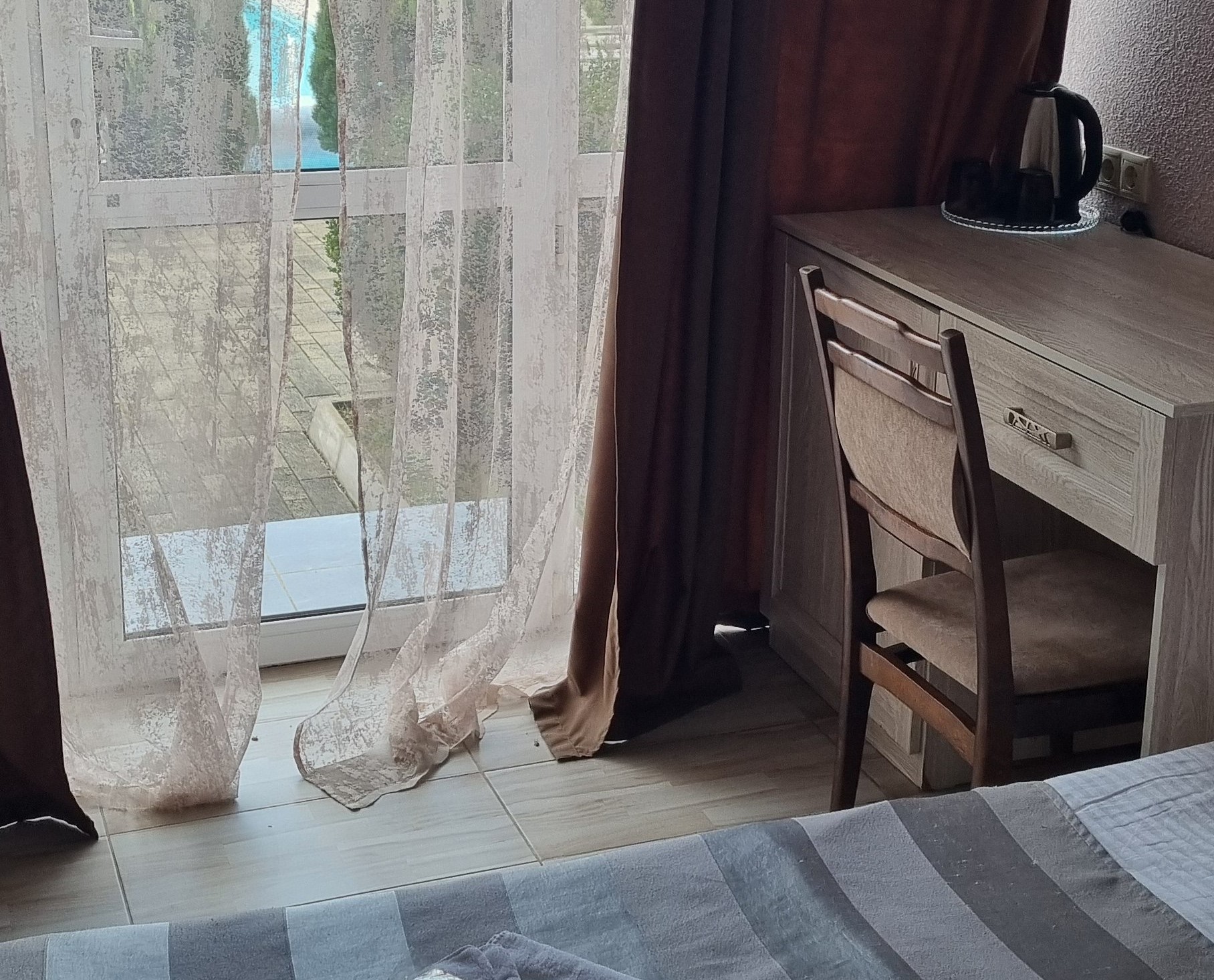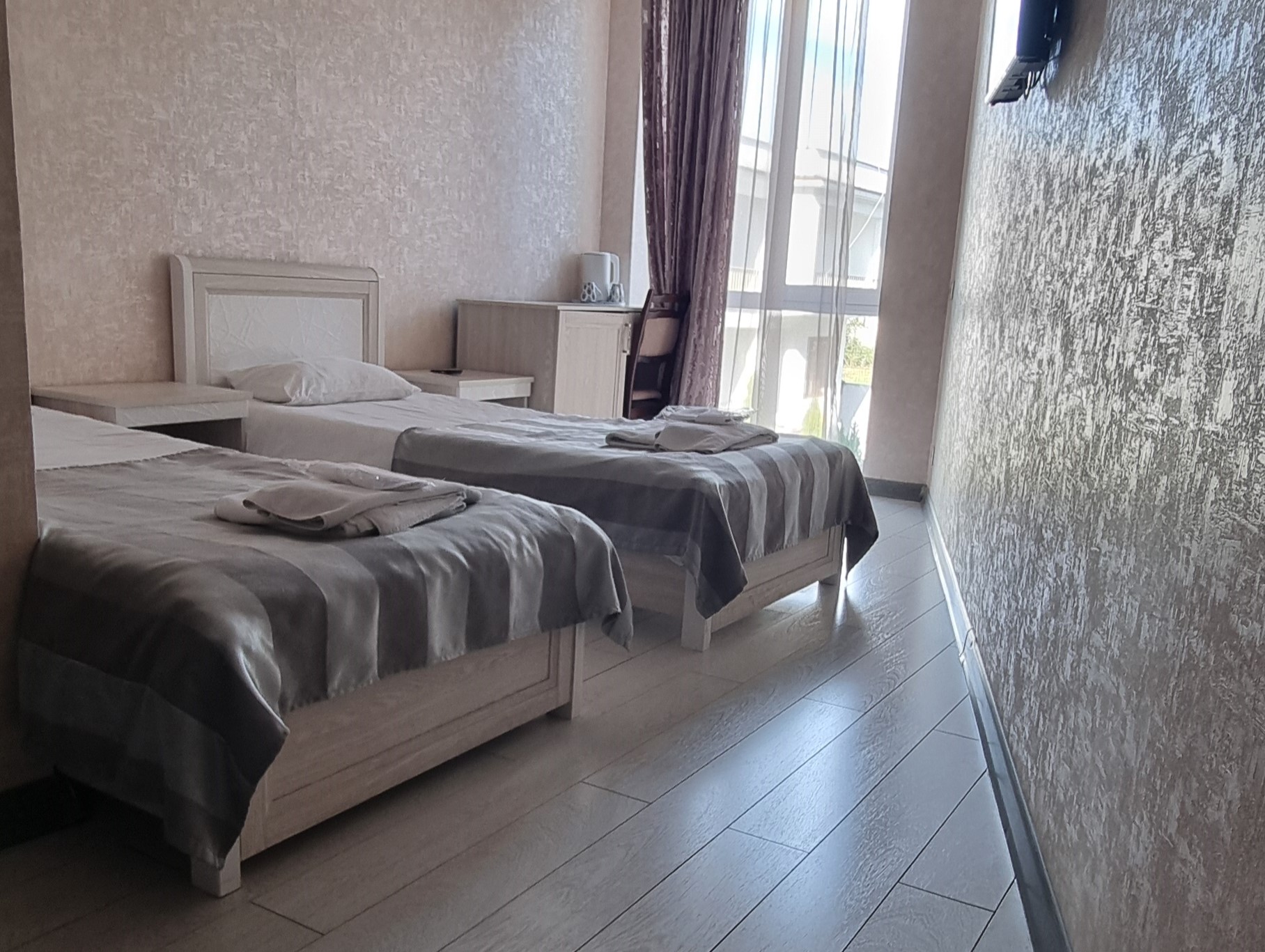 Трехэтажный корпус отеля разместился на пересечении улиц Демерджипа и Космонавтов, рядом с бальнеологической лечебницей. Гостиница включает в себя 23 двухместных номера категории Стандарт, Полулюкс, Семейный, Делюкс и Люкс. Все номера оснащены кондиционером, санузлом с душем, оборудованы необходимой бытовой техникой. В некоторых комнатах предусмотрены балконы, а на первом этаже есть отдельный выход в сад.