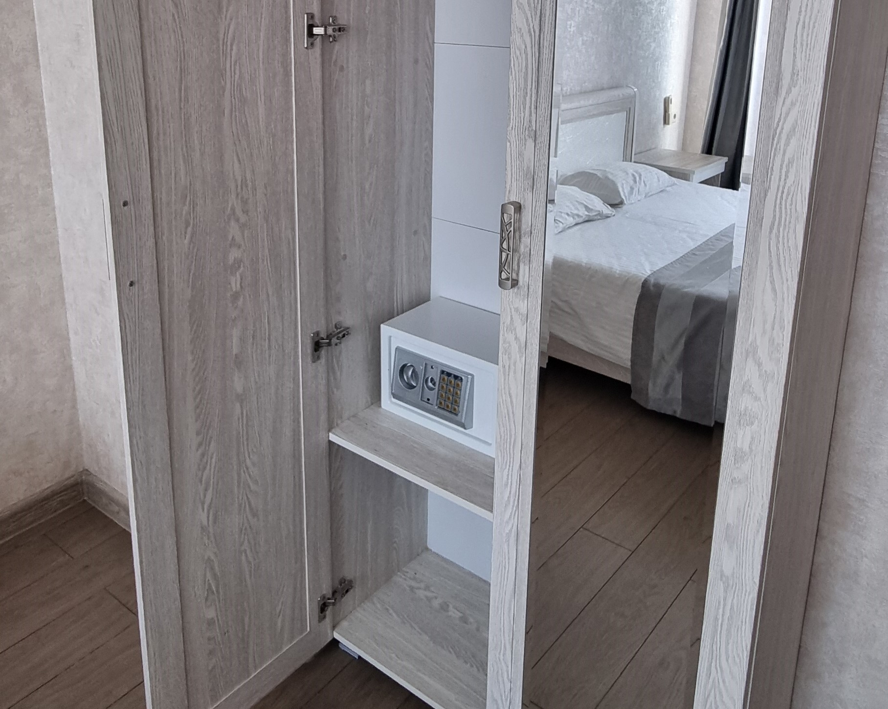 вешалка: ; диван раскладной: ; зеркало: ; кровать двуспальная: ; прикроватные тумбочки: ; стол: ; стул: ; шкаф: ;