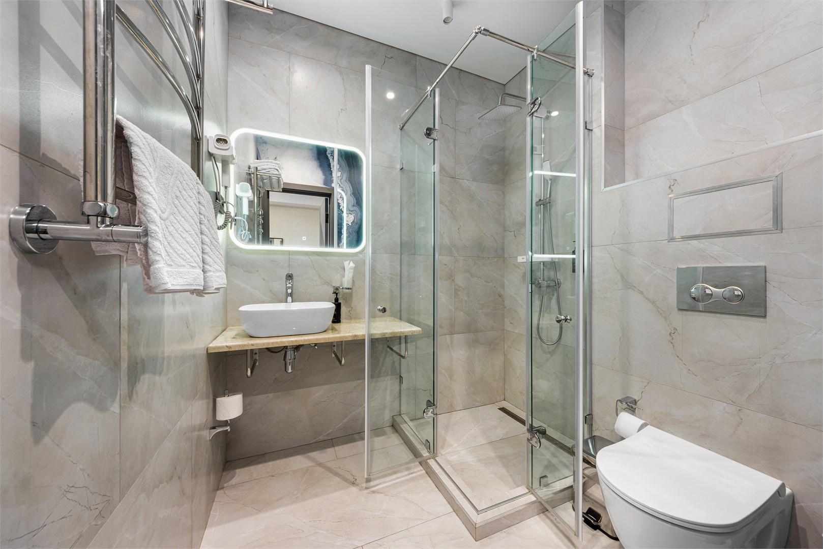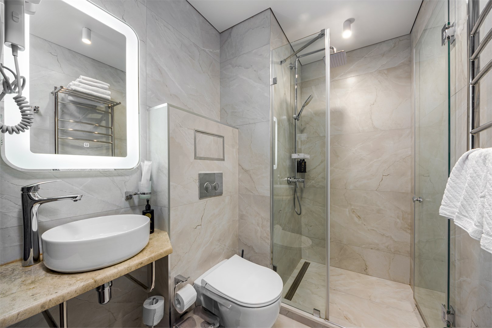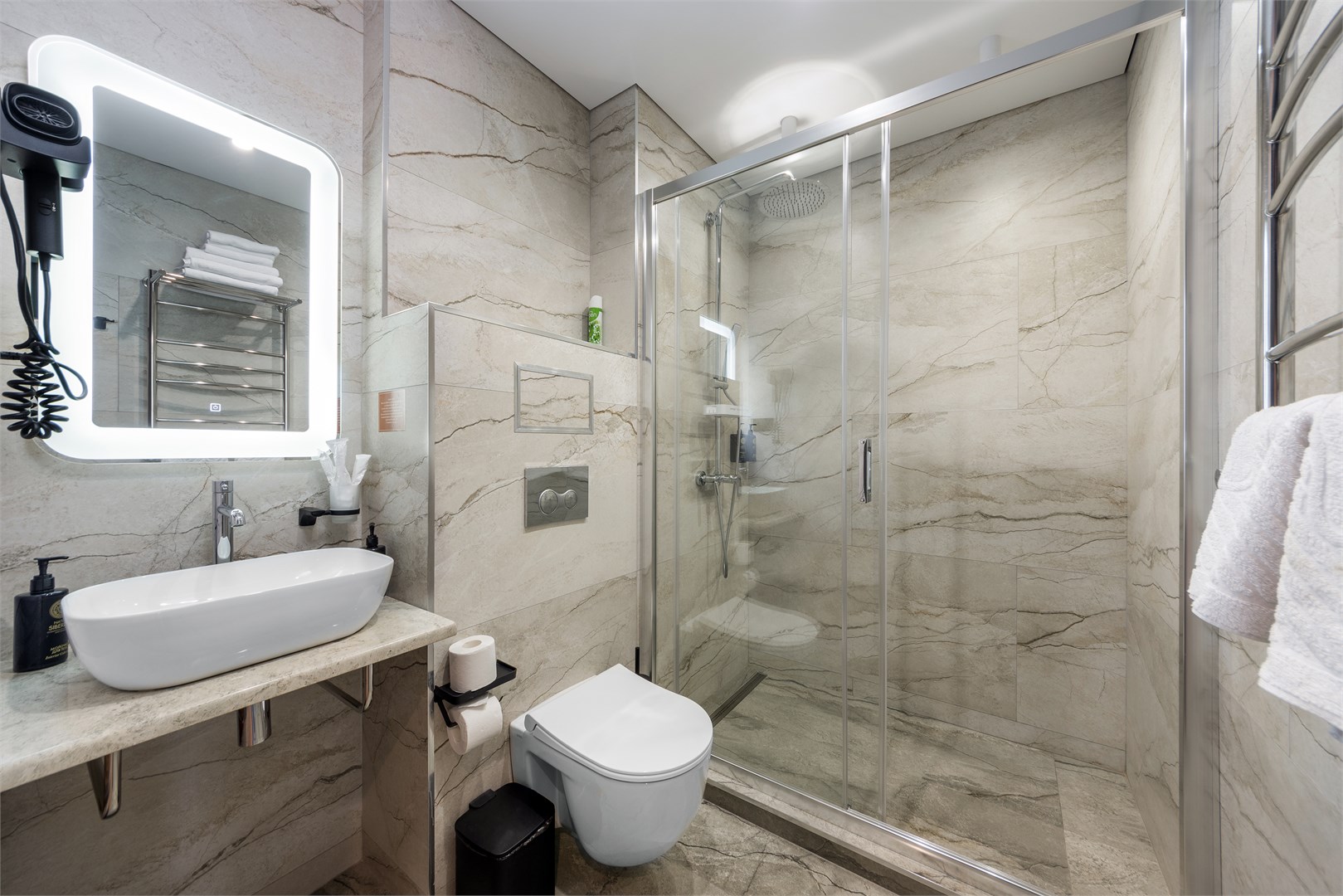 с душем: ; туалетные принадлежности: ; фен: ;
