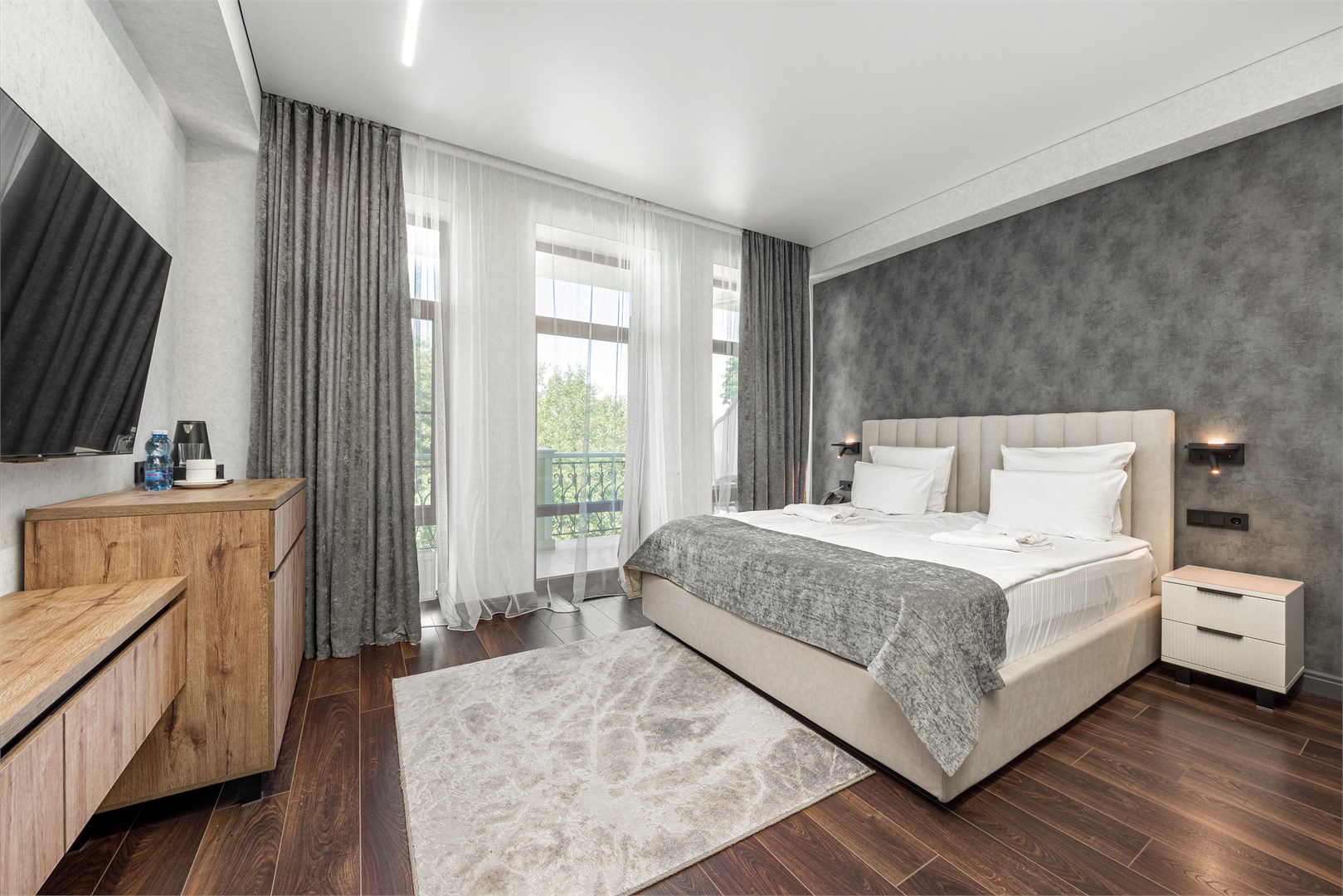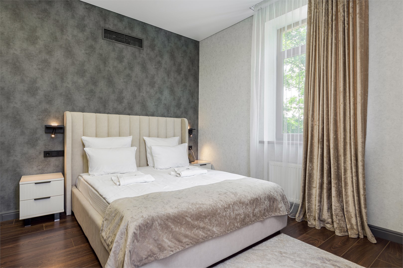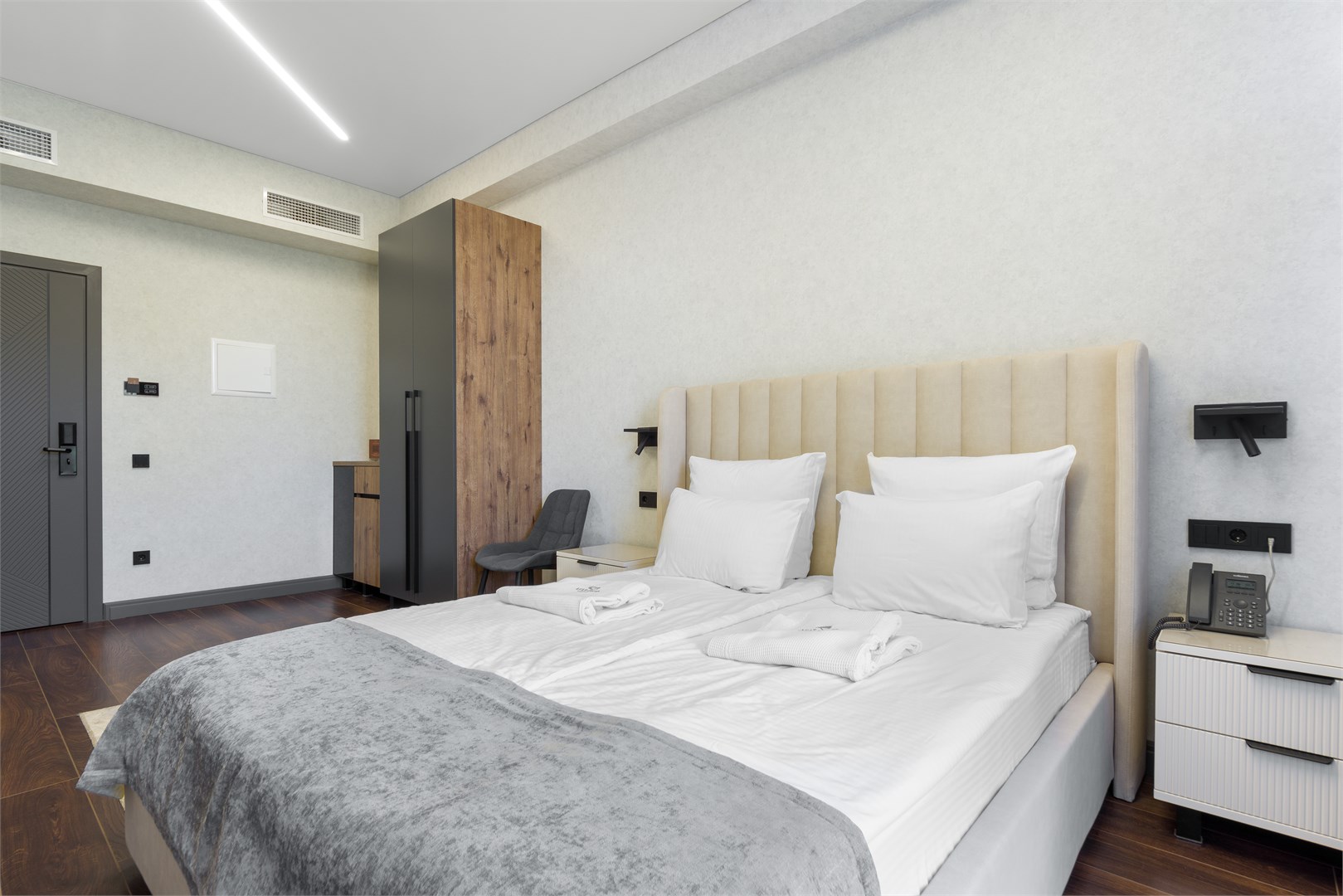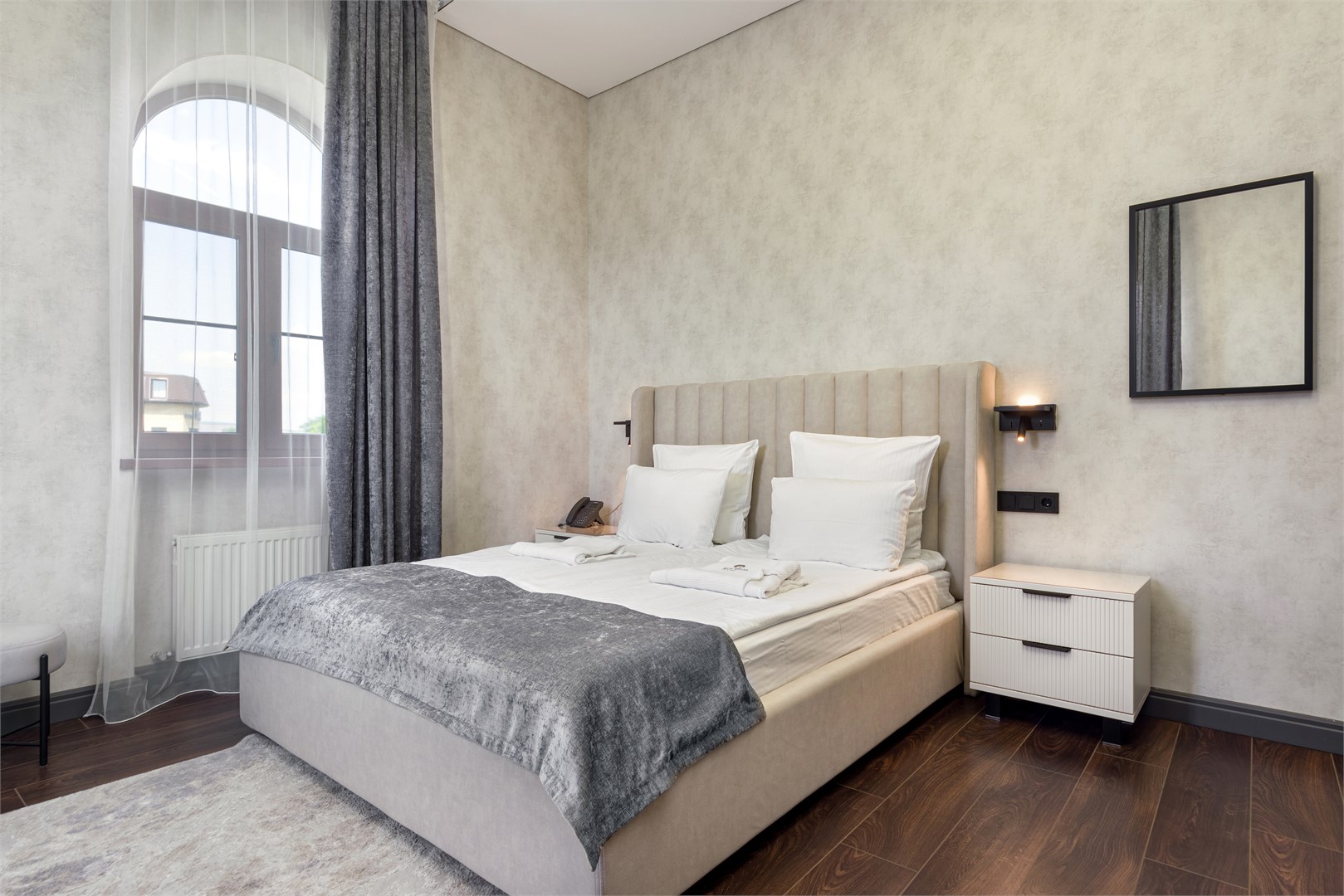 вешалка: ; зеркало: ; кровать двуспальная: ; прикроватные тумбочки: ; стол: ; стулья: ; шкаф: ;