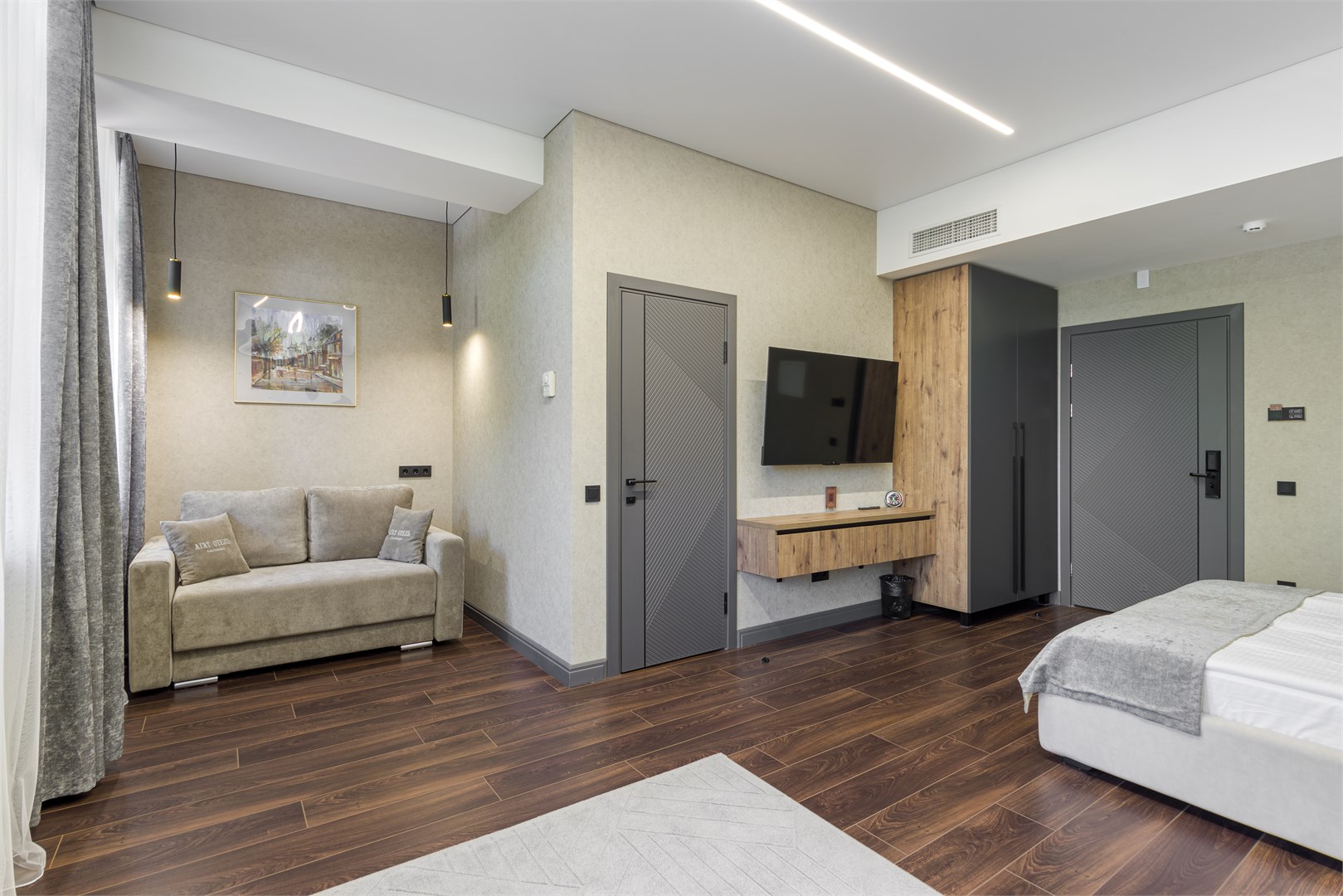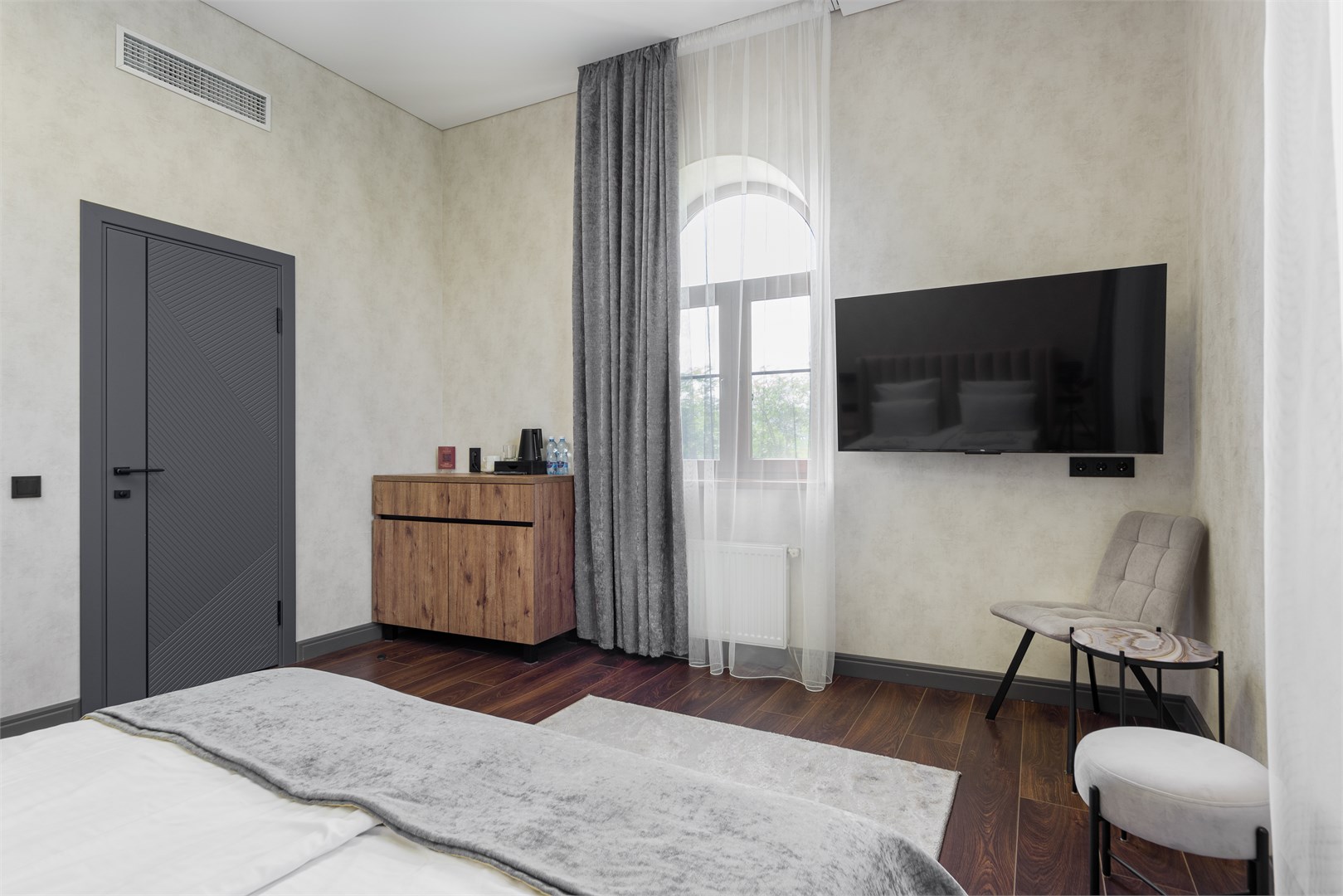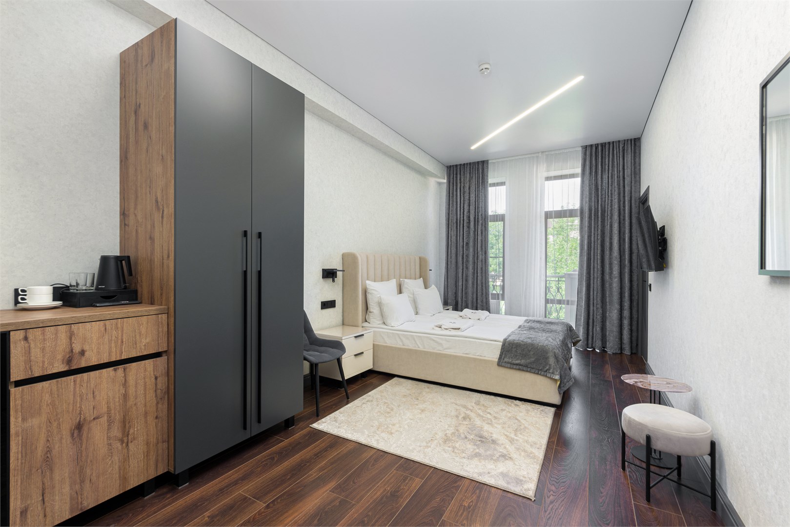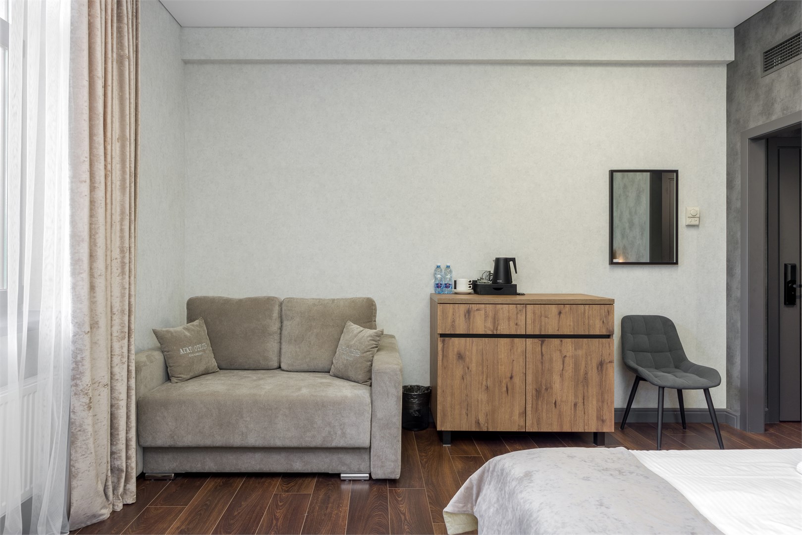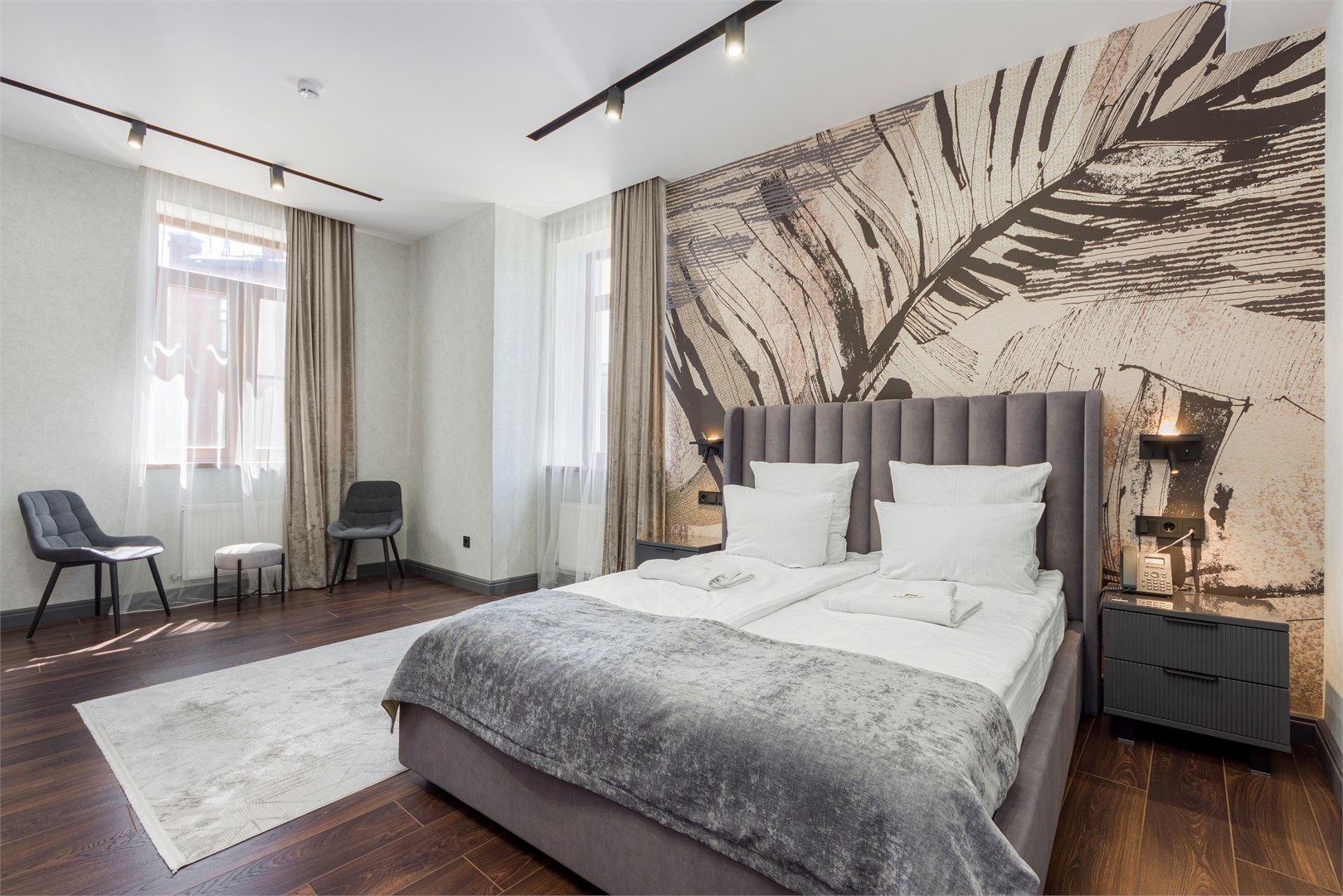 Четырехэтажное здание отеля с лифтом разместилось на одной из главных улиц города – проспекте Ленина. Жилой фонд состоит из 22 номеров разных категорий. В комнатах лаконичный интерьер, выдержанный в преимущественно серых оттенках. Каждый номер оснащен санузлом с душем, есть кондиционер, телевизор и сеть wi-fi.