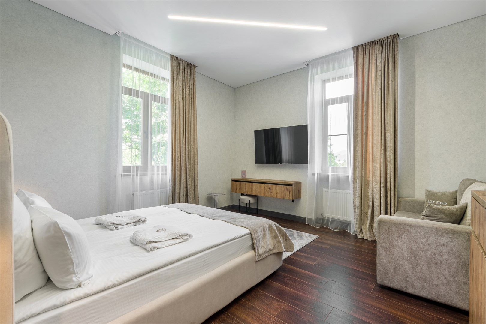 вешалка: ; диван: ; зеркало: ; кровать двуспальная: ; прикроватные тумбочки: ; стол: ; стулья: ; шкаф: ;
