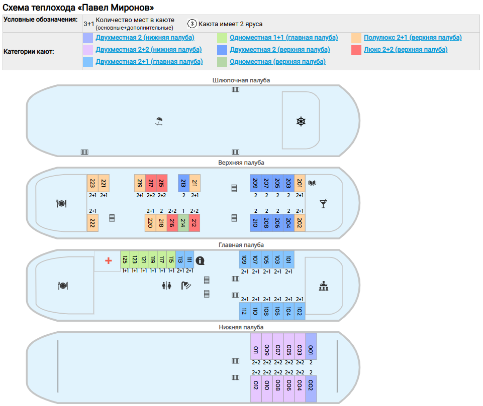 - 9 кают «Полулюкс» и 13 двухместных кают с возможностью размещения третьего гостя на дополнительном месте.