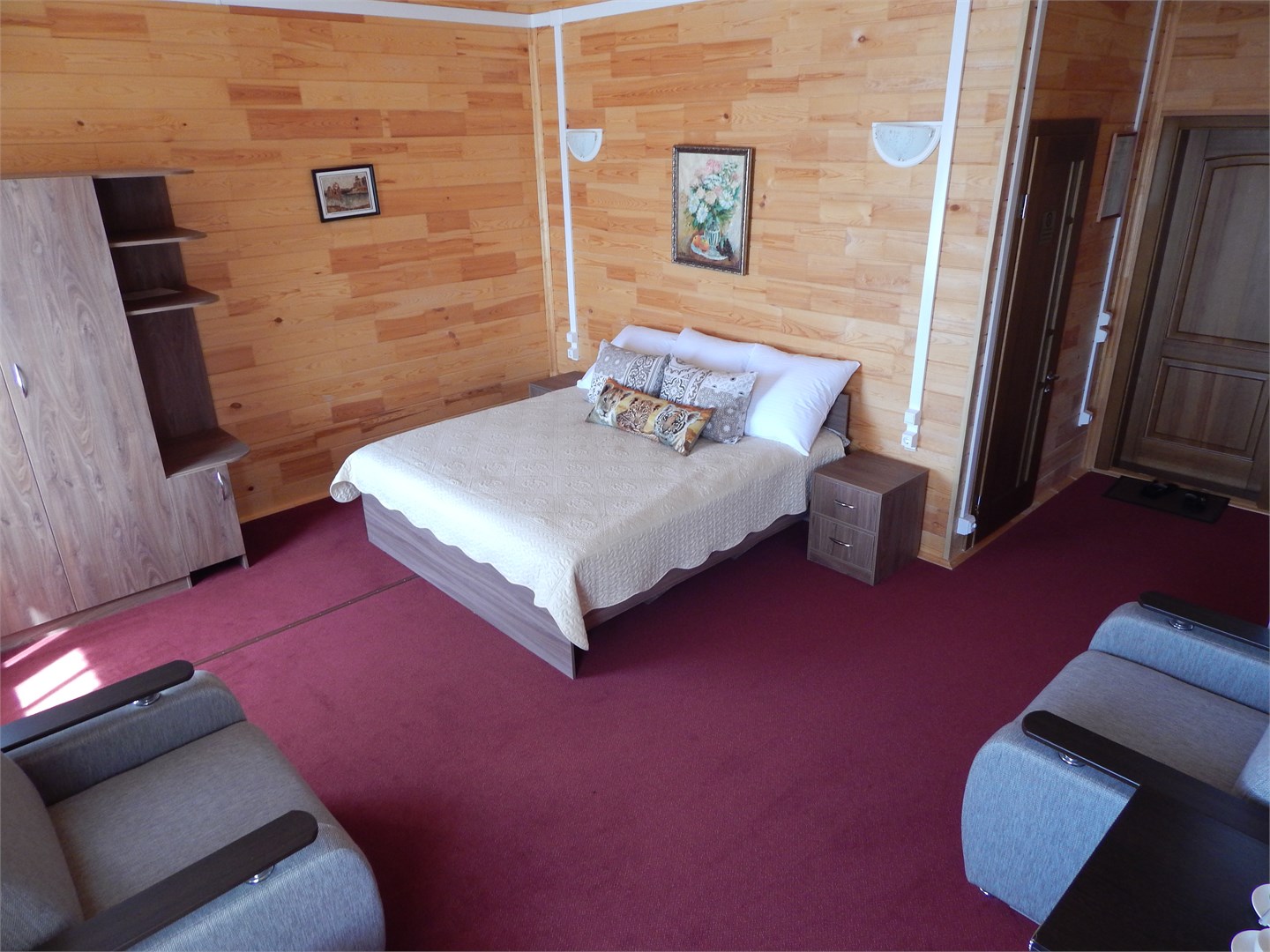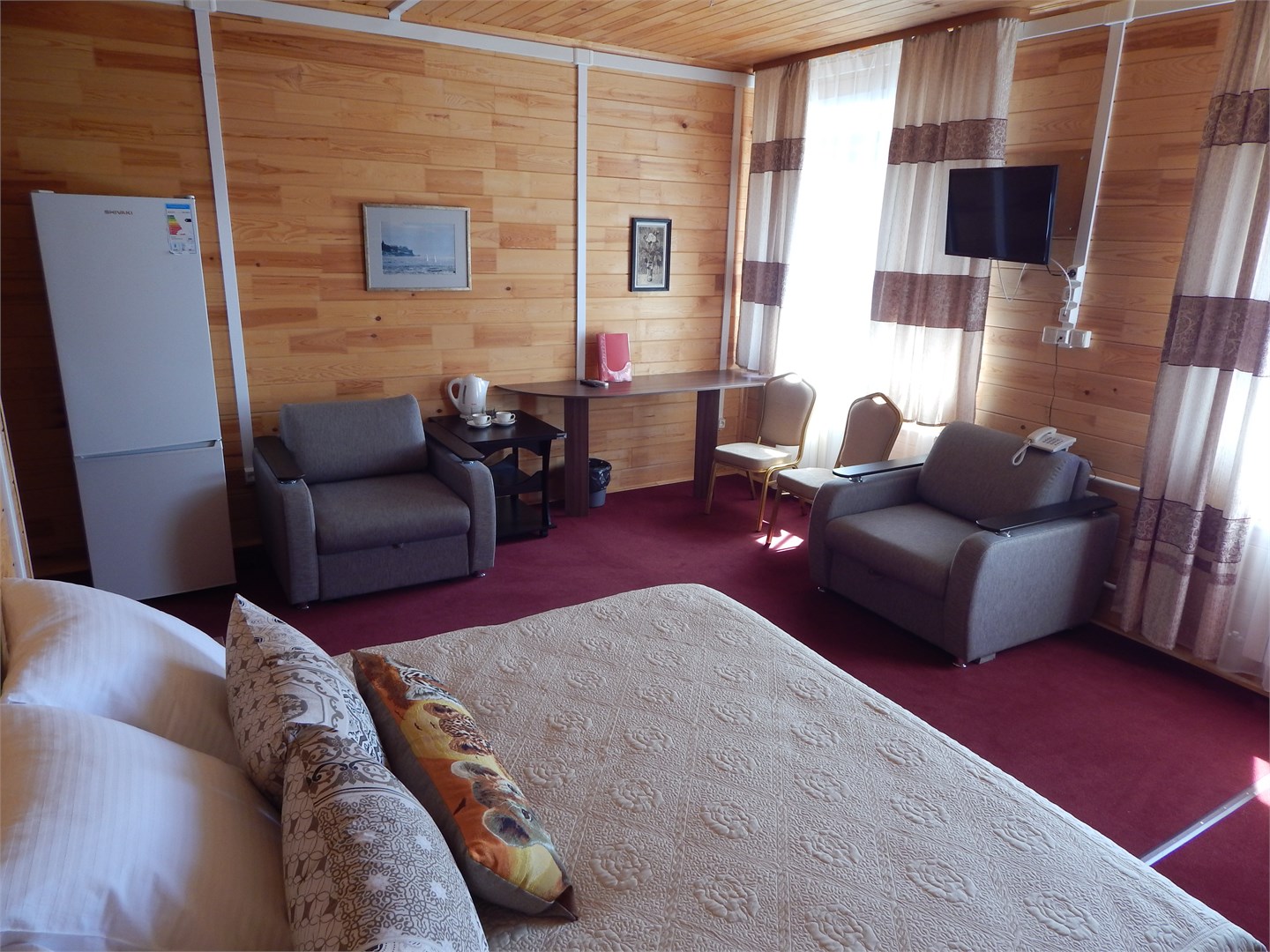 Гостиница представляет собой единый жилой комплекс их 3-этажных домиков, построенный из чистого клееного соснового бруса. Гостей ожидают комфортабельные номера категории Стандарт, Люкс, Студио, а также два пентхауса, в общей сложности готовые принять сорок-пятьдесят человек. Во всех номерах имеются телевизоры, холодильник, санузел с душем или ванной, беспроводной интернет, некоторые оснащены кондиционерами.