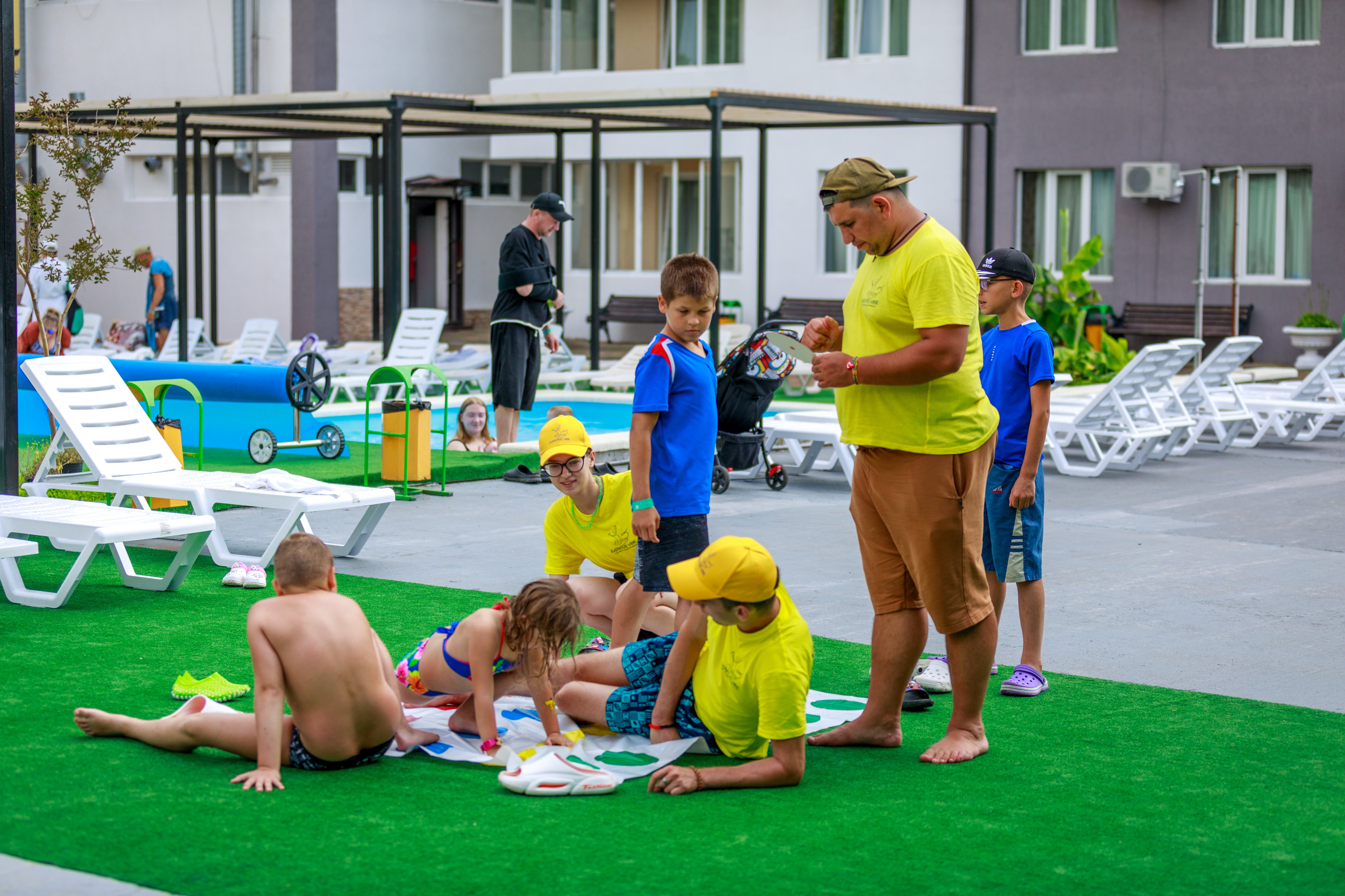 Рядом с рестораном находятся бассейны, где можно освежиться и позагорать под солнцем или отдохнуть в тени на шезлонге. Вечером можно посидеть у фонтана или в беседке с друзьями, всей семьей посмотреть фильм в кинотеатре на территории отеля. Гостям понравится и досуг отеля. Весь сезон здесь будет работать лучшая команда аниматоров. Для детей и взрослых предусмотрены разнообразные развлекательные программы, мастер-классы, тематические вечеринки и конкурсы. И самое главное — отель находится всего в 7–10 минутах неспешной ходьбы от пляжа в Макопсе.