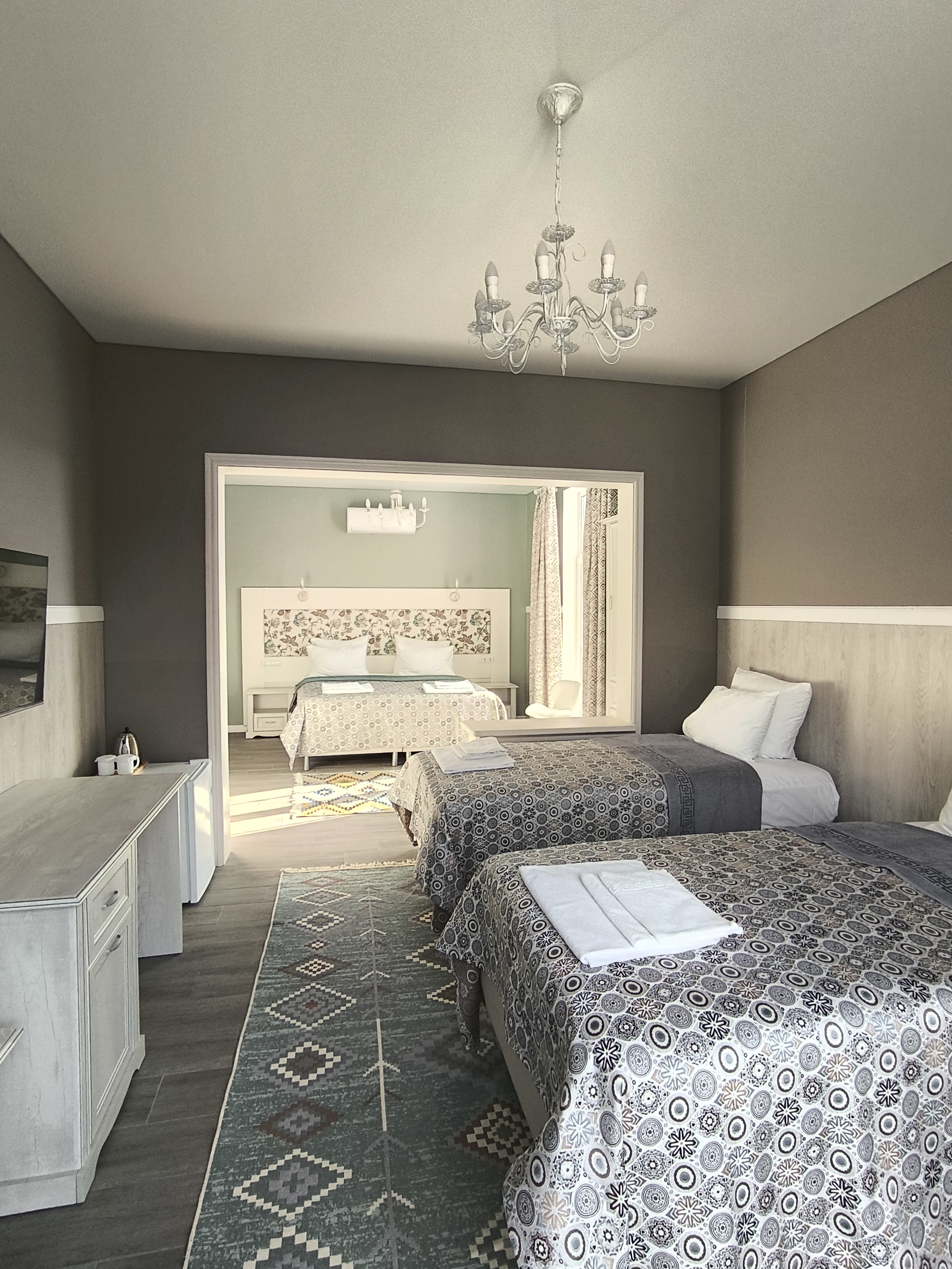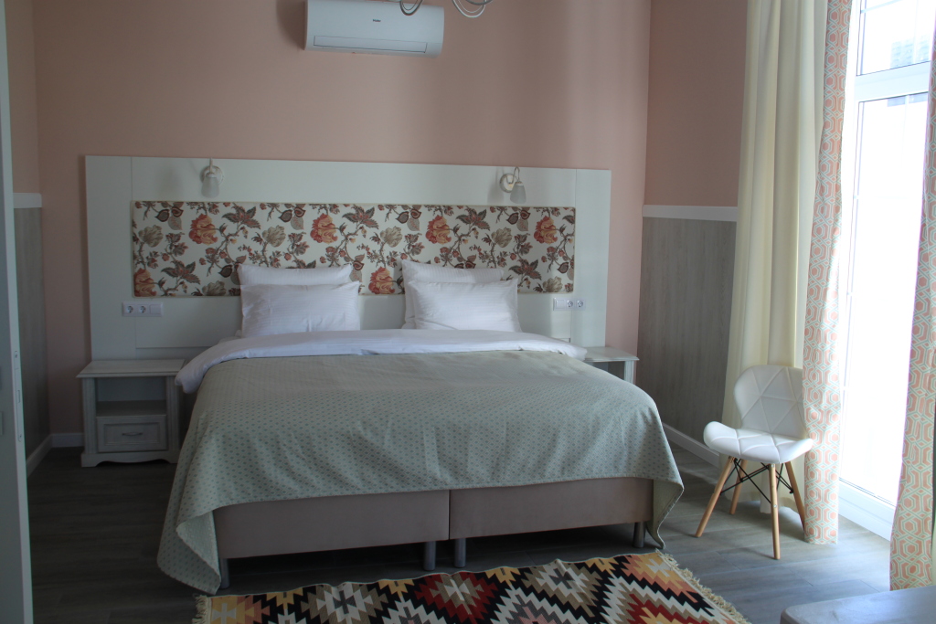 Номера находятся в главном здании гостевого дома. В каждом из них имеется большая двуспальная кровать, матрасы премиум-класса, диван, кресло, шкаф, стол и стул. В гостиной зоне находятся телевизор, холодильник и чайная станция. В каждой комнате есть кондиционер и отопление. Санузел оборудован душевой кабиной, унитазом, биде, двухсекционной раковиной и гигиеническими принадлежностями. Гостям предоставляются одноразовые тапочки и халаты для дополнительного комфорта. В зависимости от этажа в номере может быть балкон или терраса с мягкой мебелью для утреннего и вечернего отдыха.