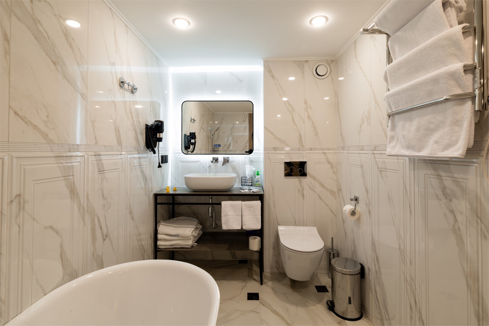 с душем: ; тапочки: ; туалетные принадлежности: ; фен: ; халат: ;