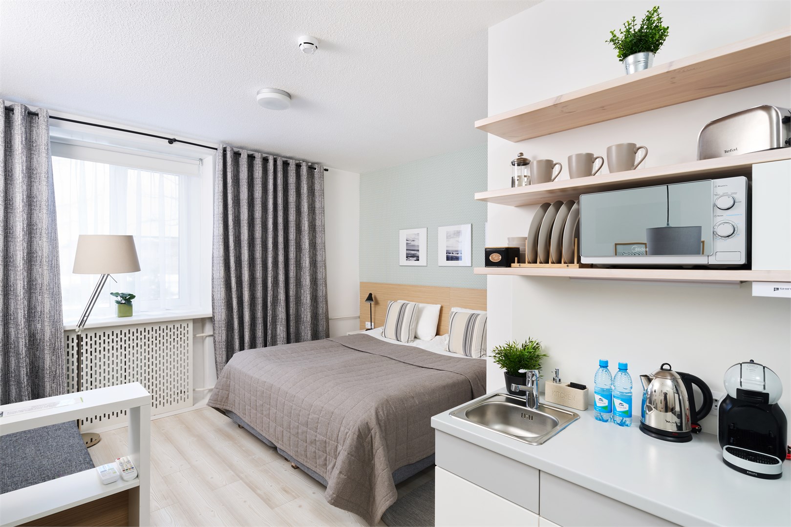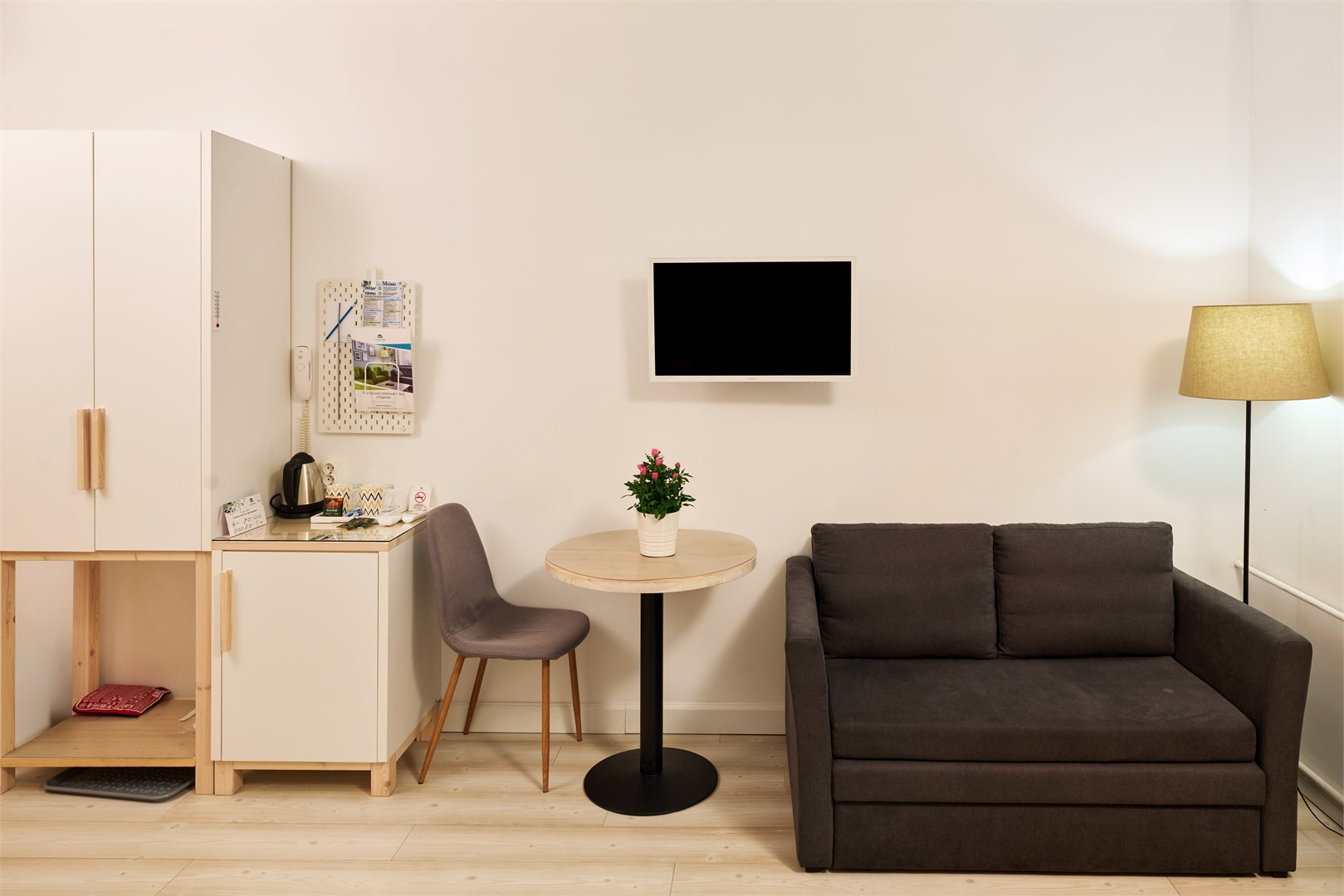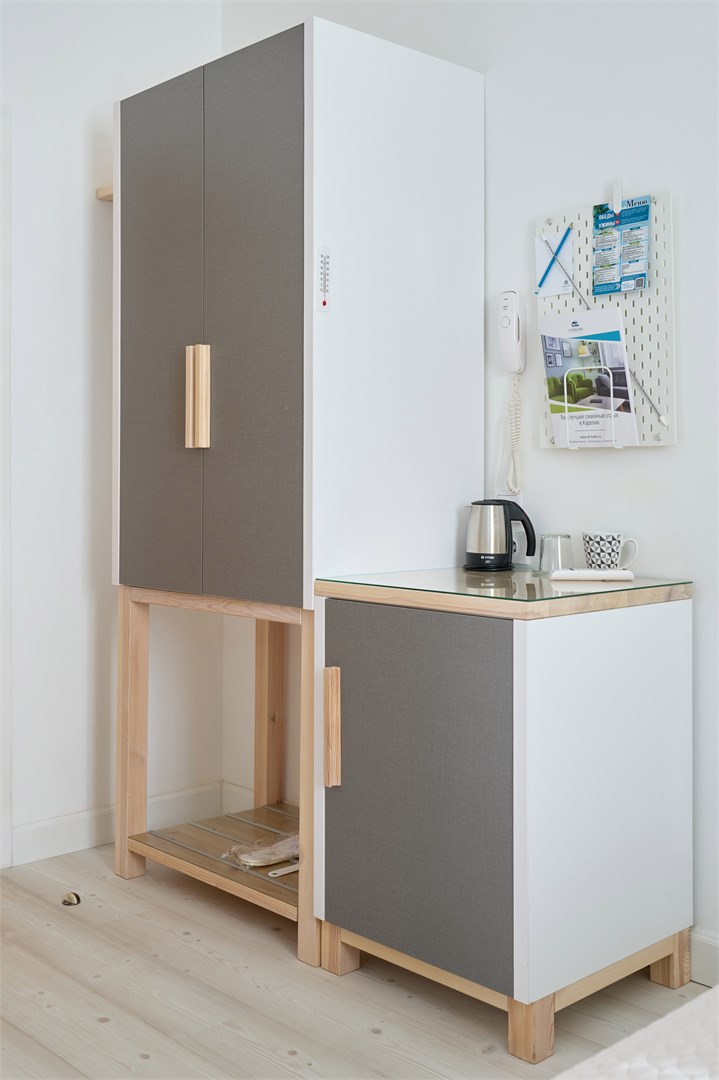 кондиционер: ; кофемашина: ; микроволновая печь: тостер; мини-холодильник: ; набор посуды: ; плита индукционная: ; телевизор ЖК: ; телефон: ; чайный набор посуды: ; электрочайник: ;